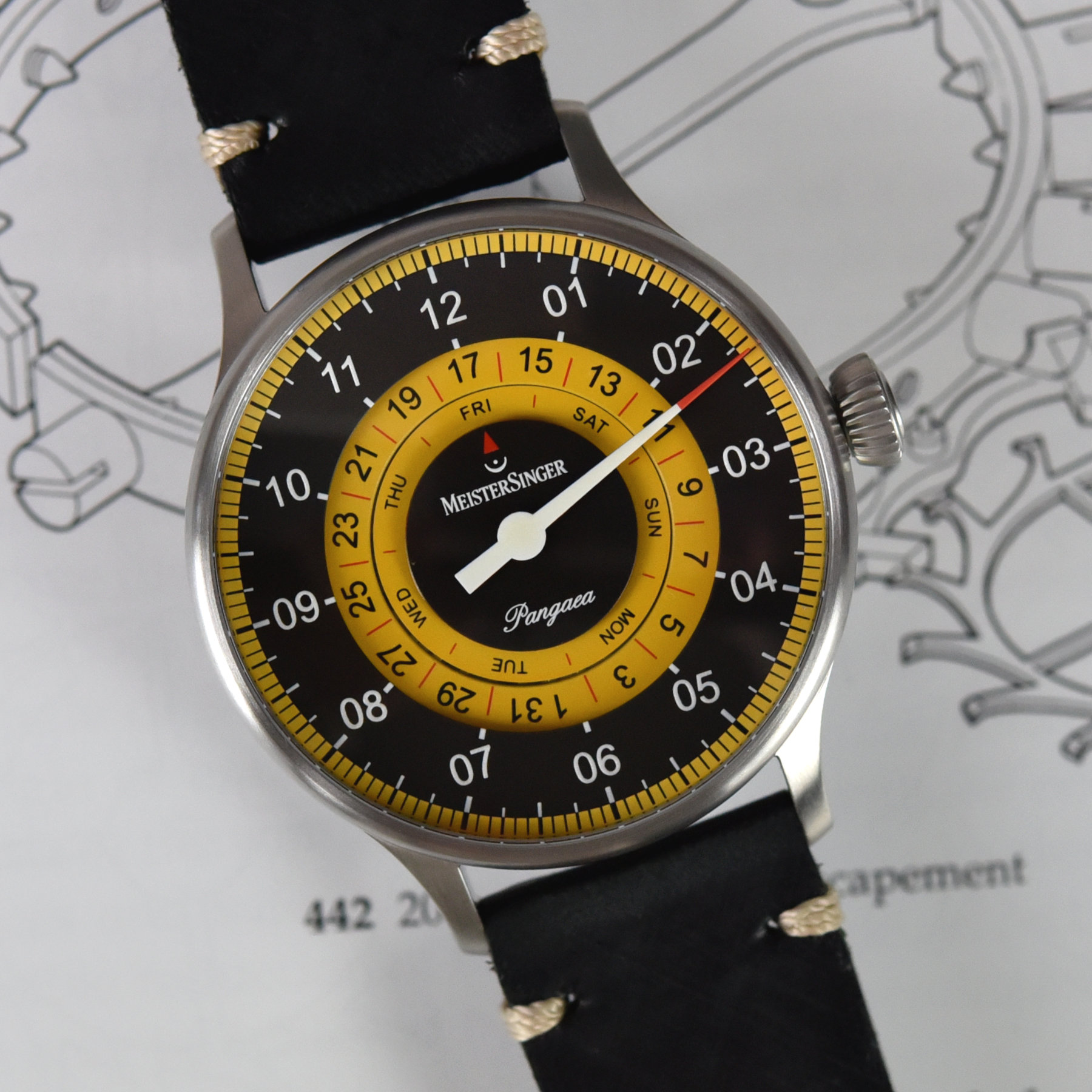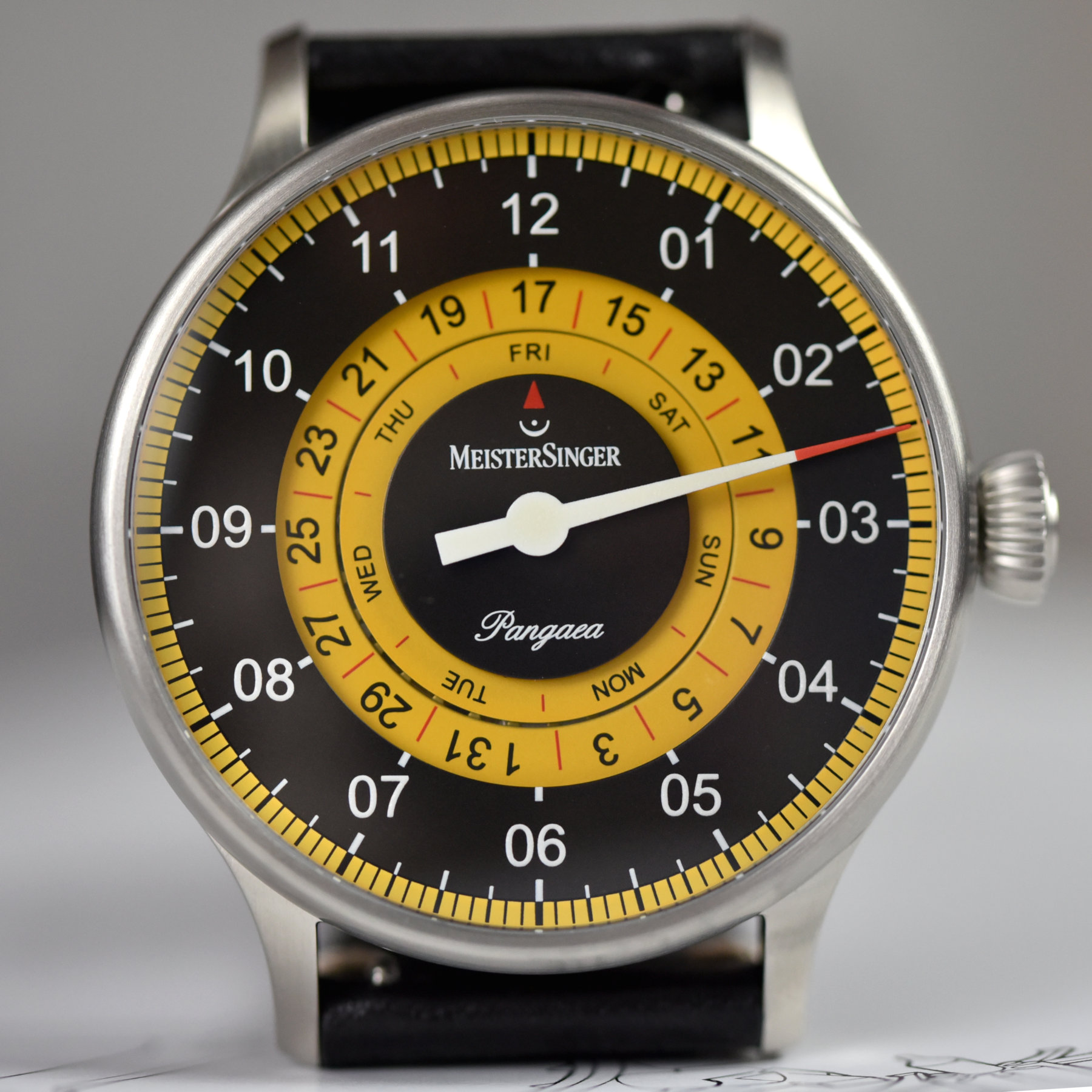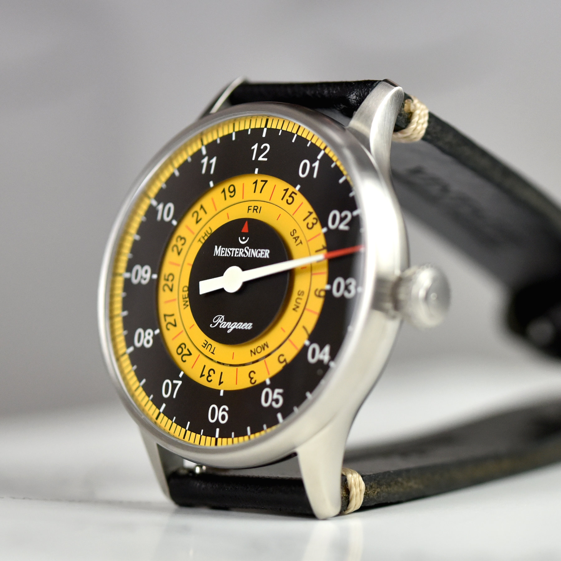 One-handed watches go back centuries and were derived from tower clocks that used to rely on a single hand for a very long time. The reason for this is quite simple, back then, the need for precision timekeeping simply didn’t exist. Secondly, the very first timing devices were simple sundials, where a peg’s shadow cast around some sort of scale showed the day’s progression. This archaic time-telling system is the philosophy behind MeisterSinger and its very well-known one-handed watches. The idea to have time passing by at a seemingly more leisurely pace is quite refreshing in today’s rushed society, to be honest. But even though it feels very “now”, MeisterSinger has been doing this for over 20 years and has created plenty of intriguing watches around the concept. One of which is the clever use of exposed discs for additional complications, such as this new MeisteSinger Pangaea Day Date limited edition in provocative black & yellow.