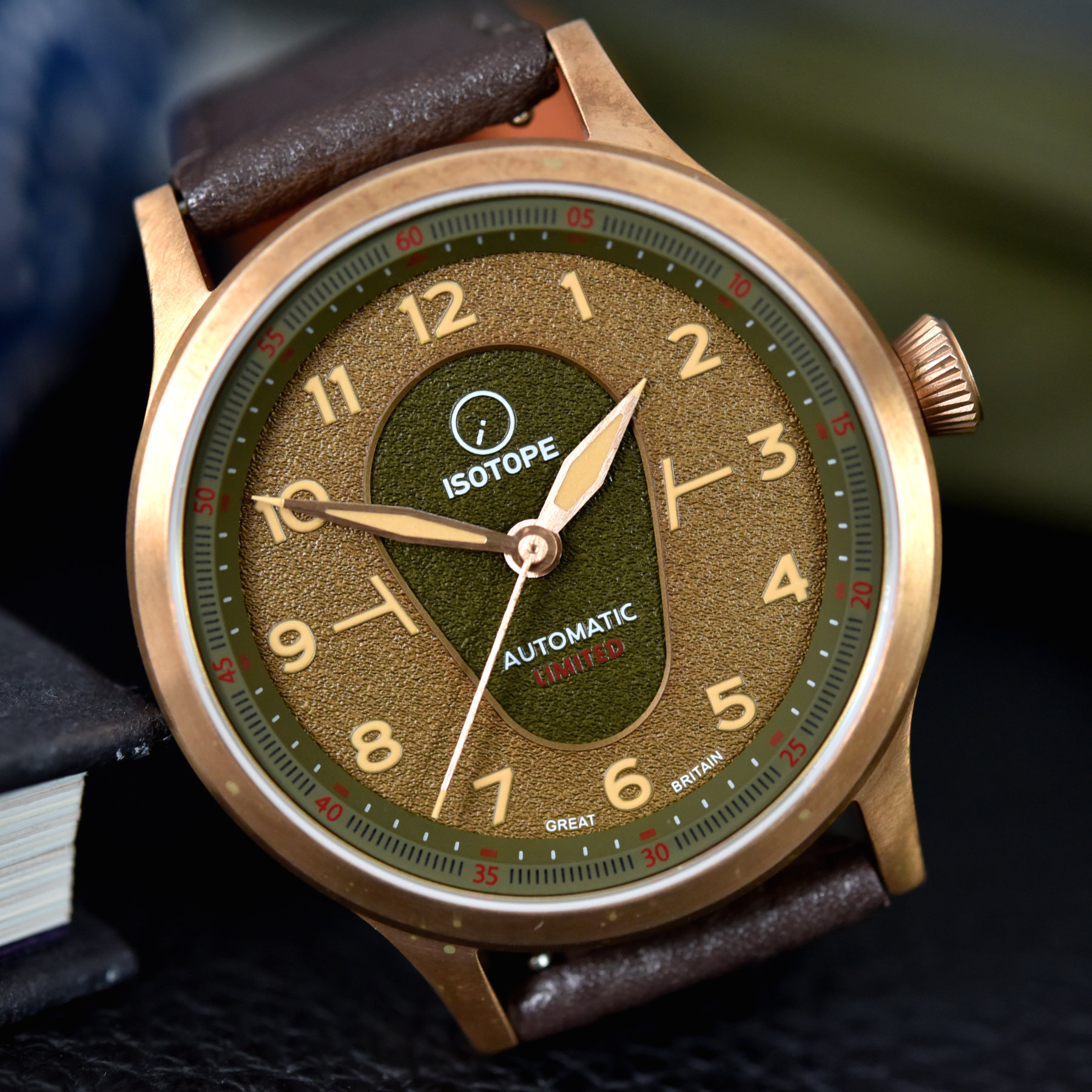 With the Old Radium Bronze collection, the small independent watchmaking company Isotope pays homage to the heroic airmen and -women who fought in the Second World War. It captures the classical elements of a pilot’s watch and mixes them with Isotope’s own signature style of fun design cues, colours and textures. This original take on the concept of what a pilot’s watch should/could be, results in an unusual yet charming combination of elements that packs loads of character. It falls in line with watches like the GMT 0° Terra Maris or Hydrium, but the Old Radium takes a turn towards the more Steampunk-esque end of the spectrum. With that in mind, we’ll take you through the new Isotope Old Radium Bronze Tobacco, the most recent addition to the family.
