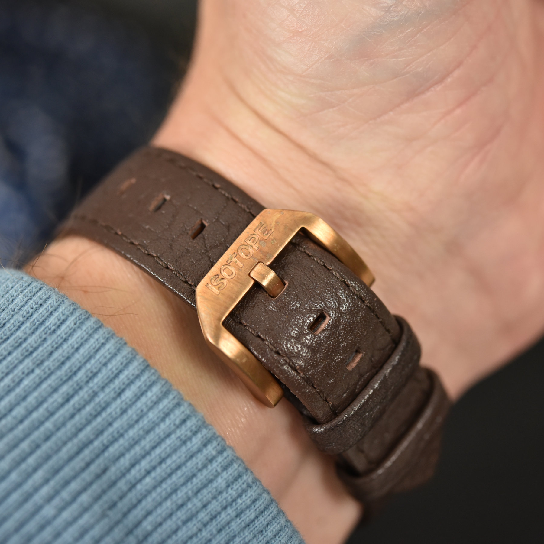 The case for the Isotope Old Radium Bronze Tobacco uses the same CuSn8 bronze alloy as the “regular” Old Radium Bronze trio. This is a mix of copper, tin and other materials and develops a nice patina over time. During the few weeks I had with the watch, I could already see some traces of the patina building, as you can probably tell from the images. If you want, however, you can easily clean it up again and bring it back to a factory-fresh look (minus any potential scratches and dings you might have picked up wearing it). The case measures a very comfortable 40mm across and 10.1mm in height, with a sturdy diamond-shaped crown on the right-hand side. The lug-to-lug size is very doable for most people as well, at 47mm in length. The entire case is brushed, which fits with either the pilot’s watch theme or the choice for bronze. Both sides of the watch are covered by a sapphire crystal.