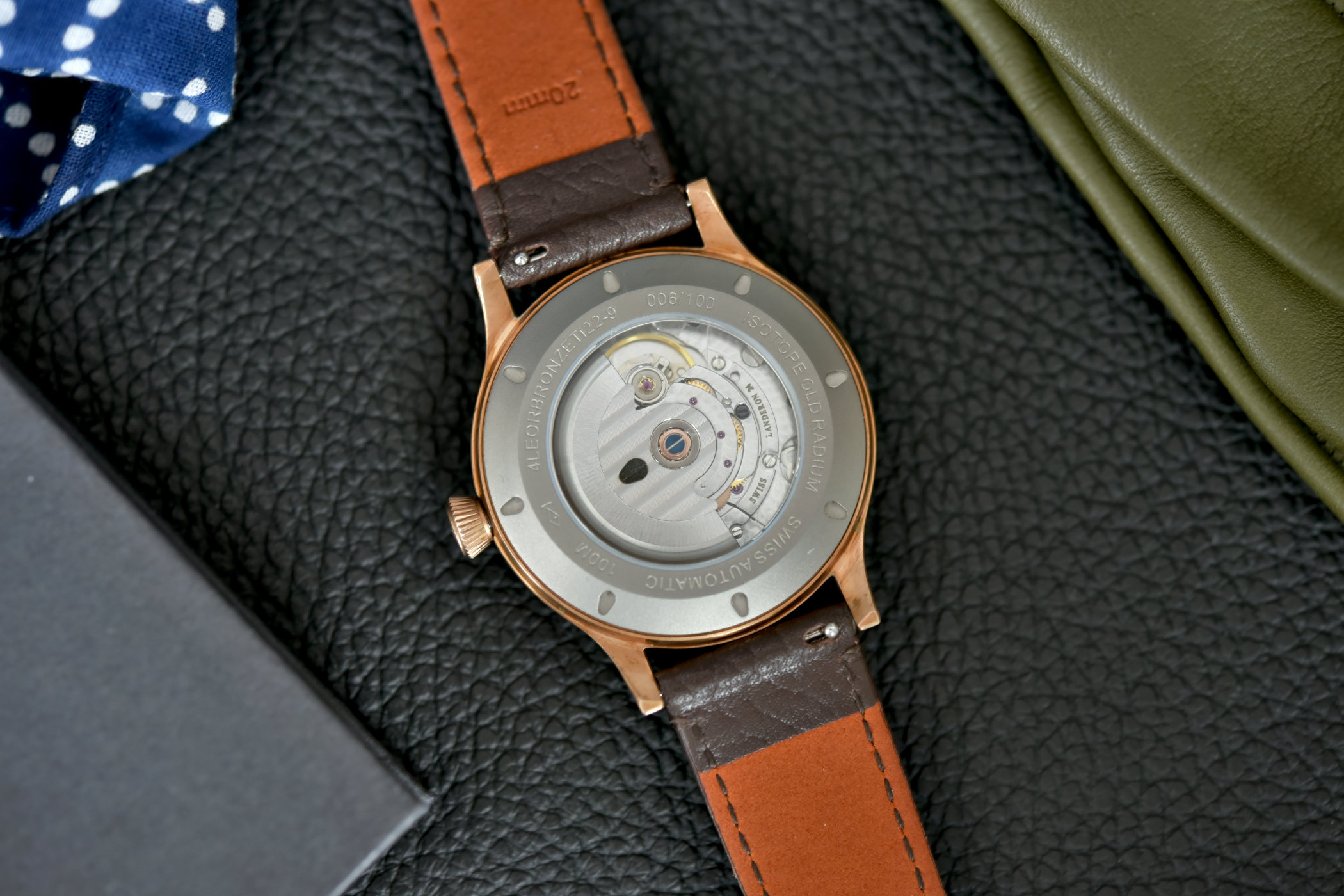The movement inside the Isotope Old Radium is a Swiss-made Landeron Automatic (essentially an ETA alternative), which we don’t see very often. During my time with the watch, it performed perfectly fine. It’s running at a rate of 28,800vph, uses 25 jewels and provides 40 hours of power reserve when fully wound. It’s finished with blued screws, perlage and Côtes de Genève, as you can see through the caseback. This caseback is done in titanium, so your wrist doesn’t come into direct contact with the bronze case. This slows down the tarnishing of the case a bit and also prevents a nasty green stain on your skin.