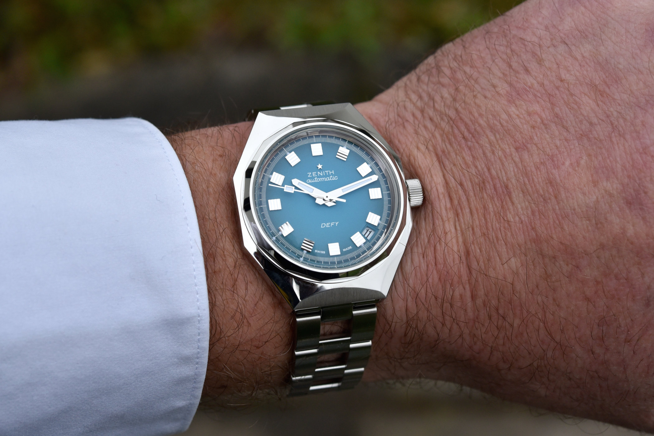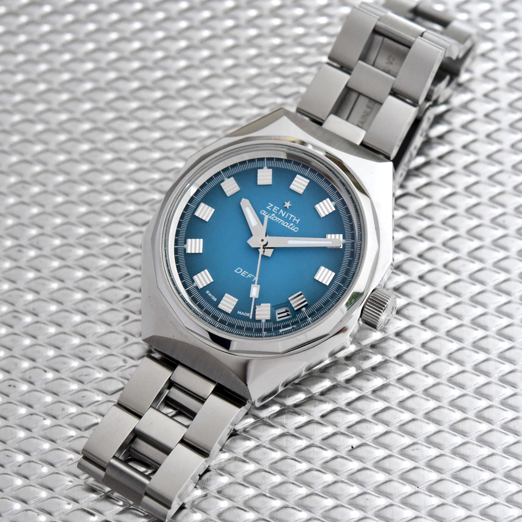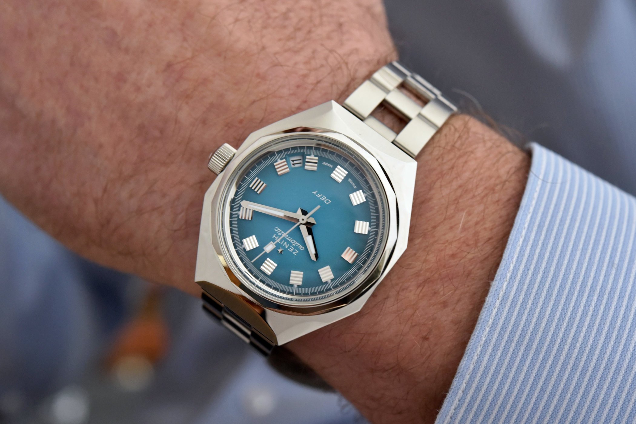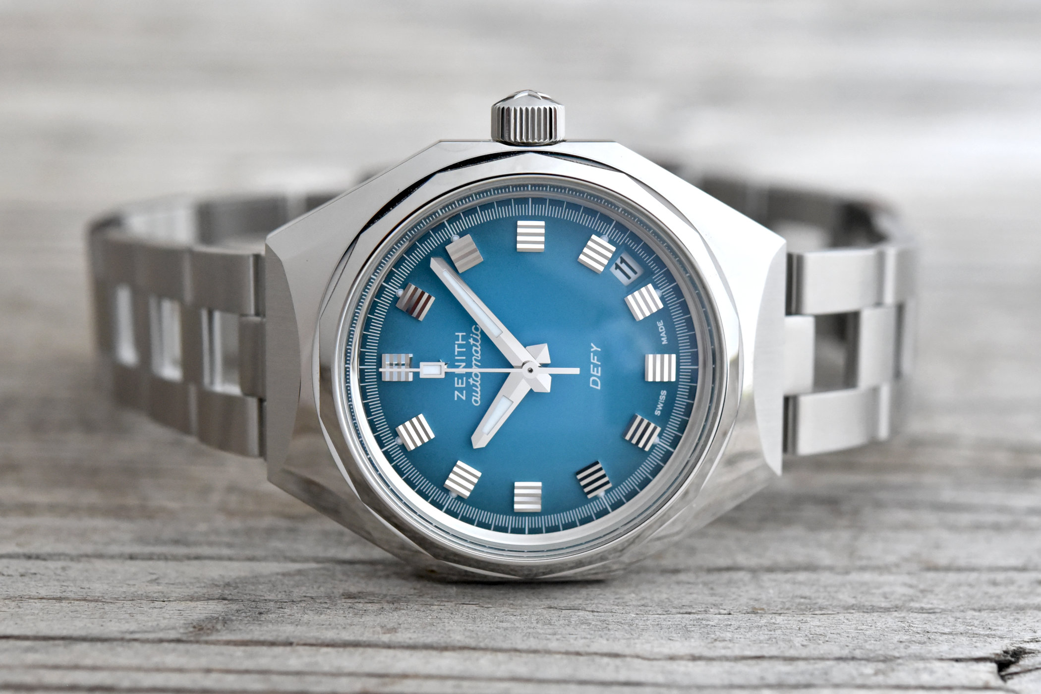 Following the aforementioned gradient brown and red dials Zenith introduced previously, this gradient turquoise blue execution is a colour found in the original Defy A3690 as well (see above). The polished ridges highlight the unique shape of the applied faceted hour markers. Discreet dots of luminous material look exactly the same as they did back in the Defy’s early days, which also goes for the printed white track on the outside edge of the dial. The hands are no exception, and despite the fact it’s always a topic for debate, the placement of the date window between the 4th and 5th-hour marker is also accurate.