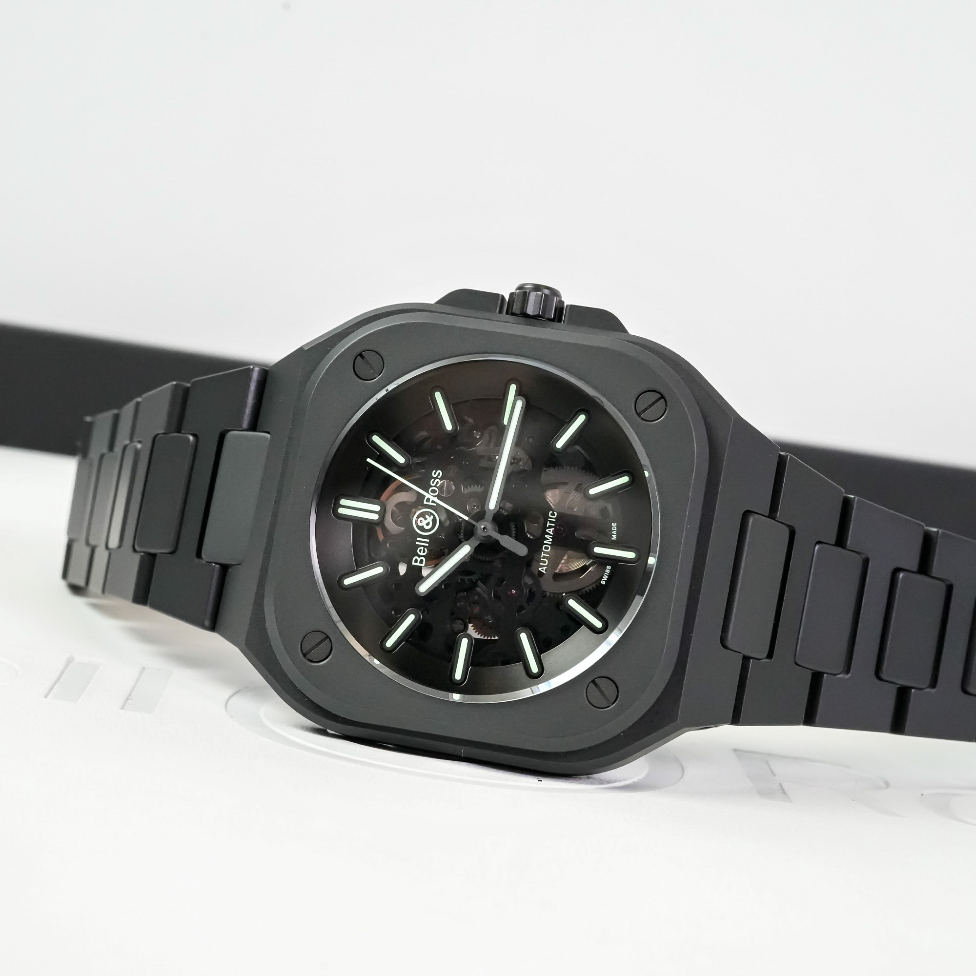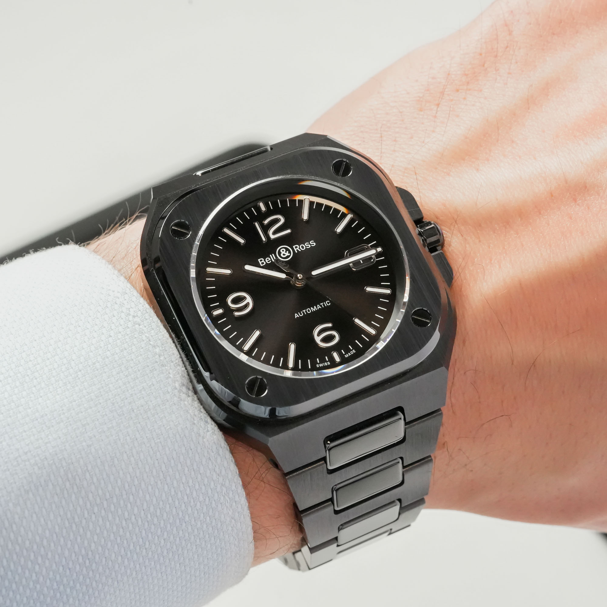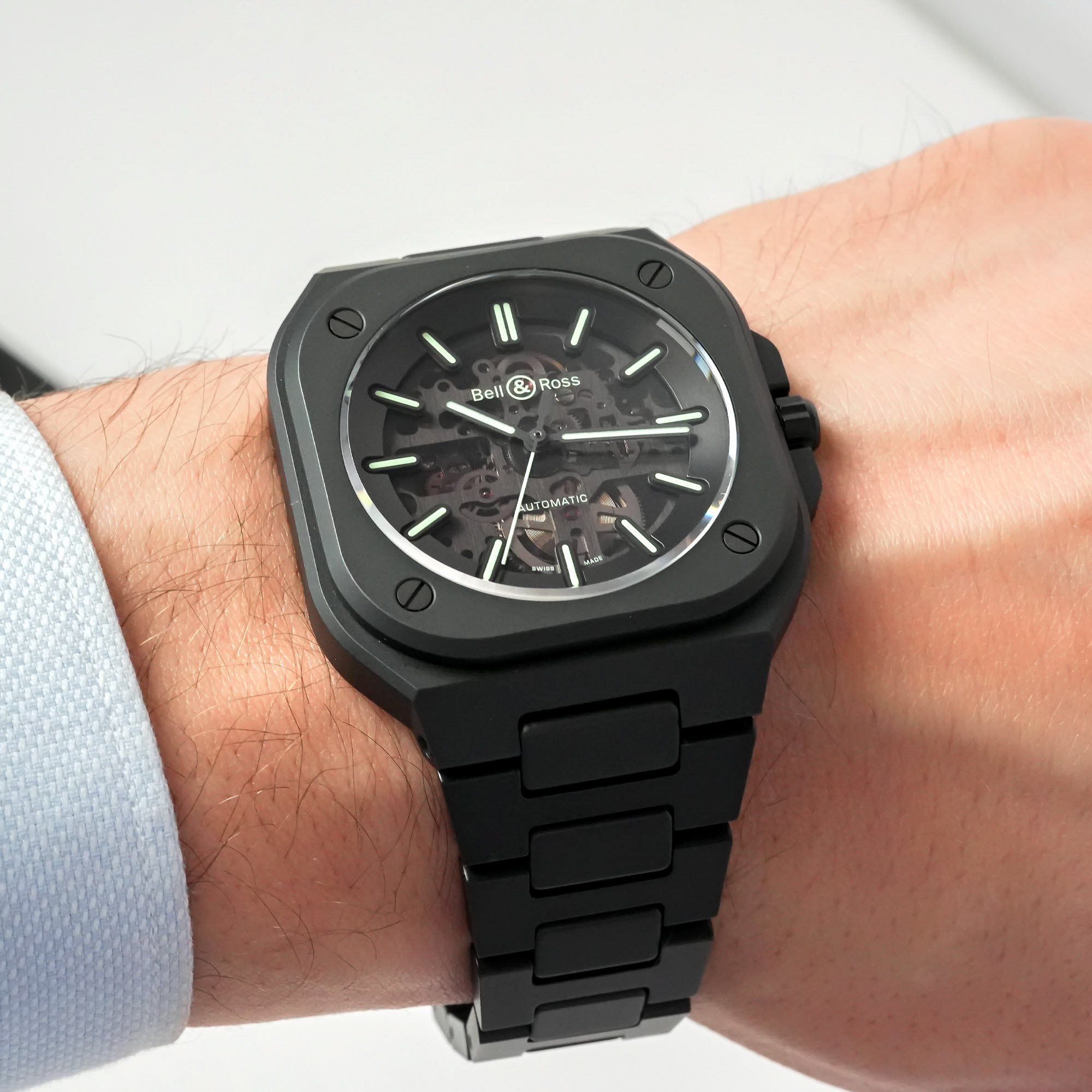 Apart from its superlative properties, black ceramic endows the BR 05 with a darker, sleeker and stealthier image. As everybody knows, black is slimming and when used in watchmaking, visually attenuates bulk. However, to maintain the watch’s proportions, creative director Bruno Belamich decided to increase the diameter of the black ceramic BR 05 models from 40mm to 41mm. Coupled with a thickness of 11.2mm, the slight increase in diameter and thickness is practically imperceptible. When viewed from the side, you can appreciate the flat, stacked architecture of the watch with its iconic square base and round opening.