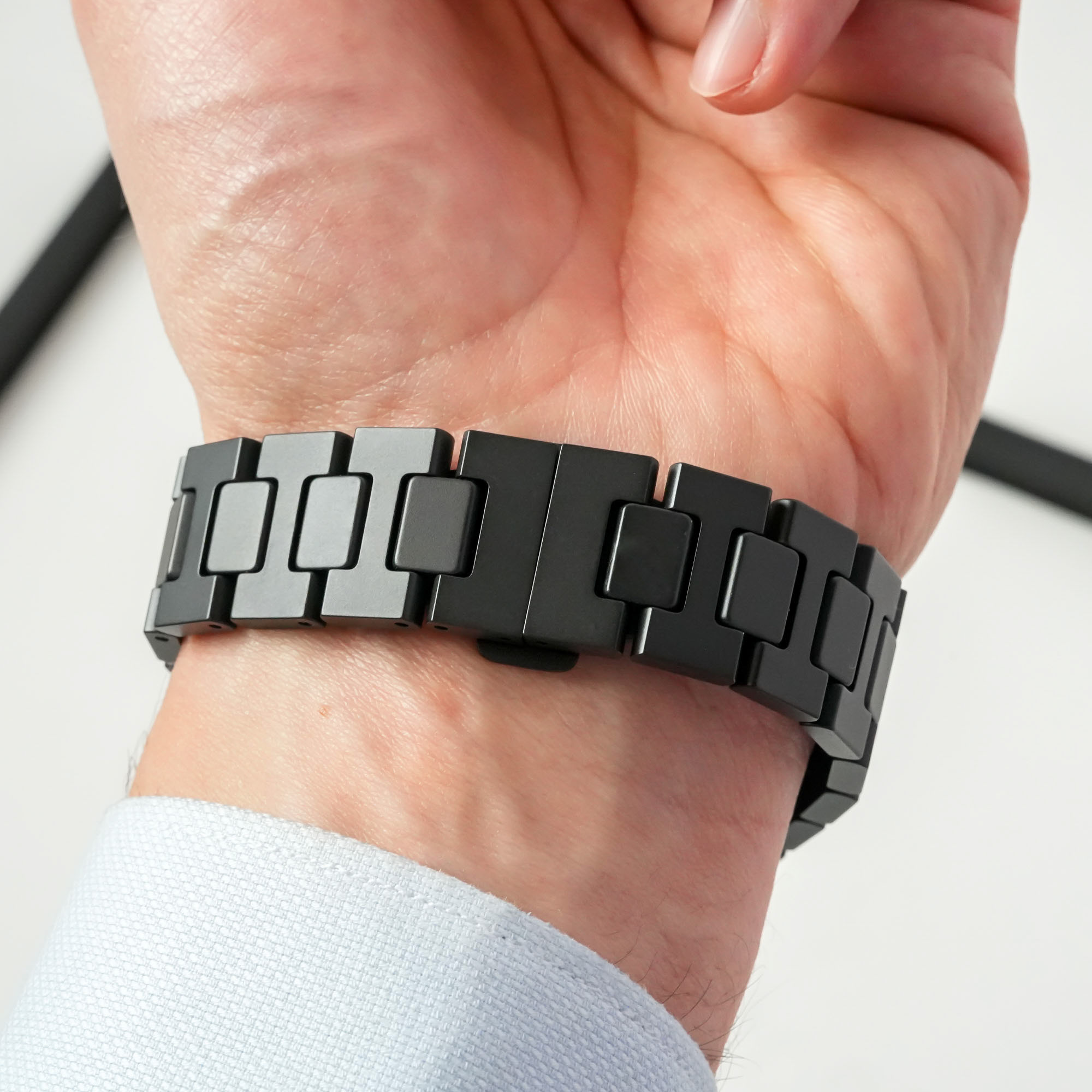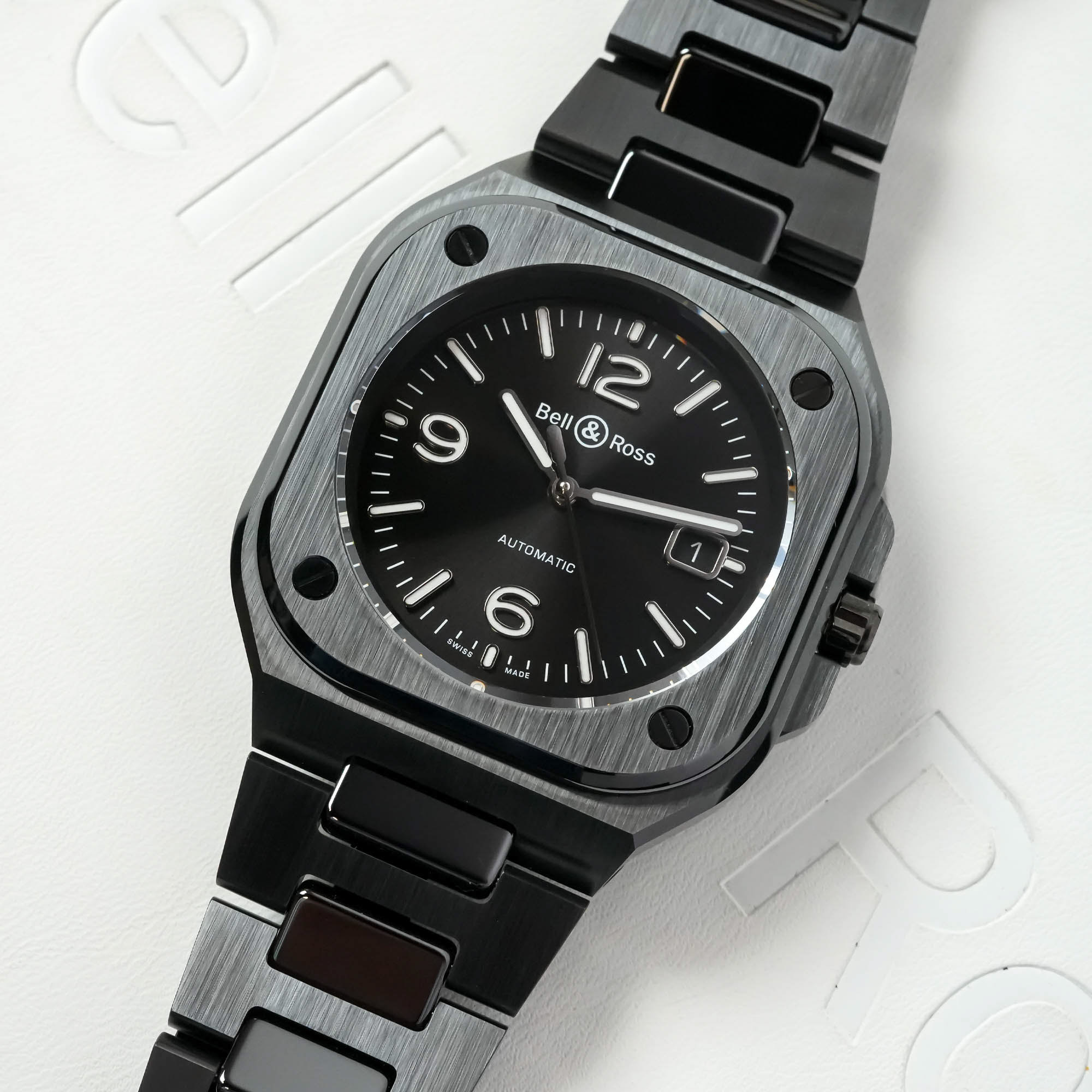 The BR 05 Black Ceramic with a closed dial and a date window at 3 o’clock and the BR 05 Skeleton Black Ceramic share the same case finishings. The surface of the case and rounded square bezel feature a strong vertical brushed decoration, extending all the way to the links of the bracelet. Even the crown guards are vertically brushed. In contrast, the bevels of the case and bezel are polished, matching the polished central link of the bracelet and the four aligned screws in the bezel. Although polished ceramic will never produce the vivid reflections of polished steel, its glossy surface does interact with ambience light, producing interesting plays of shadow and light.
