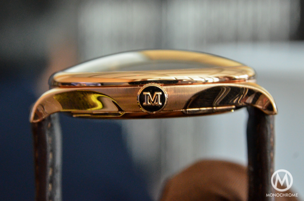 The red gold ‘fumé’ version (darker towards the outside of the dial) emphasizes the domed construction. It is also available in ardoise and argenté, always in a red gold case, and all three versions have a sunday brushed dial that gives some nice reflections.