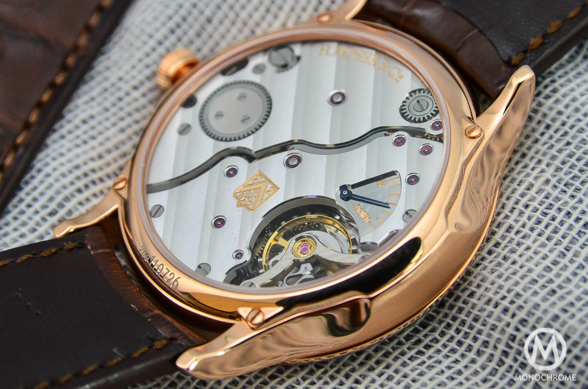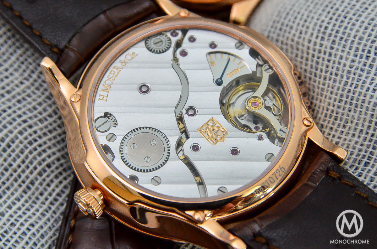 This 32mm movement fits perfectly in the 39mm of the Venturer – we always appreciable to see a movement that fills the case – and is made with the H. Moser & Cie. standards, meaning that the bridges are adorned with Moser striping, and feature hand-beveled and hand-polished bridges. In order to keep the watch thin enough, the movement remains at a very reasonable 4.4mm in height. The back of the watch, with see-through case back, reveals the 3 days power reserve indicator, and the aforementioned Escapement module.