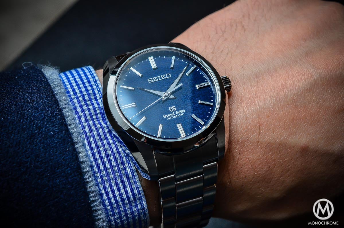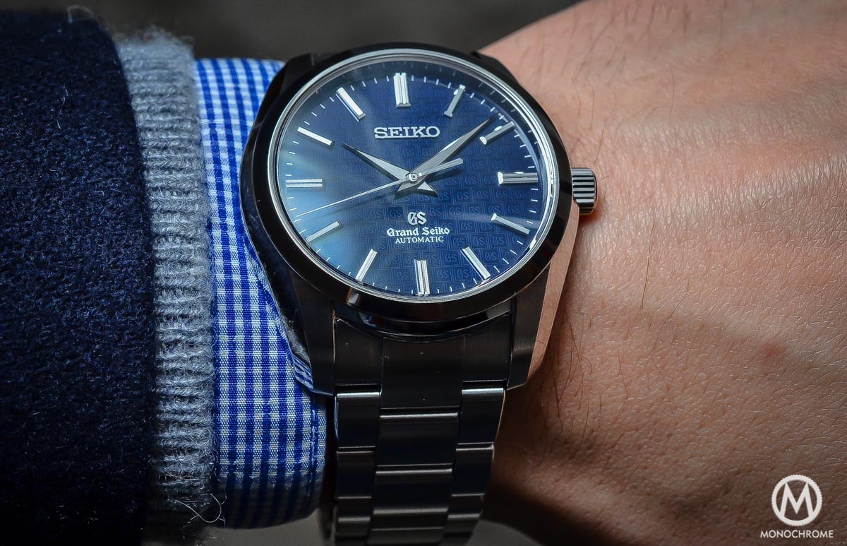 This new 42mm case is available with 3 different dials: a silver one (Grand Seiko SBGR099), a black one (Grand Seiko SBGR101), both non-limited and a 500-piece limited edition with a specific blue dial, the present Grand Seiko SBGR097. While the regular editions show a plain dial with a simple sunburst pattern, the Grand Seiko SBGR097 features a repeating pattern that depicts the ‘GS’ logo (for Grand Seiko). At first quite busy, this pattern becomes quite discreet once the wrist and just pops out when the light comes directly on it (our photos really emphasize the geometric pattern). We found back the typical Grand Seiko dauphine hands – and to be honest, they are certainly some of the nicest hands ever, with a large polished chamfer and a brushed finish on flat surfaces. The execution of the hands is superb, and this also goes for the indexes, with the exact same finish. This demonstrates the Japanese devotion to details.
