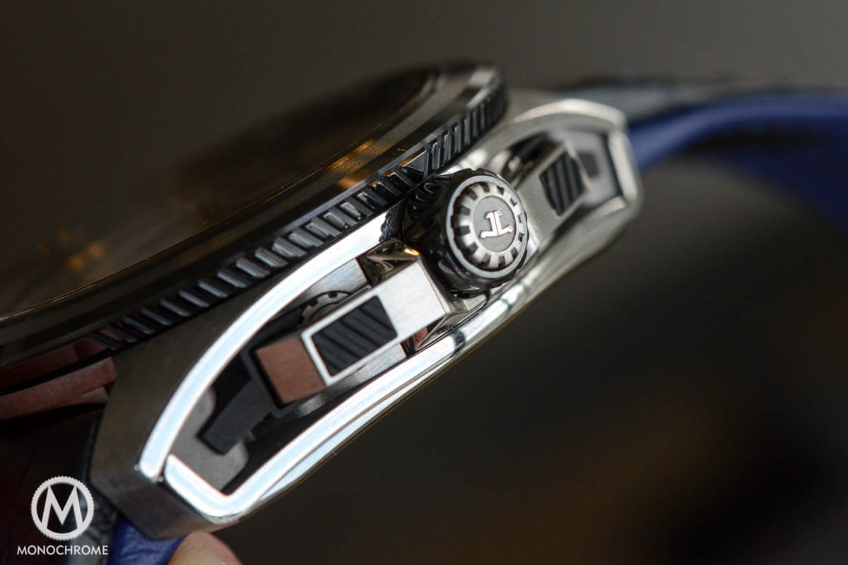 Integrated into the crown is a selector that allows you to switch between several functions. It serves to adjust functions without having to pull out the crown. Not an entirely new idea – Grönefeld and Richard Mille also use something alike – however it’s perfect for this sports watch. The crown-push system eliminates the need to pull the crown and potentially compromise the water resistance of the watch. Once a specific function is selected the adjustments can be made by turning the crown.