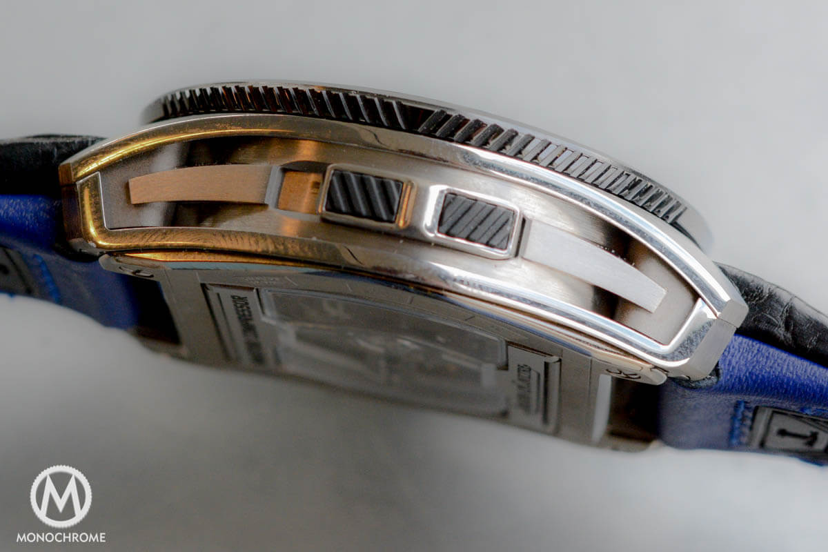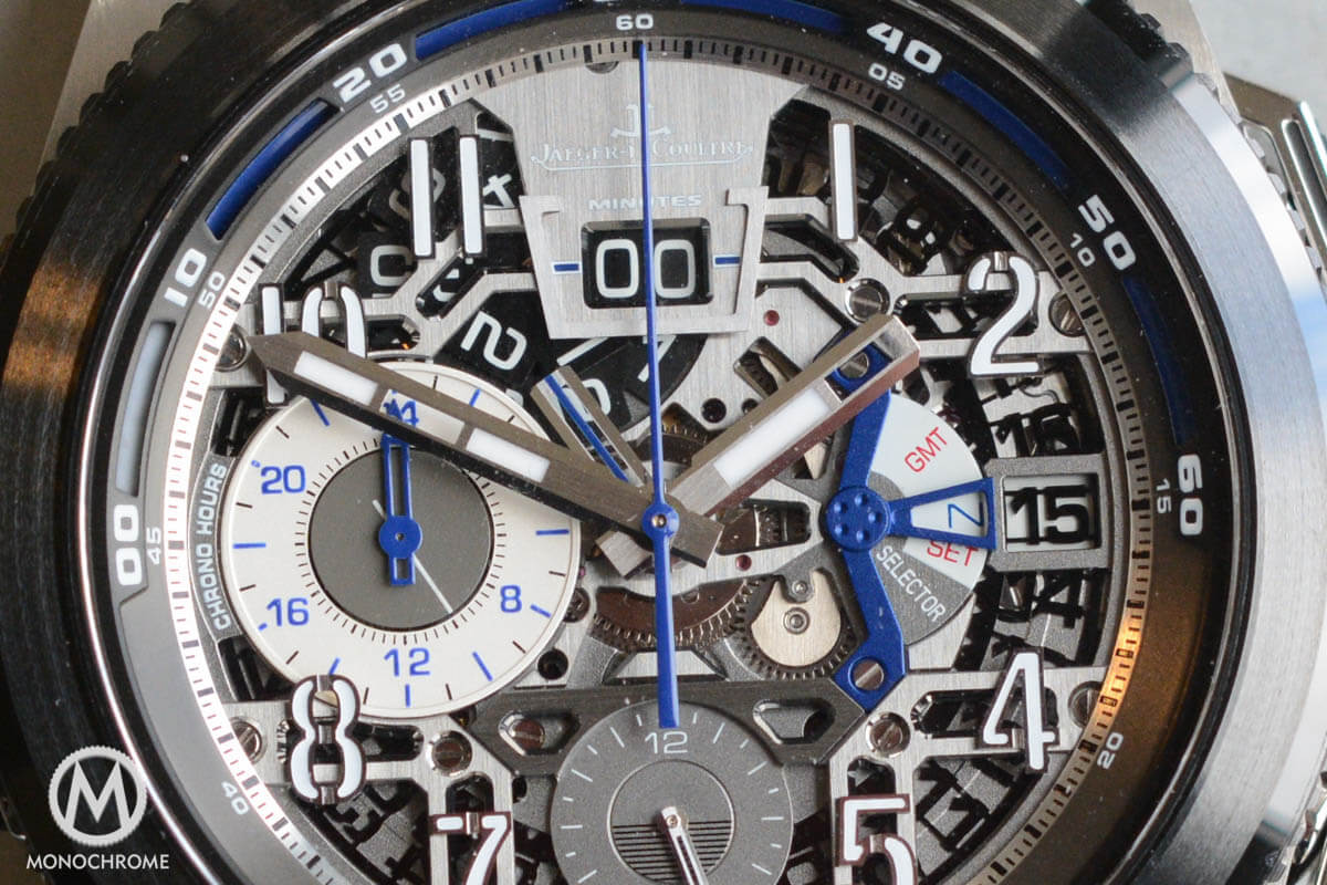 When JLC introduced the Extreme LAB it was a showcase of technical prowess, as it would not require any lubrication over its lifetime. And there’s much more than “just” that open-worked movement that doesn’t need lubricating oils. Let’s have a look at a few of its novel functions and features, like the crown-integrated function selector (which handles very smoothly), a patented digital counter to indicate the chronograph jumping minutes, a manual stop seconds device, a radial power-reserve indication and a GMT function enabling at-a-glance readings, and more.