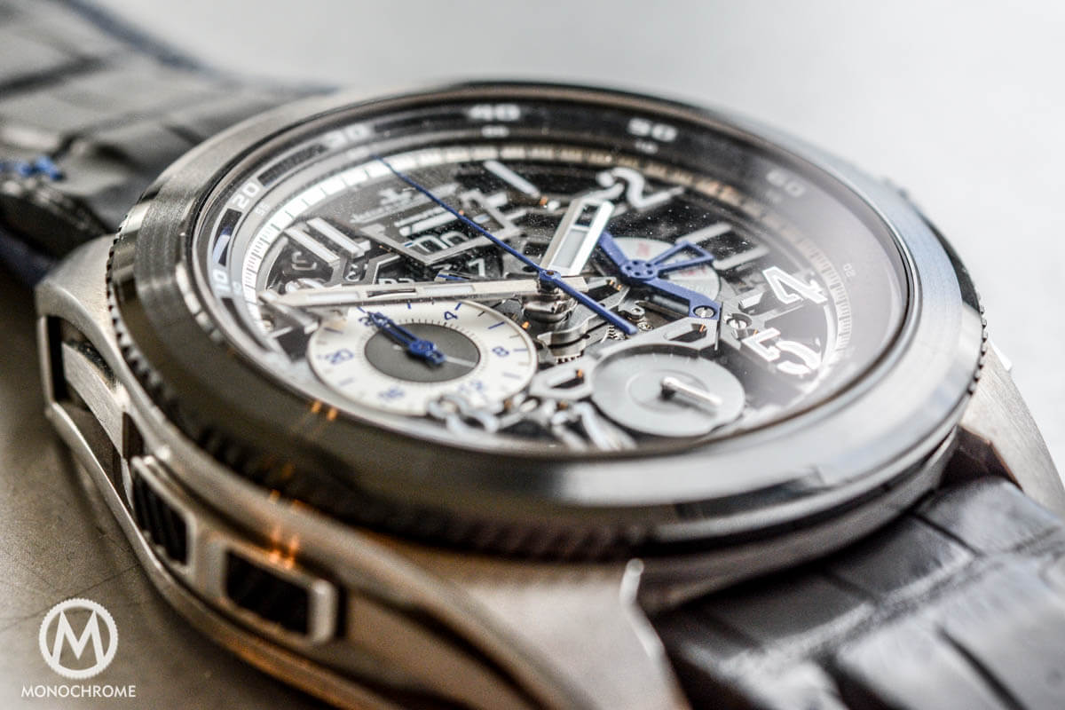 How often do you actually use your chronograph? Most people who own one hardly do, although it’s always fun to time cooking the spaghetti, waiting for the traffic light to turn to green, or how long your better half can stay on the phone with her mom. The thing that ‘annoys’ me most about chronographs, is that it is actually not easy to read the elapsed time. There’s one small sub dial that indicates the elapsed minutes and I find it difficult to read it. Maybe it’s my age, and/or a need for reading glasses? However with this JLC Extreme LAB 2, then no worries, because reading the elapsed minutes is very easy. You’ll be able to see the elapsed minutes at-a-glance, and the large double-digit minute counter is situated at 12 o’clock.