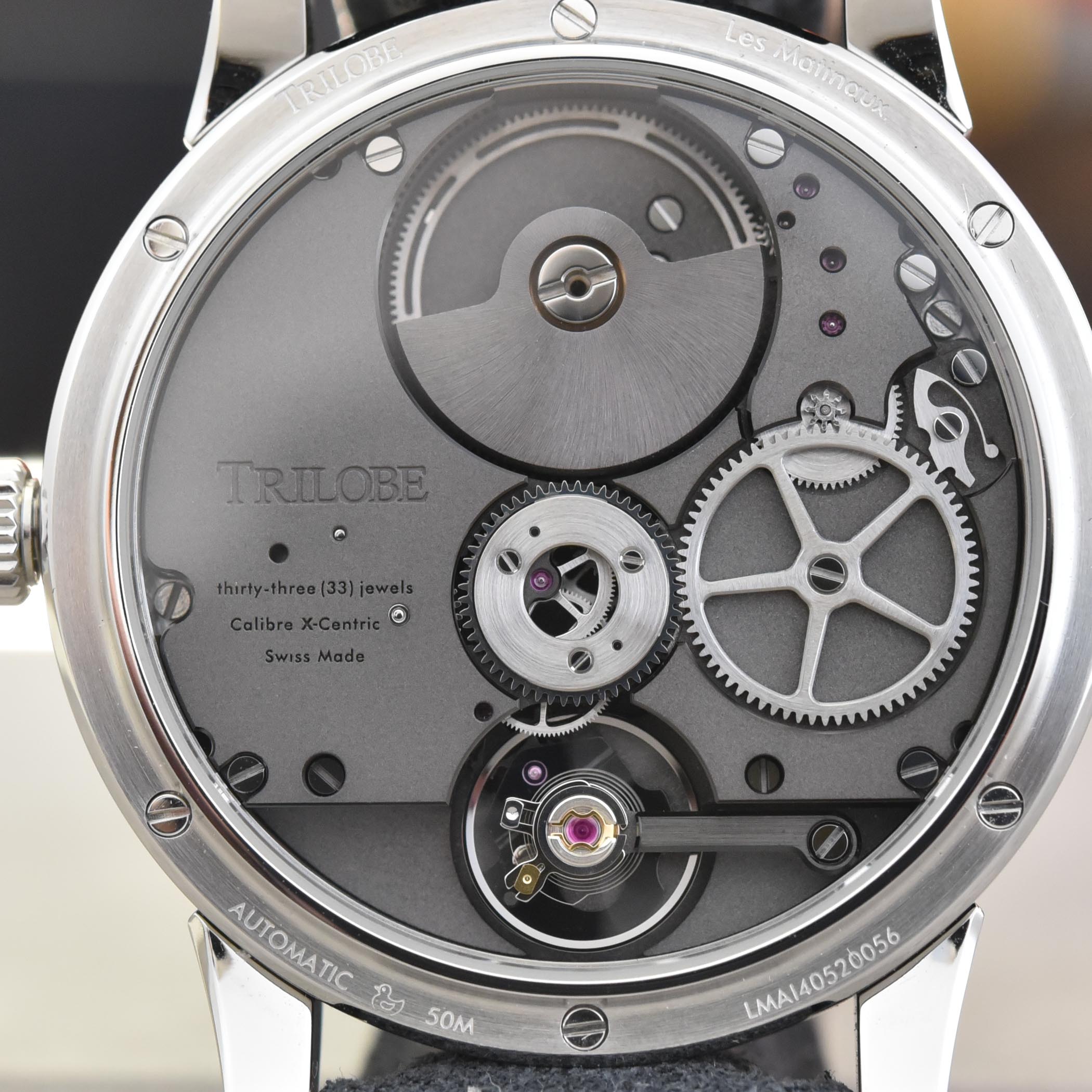 The first thing to catch your eye with the Trilobe Les Matinaux (The Morning Ones in French, a reference to a poem collection by René Char) is its unconventional time display. The watch doesn’t feature traditional hands. Time is indicated by three stationary pointers in the shape of the brand’s trefoil logo on 3 contrasting discs rotating counterclockwise with the hours at the periphery and then, off-centred minutes and seconds. The kinetic architecture of this original take on the wandering time display provides an original and captivating way to read time. The play of lights on the sleek sunray finish dial paired with polished discs are eye-catching. The rotating rosace second disc brings an architectural opening into the movement.