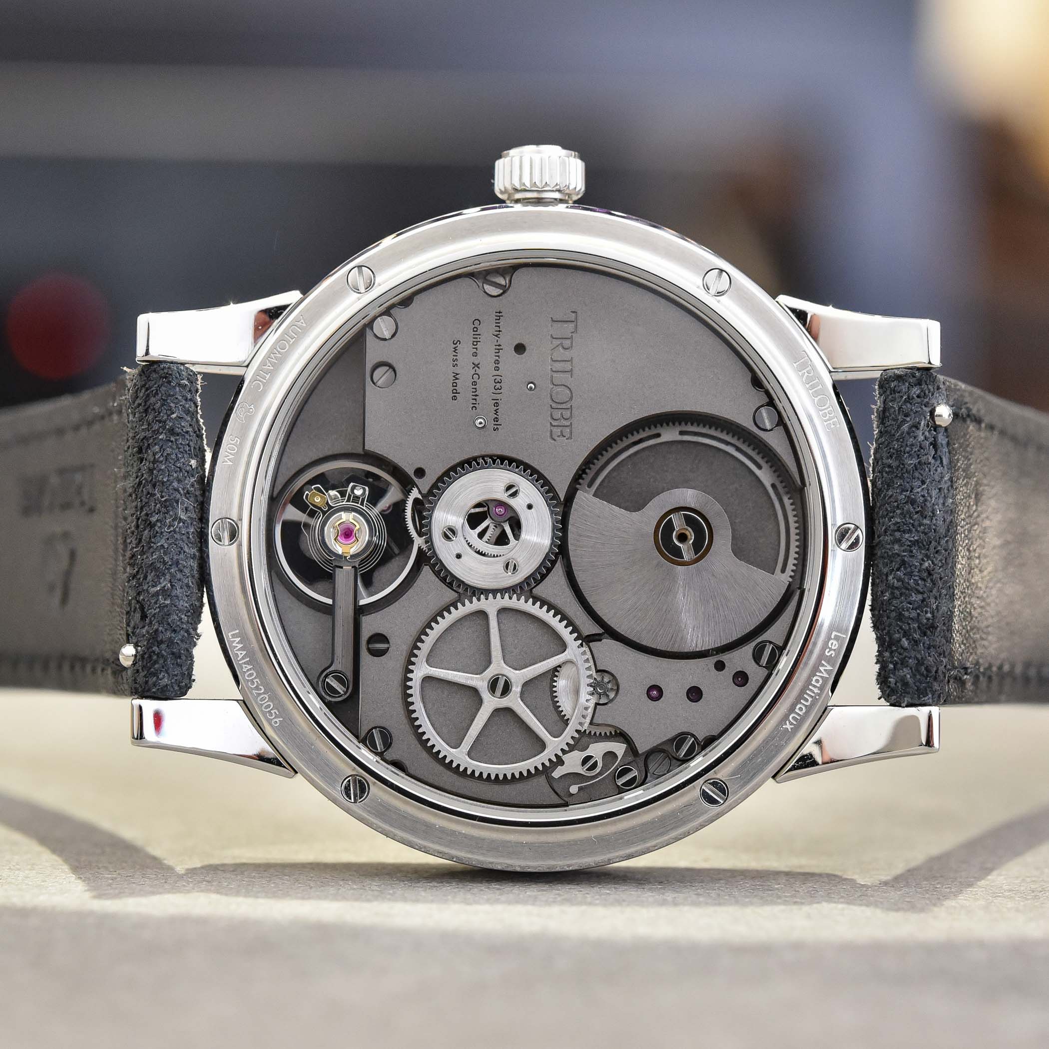 Flip the Trilobe Les Matinaux over and the exhibition caseback offers an unimpeded view of the proprietary micro-rotor movement powering the original time indication. After involving Chronode’s Jean-François Mojon in the conceptualization of the display, Trilobe entrusted Le Cercle des Horlogers – one of the rising high-end mechanical movement makers, the motorist of several independent watchmakers and a company working behind the scenes for several big names in the industry – with the development and manufacturing of the movement. At 35.2mm in diameter, it perfectly befits the case dimensions. The sober, modern and beautifully executed finishes are a great match with the spirit of the product. Running at 4Hz, its power reserve is of 48 hours when fully wound.