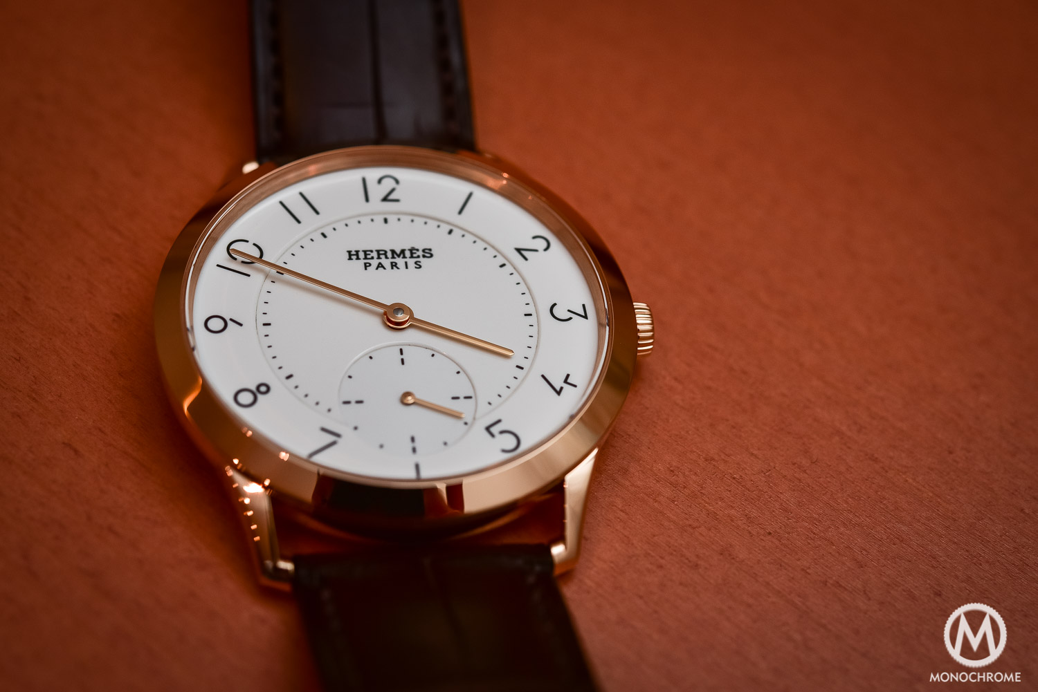 The Slim d’Hermès émail grand feu is worn on a matt Havana alligator strap – magnificent as you would expect from Hermès – with pin buckle.