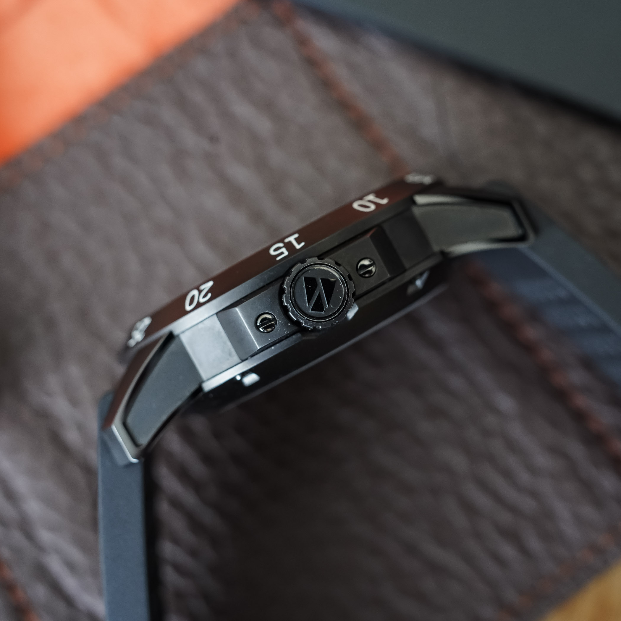 Apparently, it took the team 14 years to mull over the idea of a Zeitwinkel sports watch and make it into production, but here we are. It is the brainchild of Ivica ‘Maks’ Maksimovic, one-third of the founding team of the brand, and it comes in five variations. Four of them have a dark grey PVD coating, and only one comes in all-black; the 240° NOIR. Everything starts with a 40.5mm wide steel case, a new size for the brand, which is then finished with a black DLC coating. The design feels familiar and comes with the same recessed sections in the caseband, a stout crown with excellent grip, a slanted bezel and sapphire crystals on both sides.