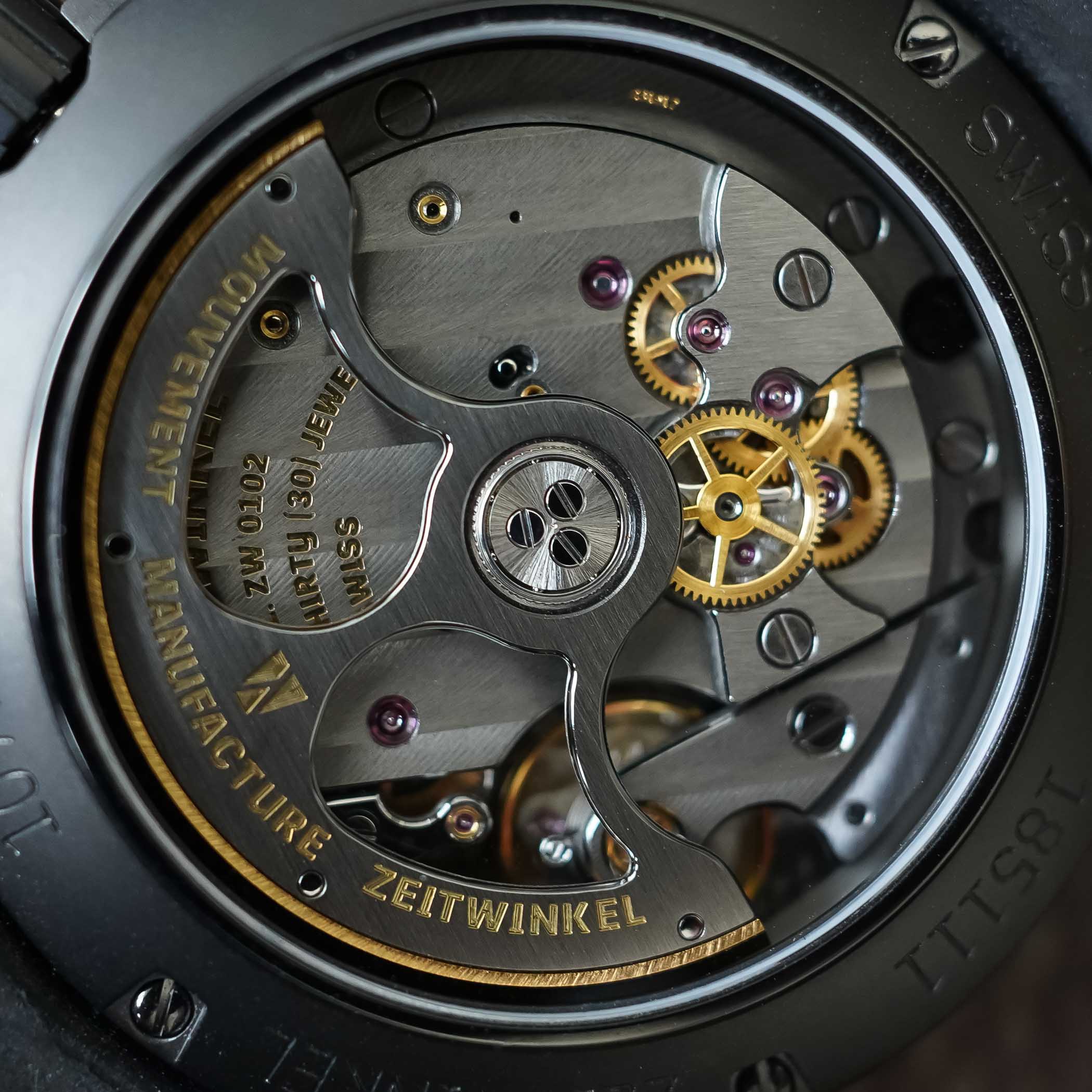 To round things off, I think the 240° NOIR is a sleek and stealthy addition to Zeitwinkel’s already impressive line-up. The fit and finish, even on this pre-production prototype are very good and will be even better in the final watches that will go to clients. It might seem like a fairly straightforward watch at first but there’s a lot to discover. Coating the case in black changes things up quite dramatically yet takes nothing away from the brand’s typical contemporary style. The recessed sections still come through, and details such as the small separation between the lugs and the bezel give it a ton of character without going overboard. I also love the various textures of the dial and the simple yet clear font for the numerals. And finally, there’s the movement, which, even tinted like this, is just a joy to behold!