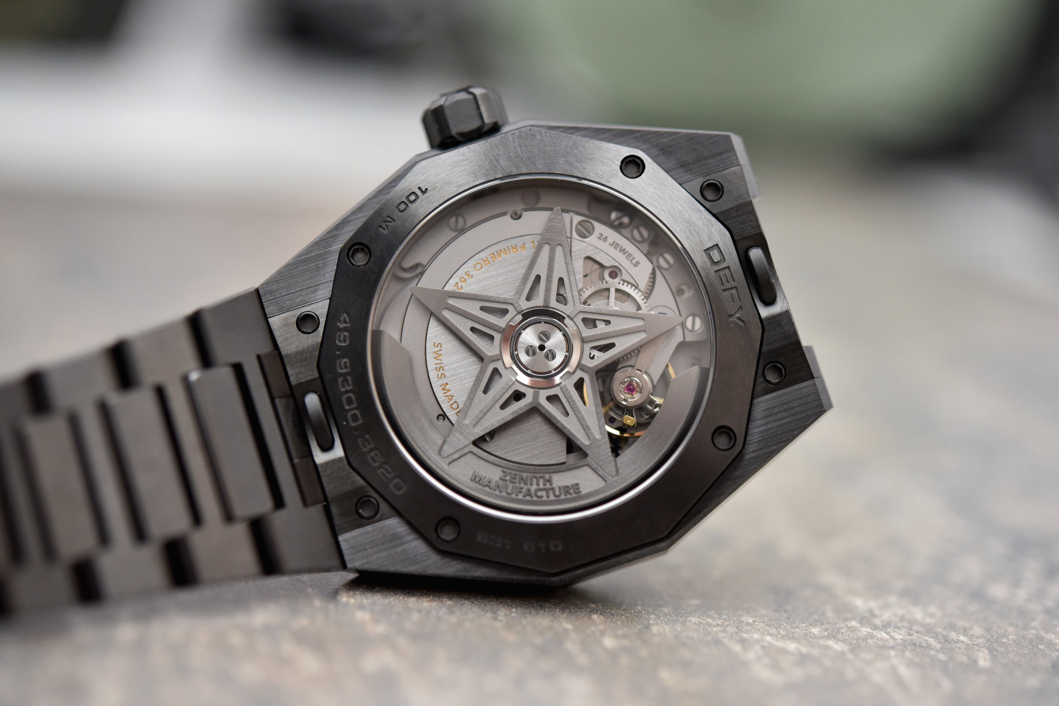 The openworked version comes with the same set of indices and hands but exposes the movement underneath. Shaped like a four-point star, a symbol close to Zenith’s heart, the top structure is finished in black, with the charcoal elements underneath clearly visible. The balance wheel in the top-left corner, half of the barrel, the running gear, and the keyless works, most of it is clearly visible. For this one, the 1/10th of a second indication is positioned at 6 o’clock and the date has been removed.