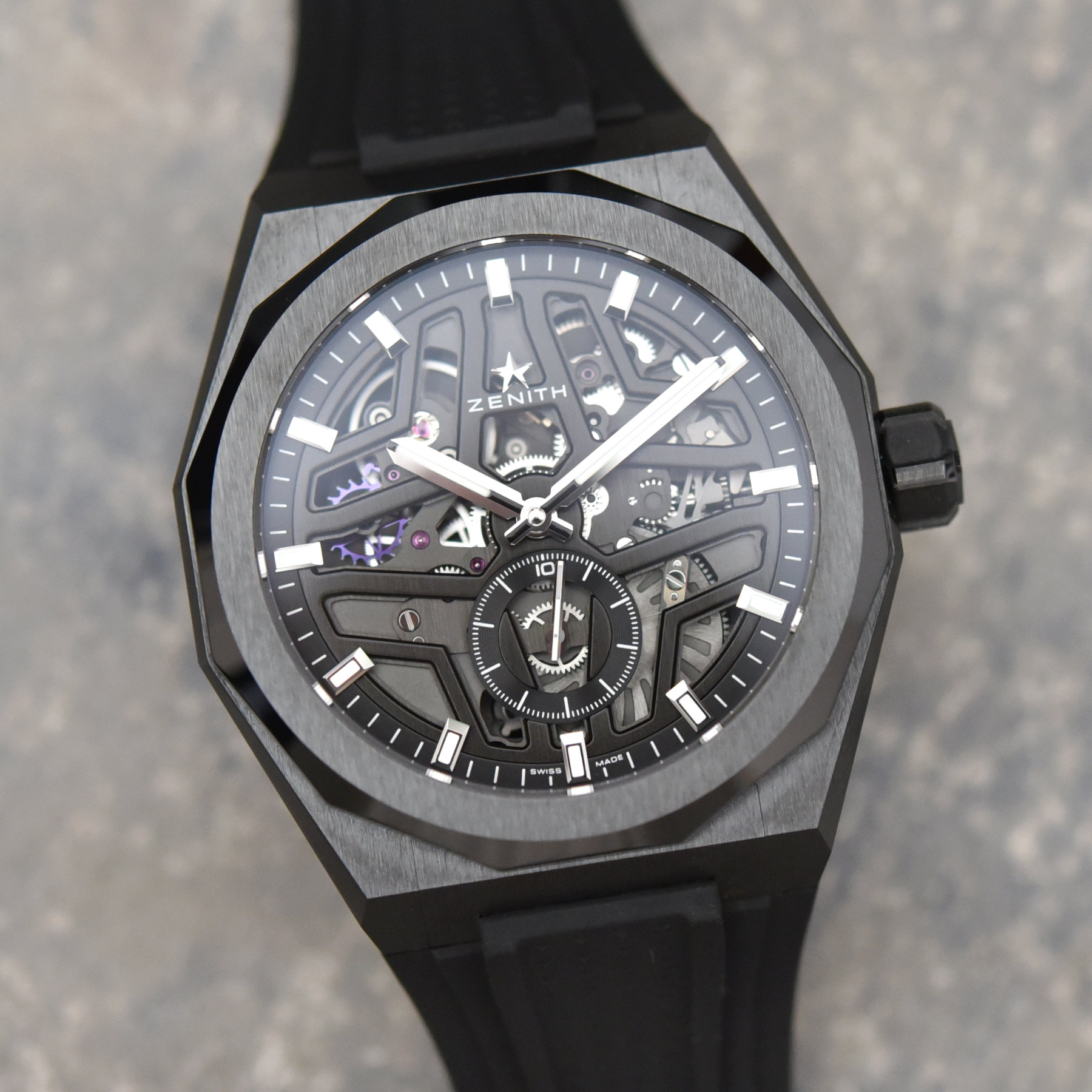 Where previously the Zenith Defy Skyline and Defy Skyline had a stainless steel exterior, these blacked-out iterations come in full black ceramic. Zenith has an extensive history with the material, so it’s no surprise the brand would eventually combine it with the edgy style of its luxury sports watch. The scratch-resistant case measures 41mm by 11.6mm and wears pretty well on the wrist. The sharp angles and edges give it loads of character, emphasized by the 12-sided black ceramic bezel. On the right-hand side, the sturdy screw-down crown lets you adjust the time and date (if it has one, that is) without any effort.