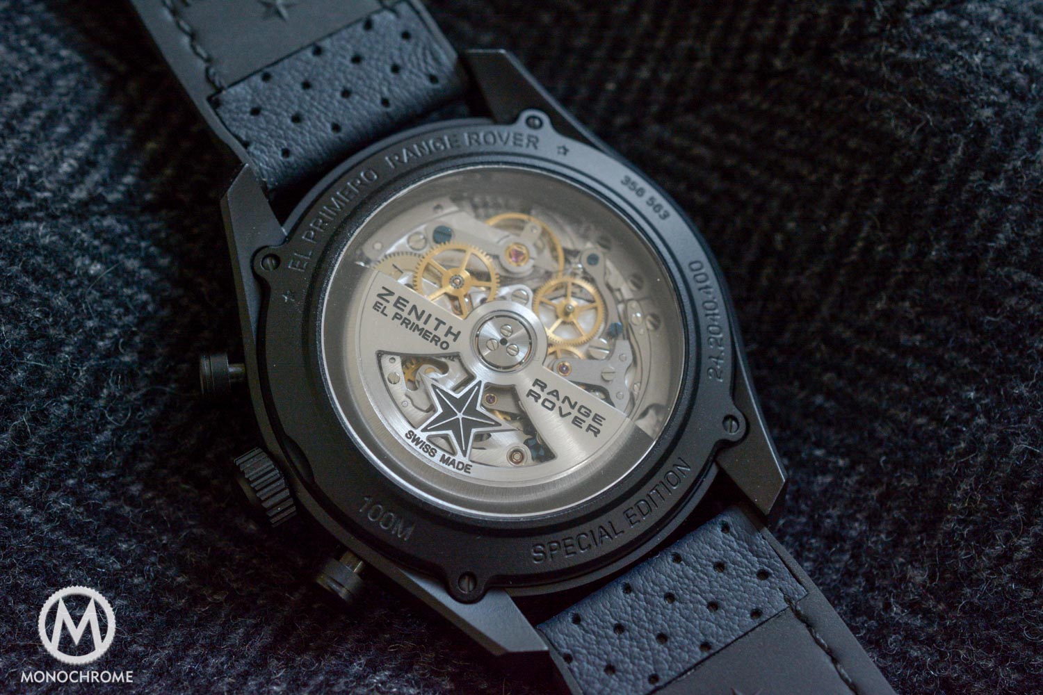 This special edition is powered by the 400B version of the iconic El Primero chronograph personalized with a ‘Range Rover’ engraving on the rotor. Introduced in 1969, El Primero was one of the very first automatic chronographs. It is an integrated construction with column-wheel and horizontal clutch. As it is operating at 36’000 vibrations/hours, the chronograph second hands performs 10 jumps per seconds marking off tenths of a second. Not surprisingly, given the automotive background of the watch, the chronograph is complemented by a tachymetric scale, discreetly transferred on the flange.