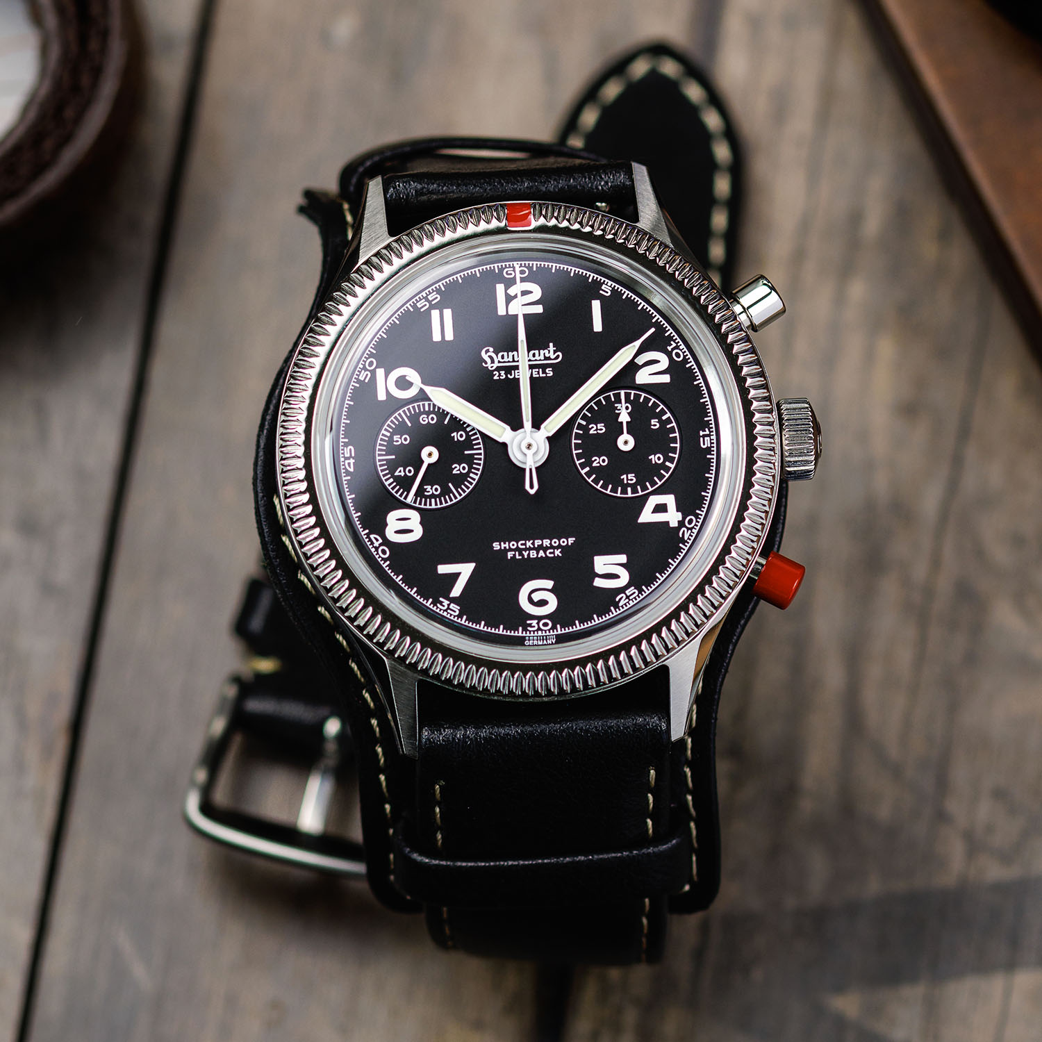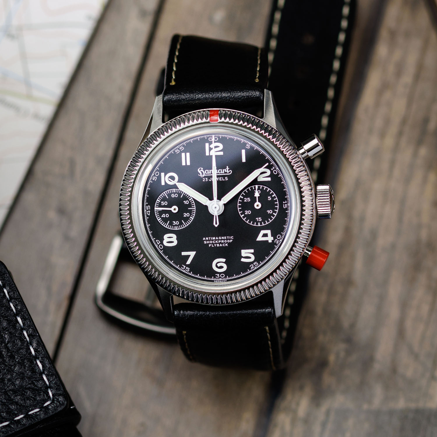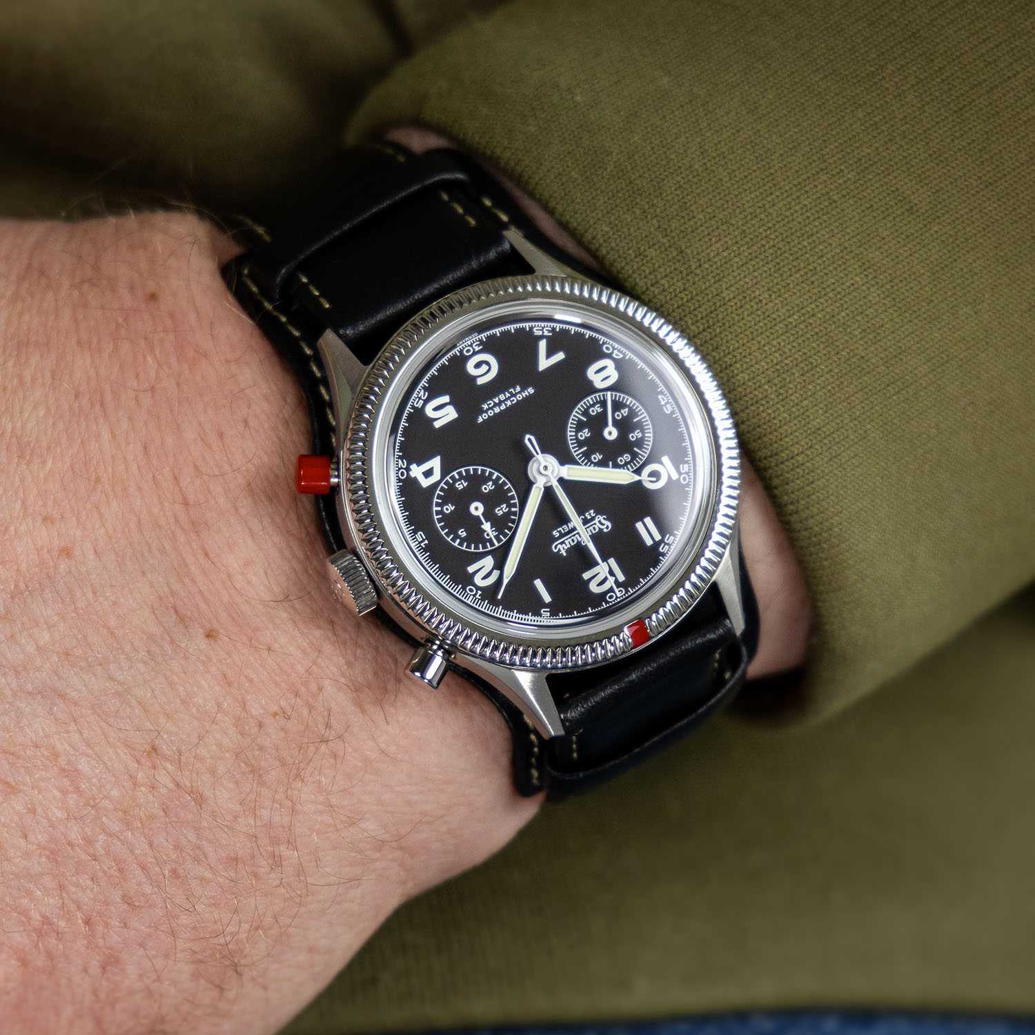 It’s always refreshing to hear that brands actually listen to their fan base… Of course, it’s hard to please everyone, but at least some are trying hard to evolve according to the suggestions they receive. And sometimes, it results in a new watch that looks exactly like we’d have envisioned it. Such is the story of the Hanhart 417 ES Heritage Flyback. A watch made according to popular demand, after receiving multiple requests asking for the column-wheel flyback movement combined with a classic black dial, and the return of the emblematic red HyCeram pusher. And voila, here’s the result.