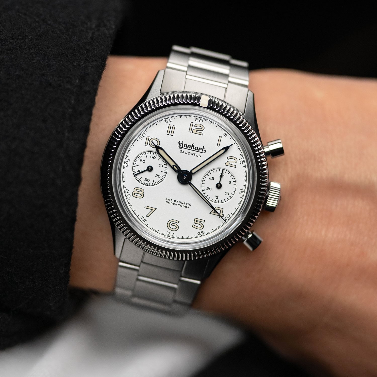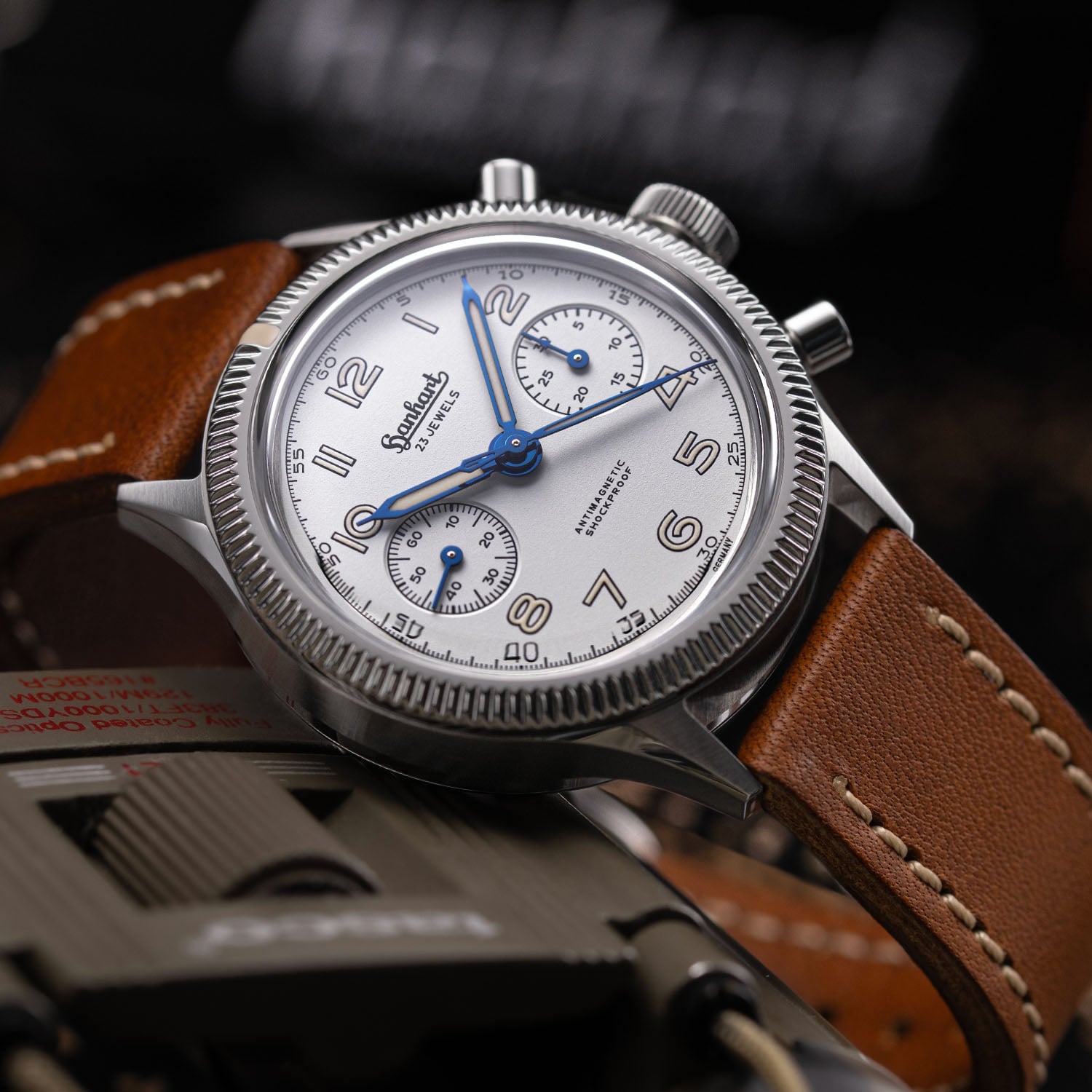 The white dial is clean and legible, featuring period-correct typography, a bi-compax layout, and the historical Hanhart logo. Ivory-toned Arabic numerals and hands are filled with Super-LumiNova Light Old Radium. The steel hands are thermally blued.