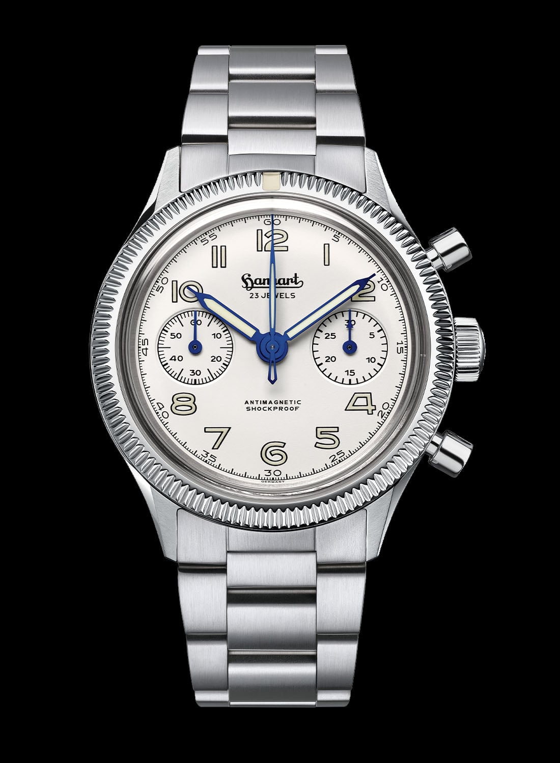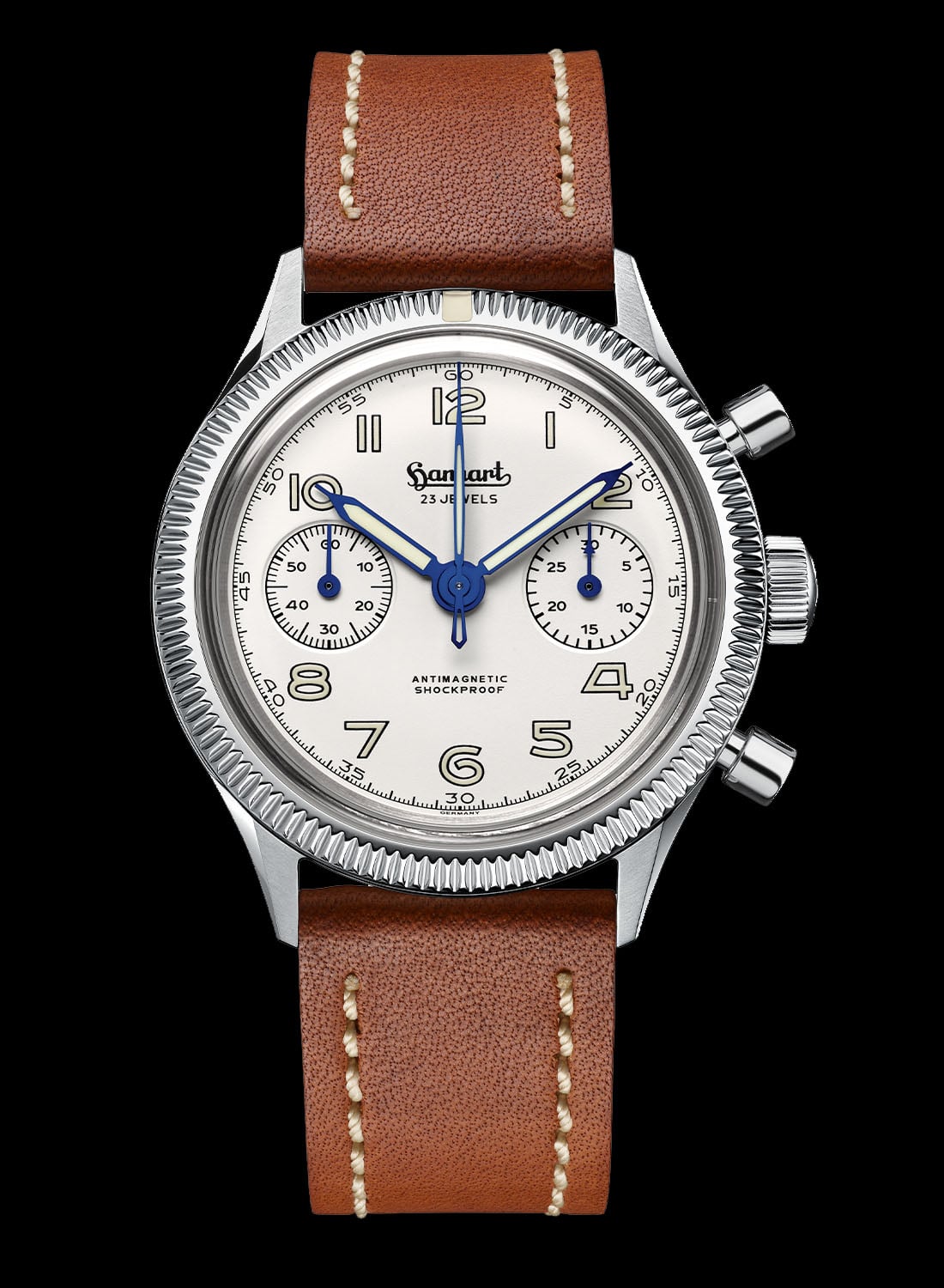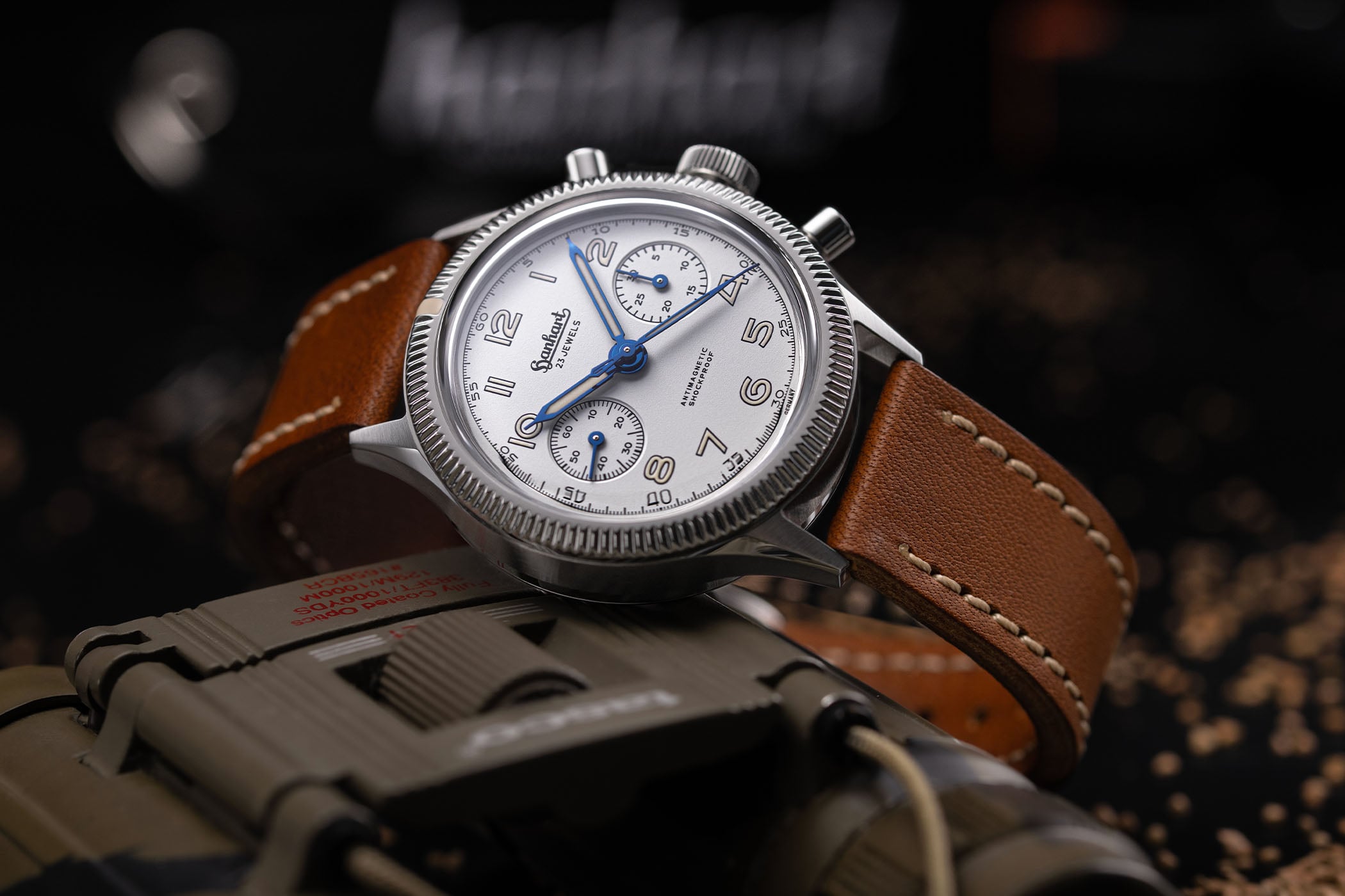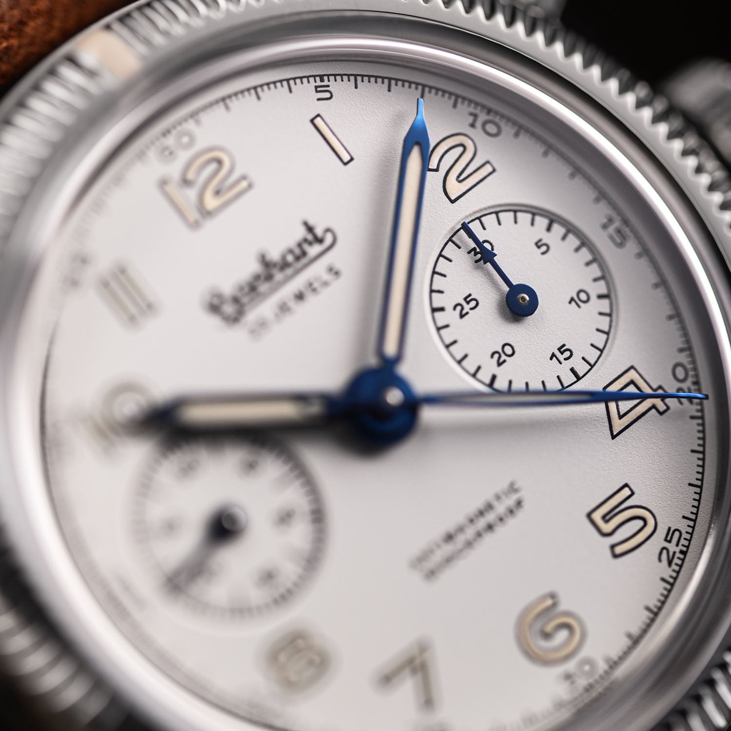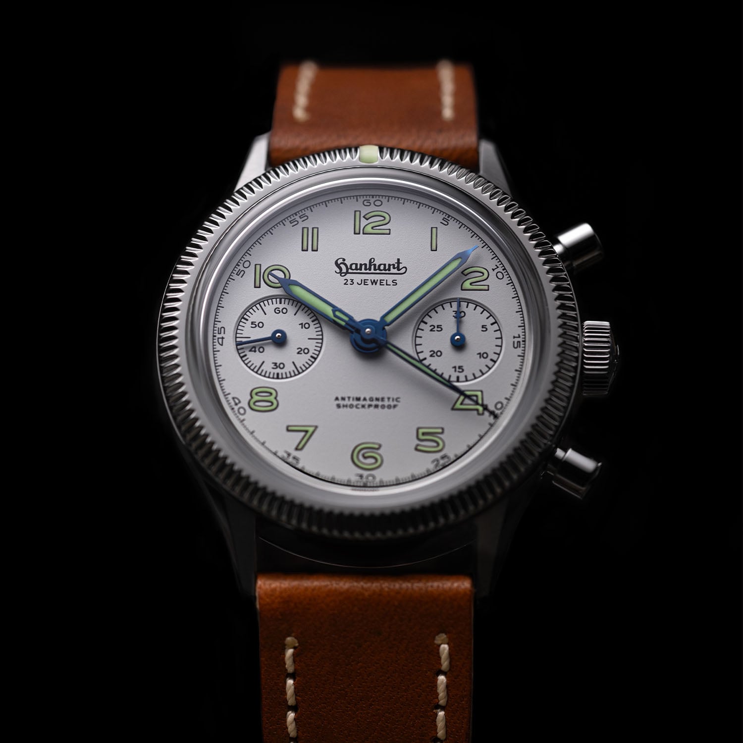 The white dial is clean and legible, featuring period-correct typography, a bi-compax layout, and the historical Hanhart logo. Ivory-toned Arabic numerals and hands are filled with Super-LumiNova Light Old Radium. The steel hands are thermally blued.