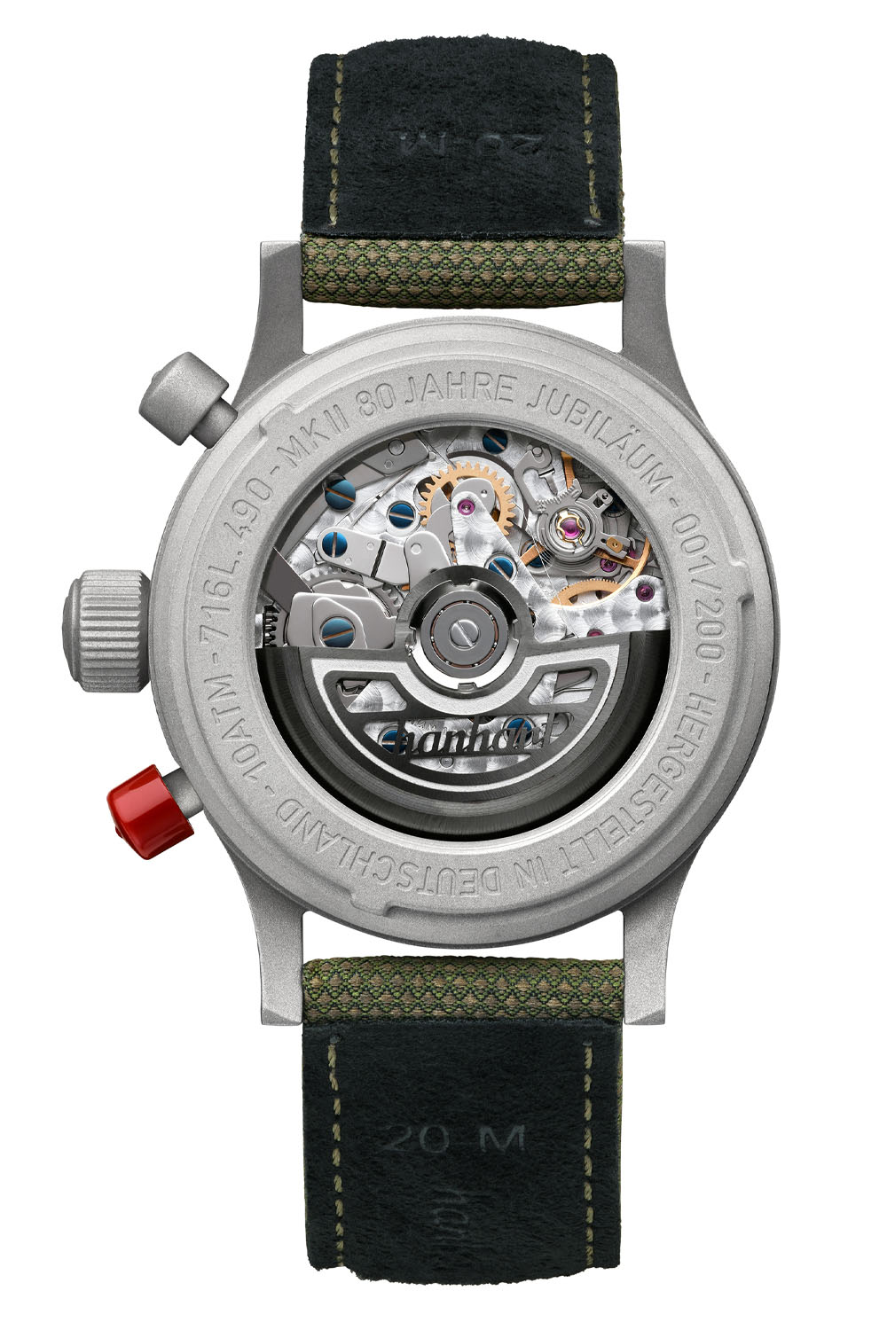 The Pioneer Mk II 80 Jahre Jubilaeum retains the classic 40mm case with elongated lugs and the signature fluted bezel, continuously rotatable (no clicks), with a red marking to perform inflight calculations. The case is presented in a matte, textured sand-blasted finish, with its classic oversized crown. As all historic Calibre 41 watches, as well as its modern evocations, the Pioneer Mk II 80 Jahre is equipped with asymmetrical pushers, the lower one coated in red to prevent unintentional resetting.