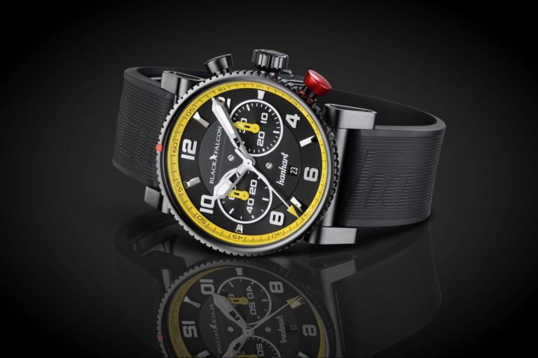 Turning the watch over, the exhibition caseback is secured by screws and allows a view of the calibre HAN3809. This self-winding chronograph movement is based on the trustworthy ETA/Valjoux 7750 with a La Joux-Perret module – this allows the modification of the trademark Valjoux 6-9-12 layout to a more harmonious 2-register display. Operating at 28,800 vibrations per hour, it has a power reserve of 42 hours when fully wound.