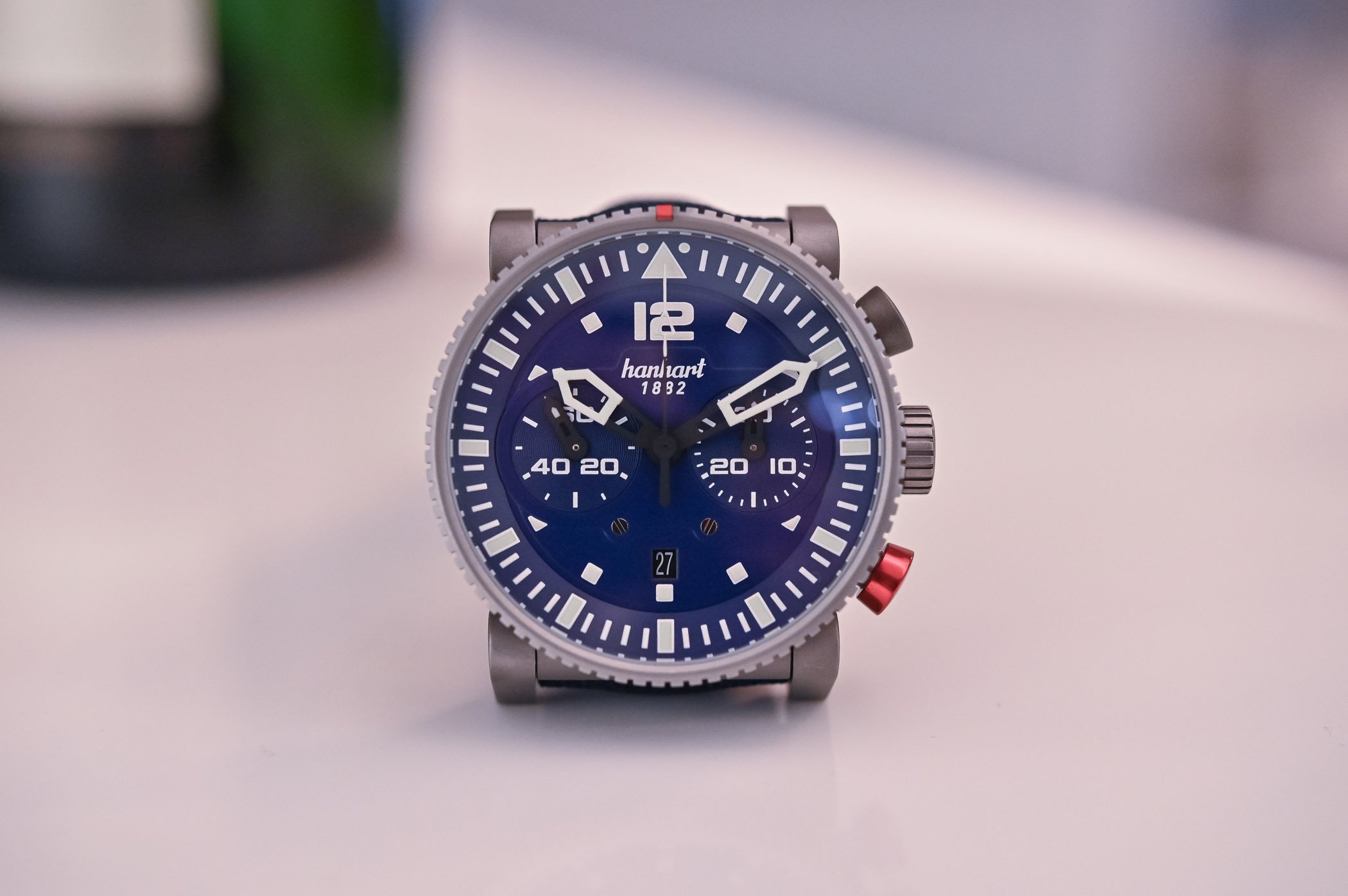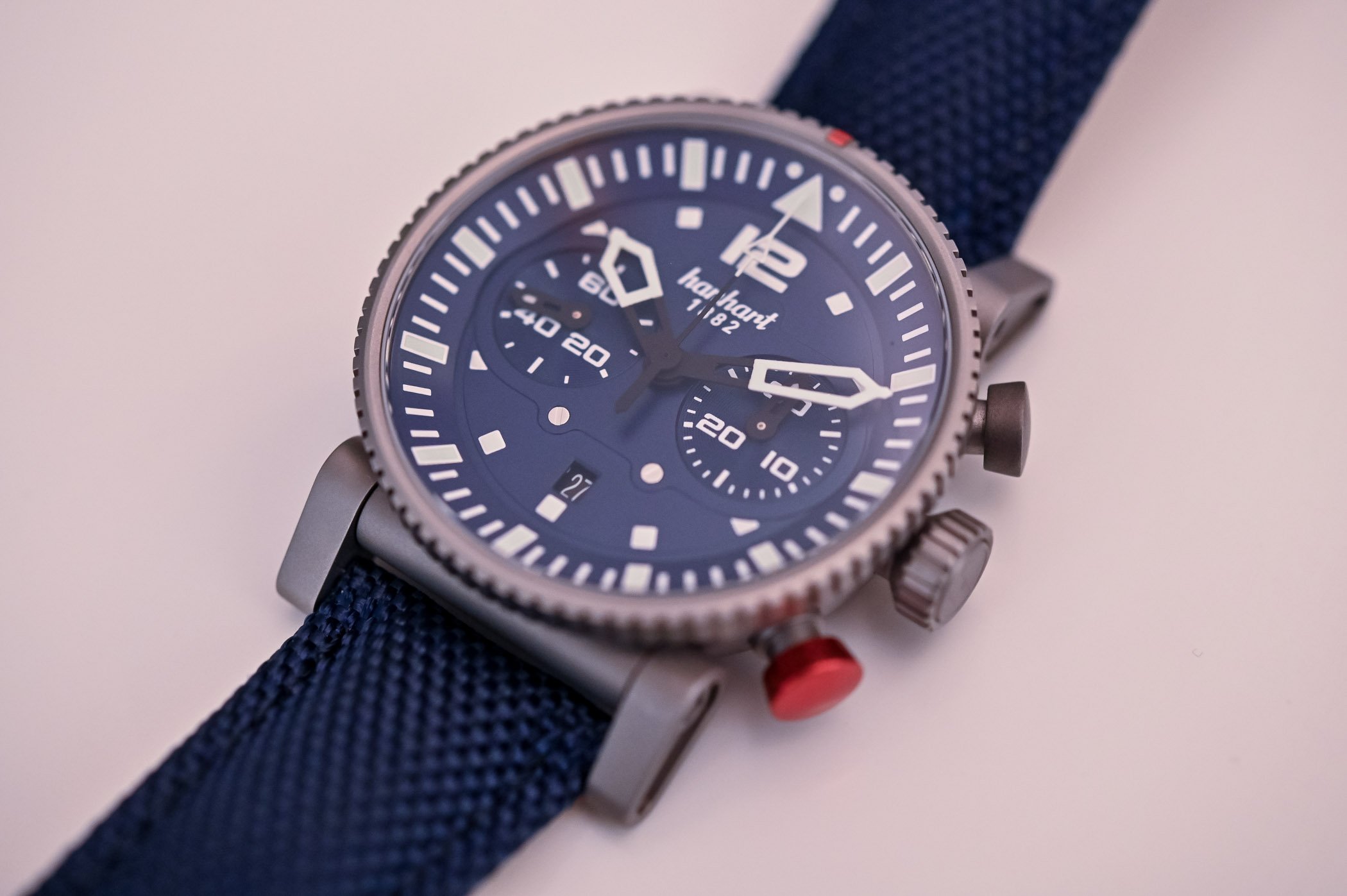 One of the flagship collections of the Gutenbach-based manufacturer Hanhart, the modern Primus, is a masculine pilot chronograph relying on a bold yet easy-going style. While much more contemporary than the “Pioneer” collection, it still retains many of the classic “Flieger” elements. The latest addition to the line comes with a sleek blue dial and strap combo. Meet the Hanhart Primus Carrier Pilot.