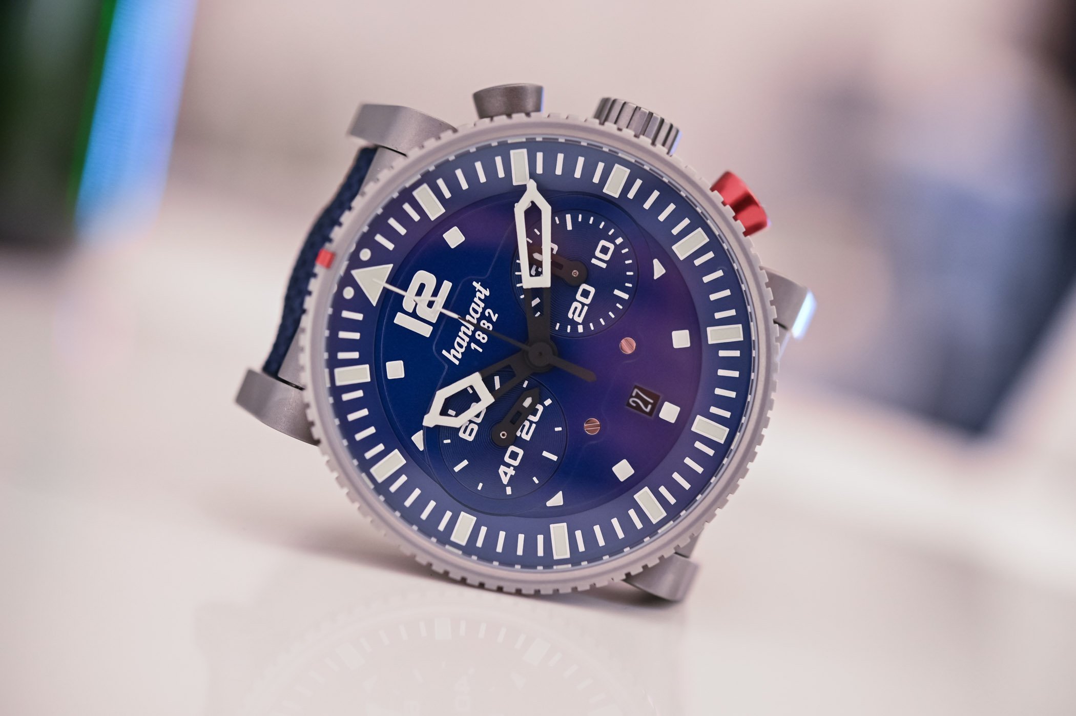 The new Hanhart Primus Carrier Pilot is worn on a blue hardwearing canvas strap with a leather inlay. It is secured to the wrist by a sandblasted steel folding clasp. The watch retails for EUR 2,740. For more information, you can visit www.hanhart.com.
