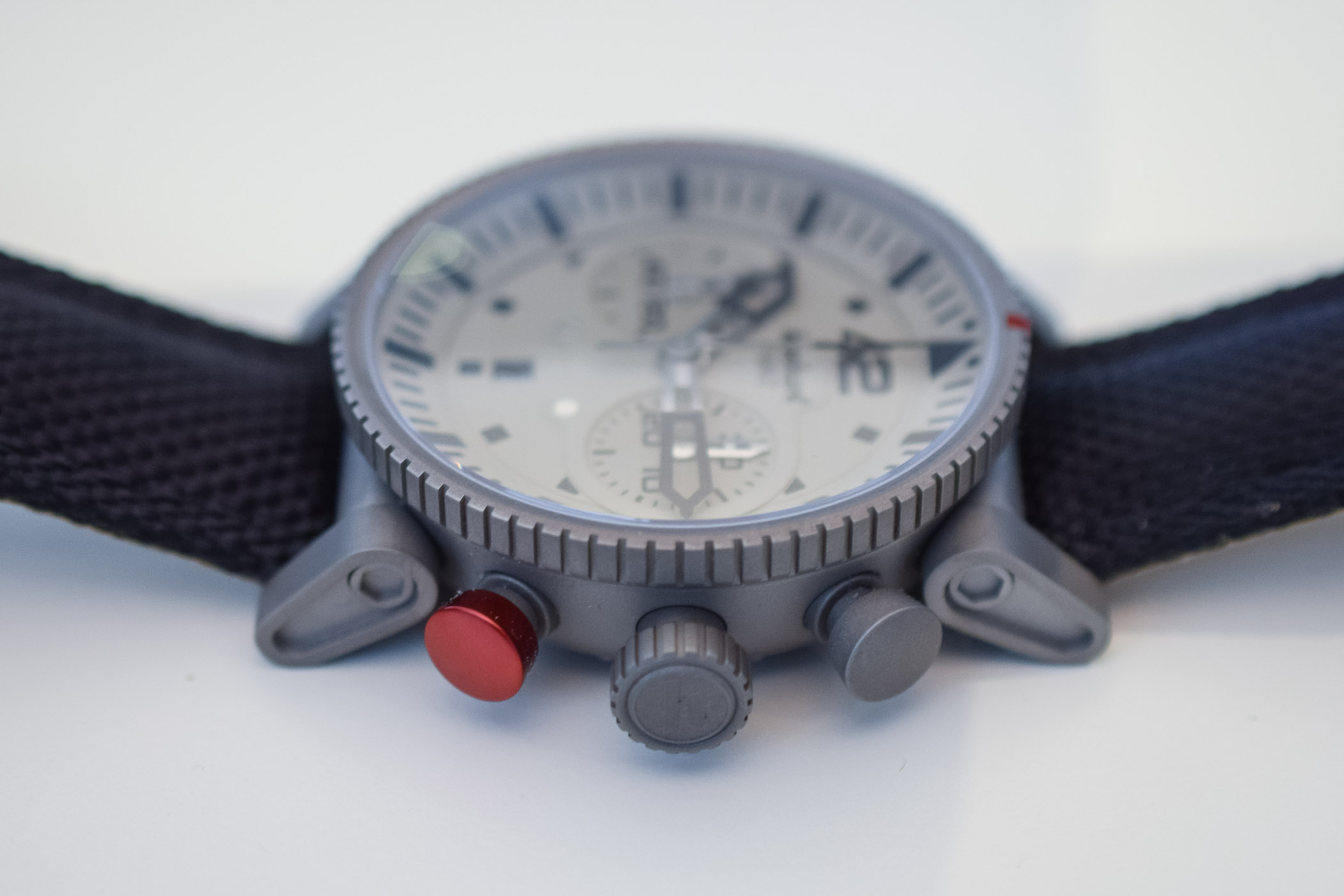The case of the Primus Monochrome Pilot is the same as the one we’ve seen in previous editions: large, powerful, bold and hyper-robust. Its dimensions – 44mm diameter x 15mm – seem large on paper. Indeed, it is by no means a dress watch. Yet, it features a clever pair of lugs that are articulated offering great comfort on the wrist. As a tribute to vintage Flieger chronographs manufactured by the brand for WWII pilots, the reset pusher of the chronograph is presented in red anodised aluminium – the only touch of colour found in this watch, alongside the red marker on the rotating bezel, in order to make calculations. All the parts are oversized and easy to activate, as a good pilot watch should be. The final military touch comes from the black fabric strap – a nice and well-executed strap, with leather lining and a matte steel folding buckle.