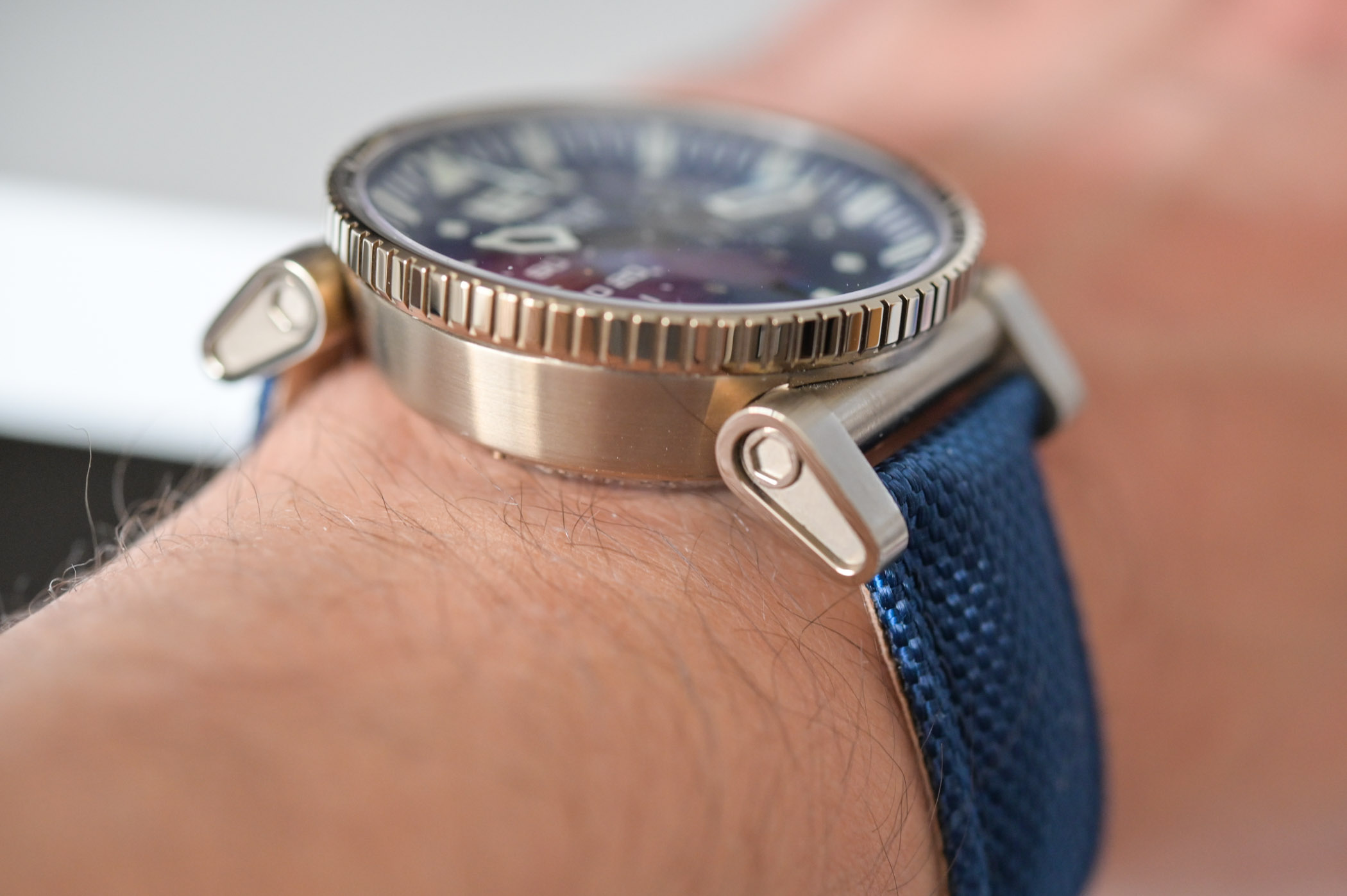 Combined with this new bronze-coated case, Hanhart has chosen a Royal Blue dial and textile strap to evoke a nautical theme. The dial and its layout are as bold and functional as the case, with oversized hands and markers. Highly legible and contrasted. One small complaint concerning the anti-reflective treatment of the crystal, which could be a bit more efficient.