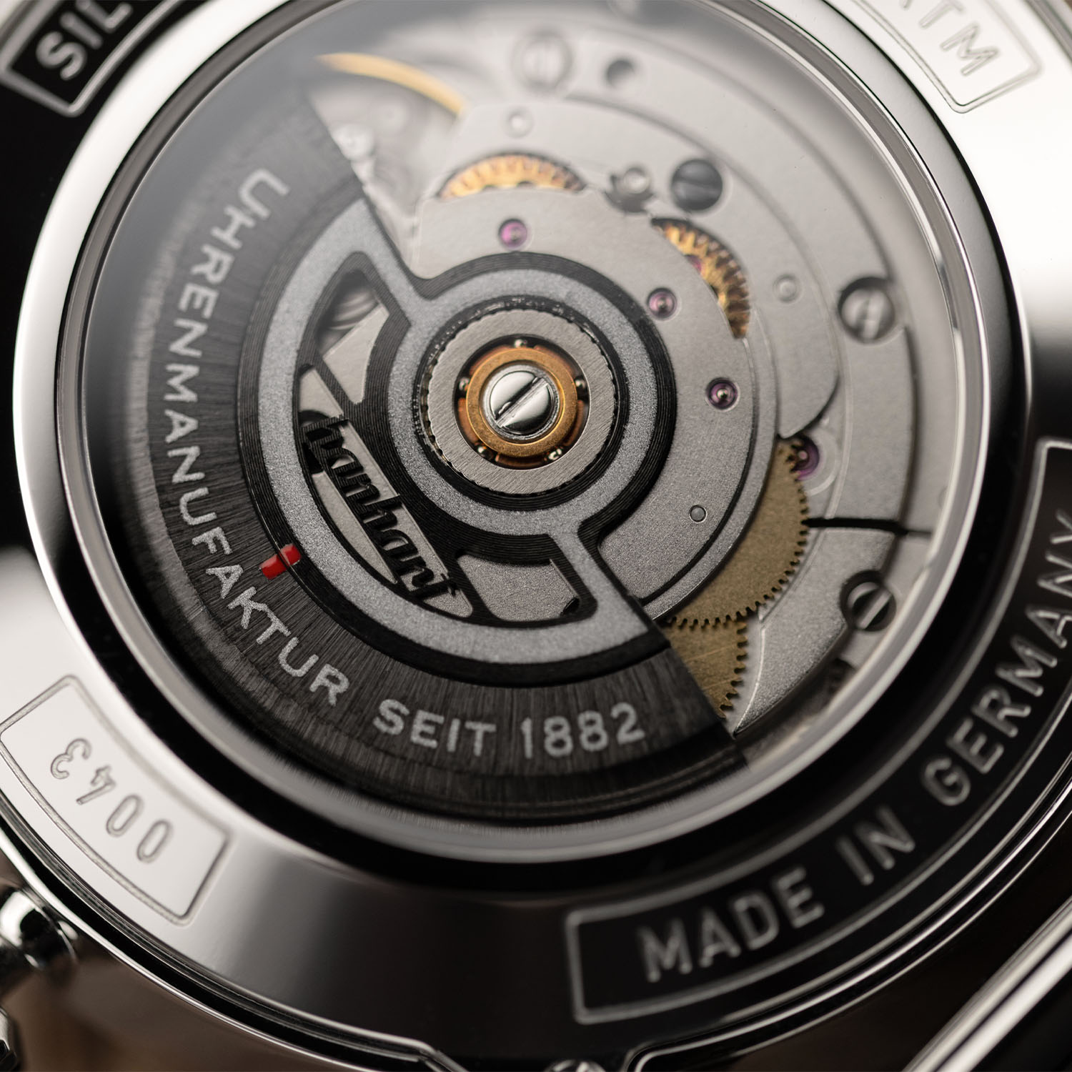 Powering the Hanhart Silva is the Soprod P024 (Top grade), an automatic three-hand movement (clone of the ETA 2824) with no date, operating at 28,800 vibrations/hour with a minimum 38-hour reserve. Regulation is to Hanhart’s in-house spec (0 to +8 s/day across six positions; no minus allowed in main positions; max positional delta 10 s). The movement boasts a Glucydur balance, Incabloc shock protection, hacking seconds, and has a partially skeletonised rotor with the Hanhart logo.