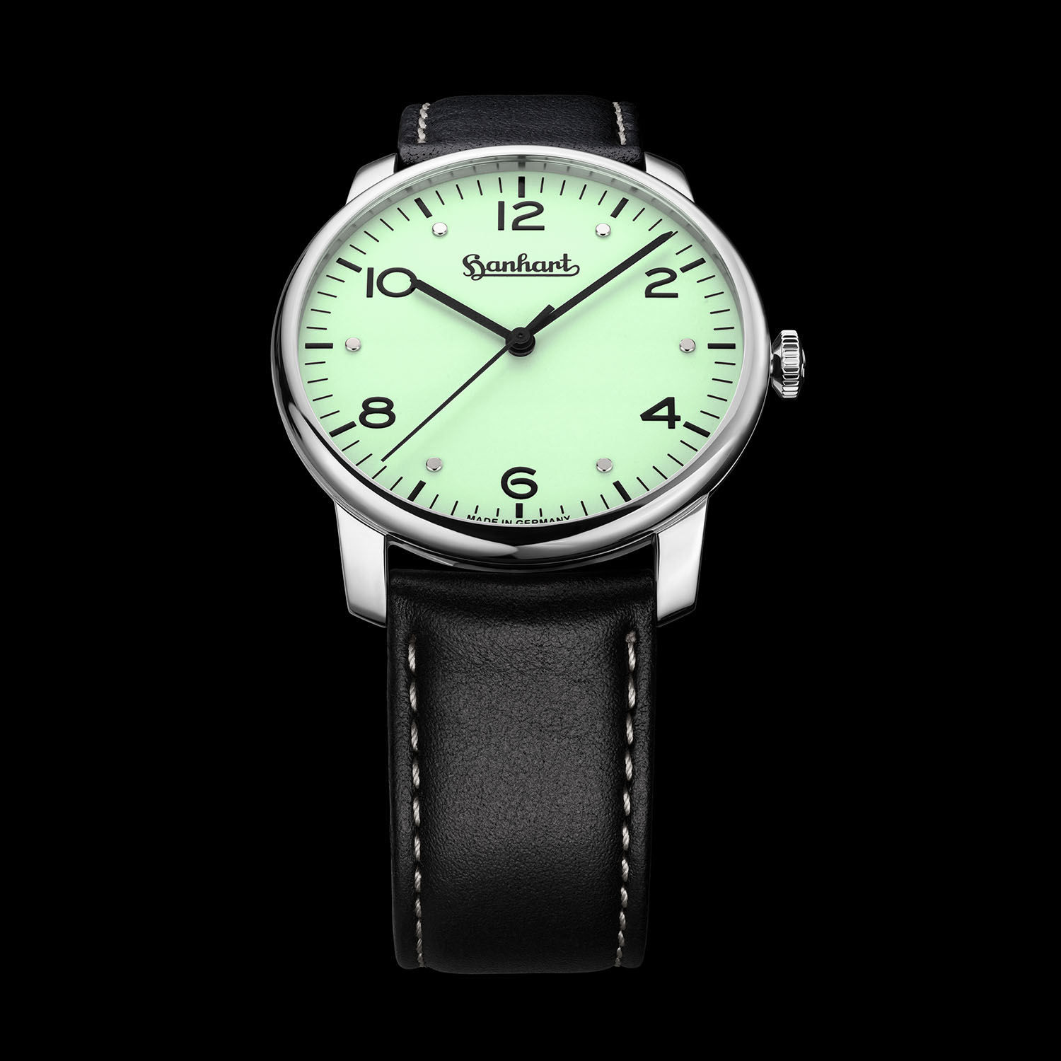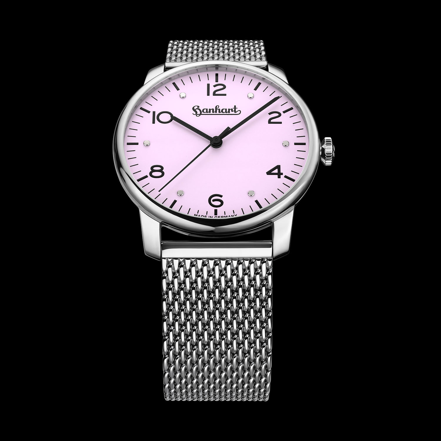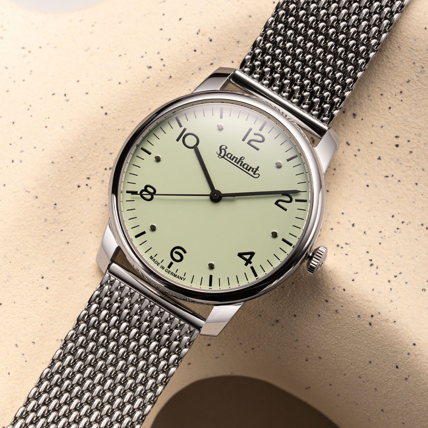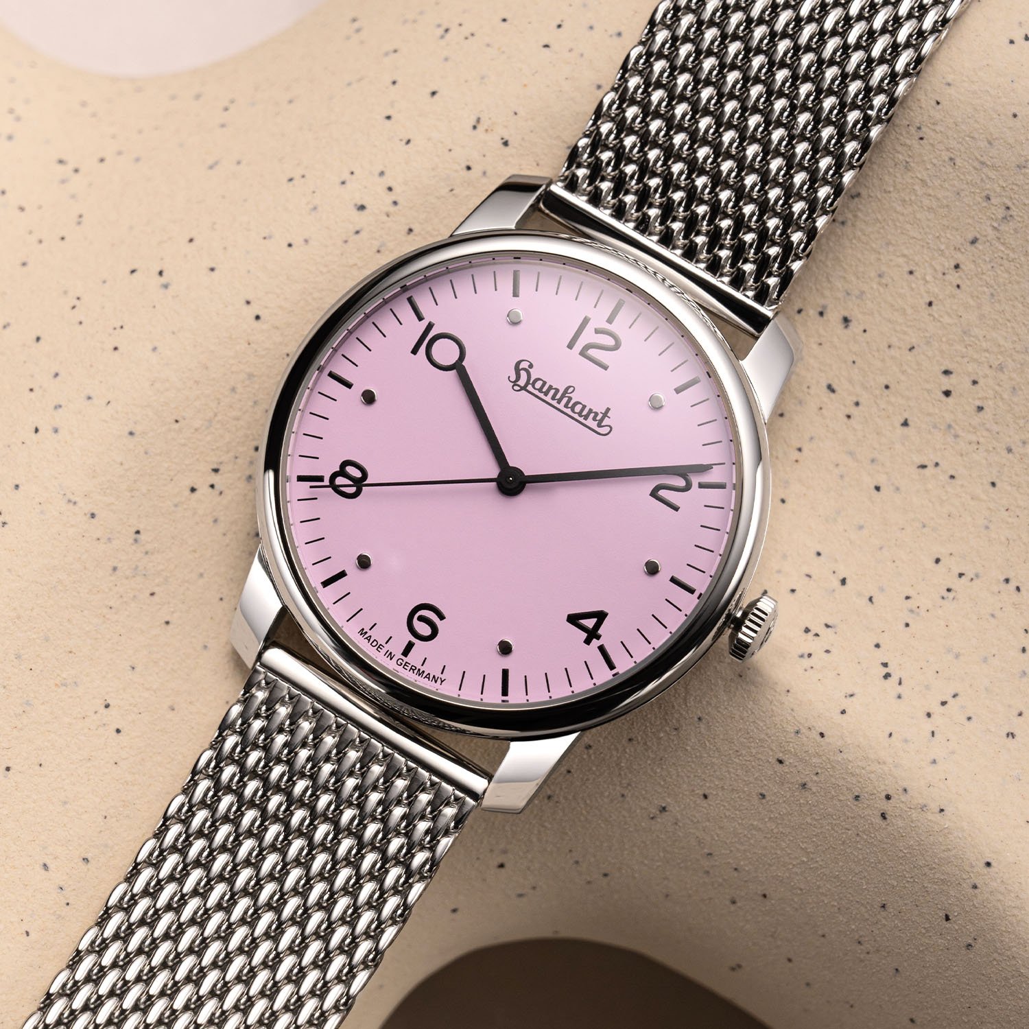 The dials are the news. Both the pastel pink “Rosé” and the pistachio green variant feature high-contrast hands, hour indices/numerals and bold dot markers for odd hours, along with the period historic Hanhart logo – a nod to the 1930s pieces, yielding a nice, high-legibility layout. The result fits neatly into Hanhart’s catalogue as the minimalist counterpart to its chronographs, offering a clean dress-casual look.