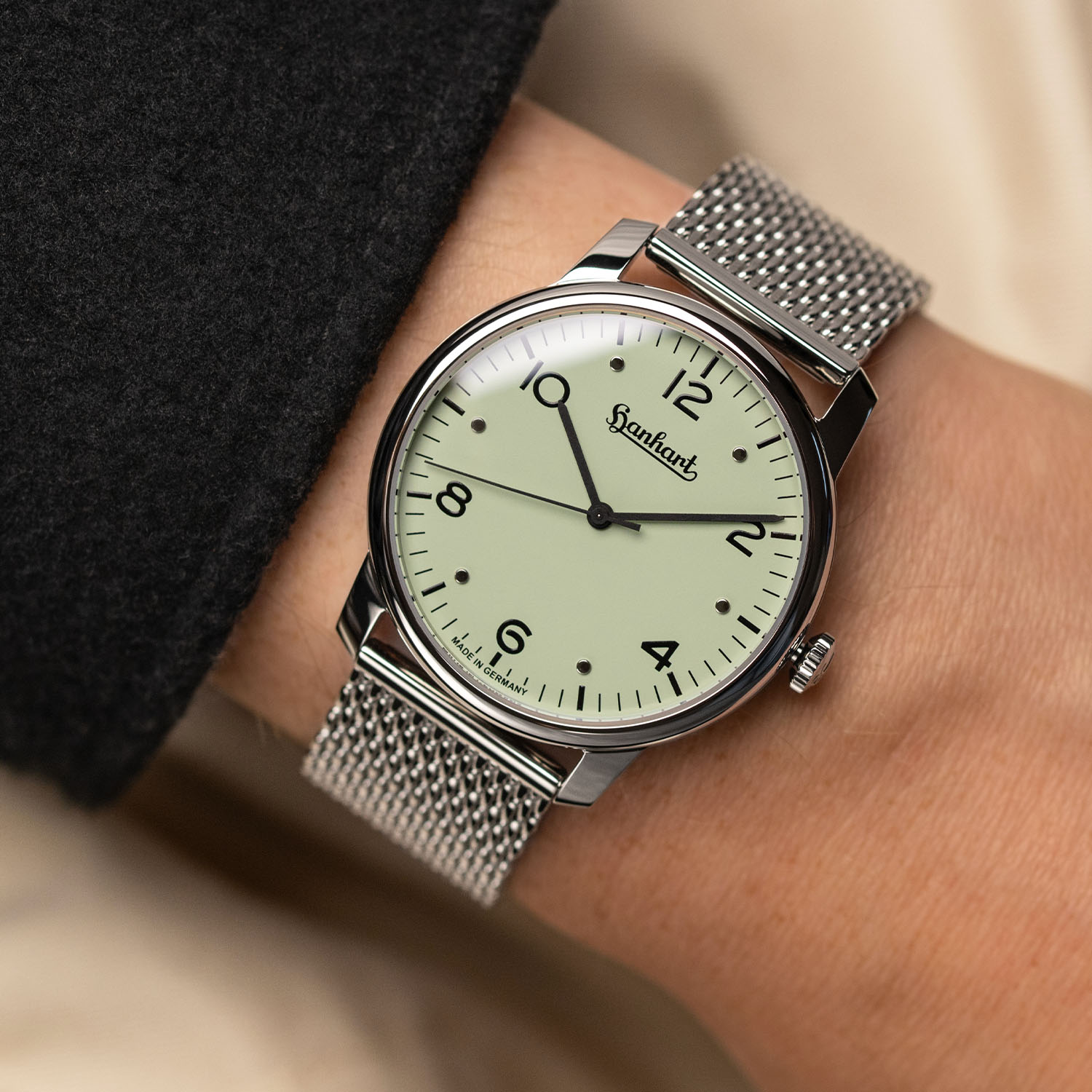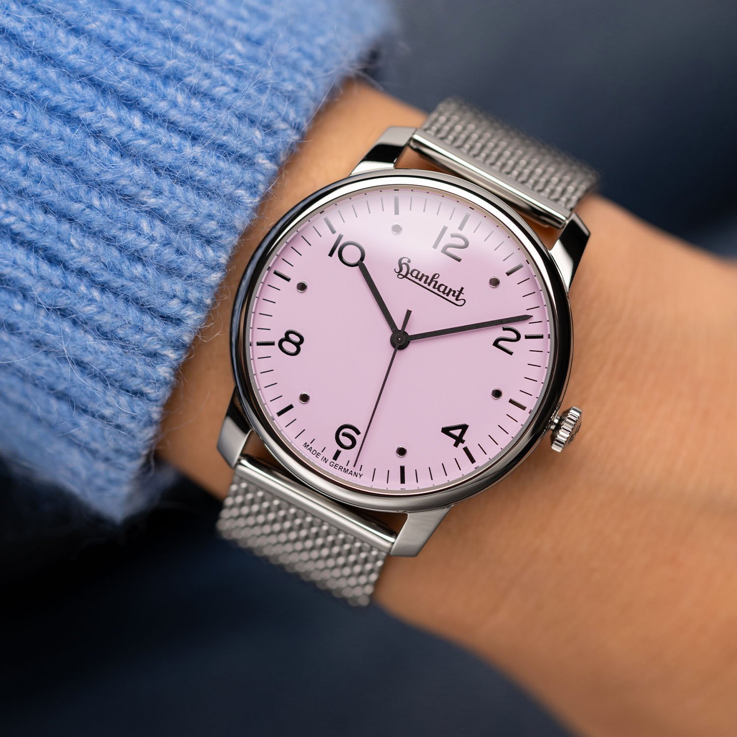 Born in the Black Forest and best known for instrument chronographs like the 417 ES and Pioneer series, Hanhart also has a quieter thread that predates its stopwatch fame: the wristwatches of the 1930s (cal. 36/39), valued for clarity and everyday utility. The Silva line infuses that heritage into a modern, time-only series. It is balanced, legible, and deliberately unisex, and sits alongside Hanhart’s tool chronographs as the brand’s minimalist daily wearer. The new Silva Rosé (pastel pink) and Silva Pistachio (light green) extend the palette while staying true to the historical design inspiration.