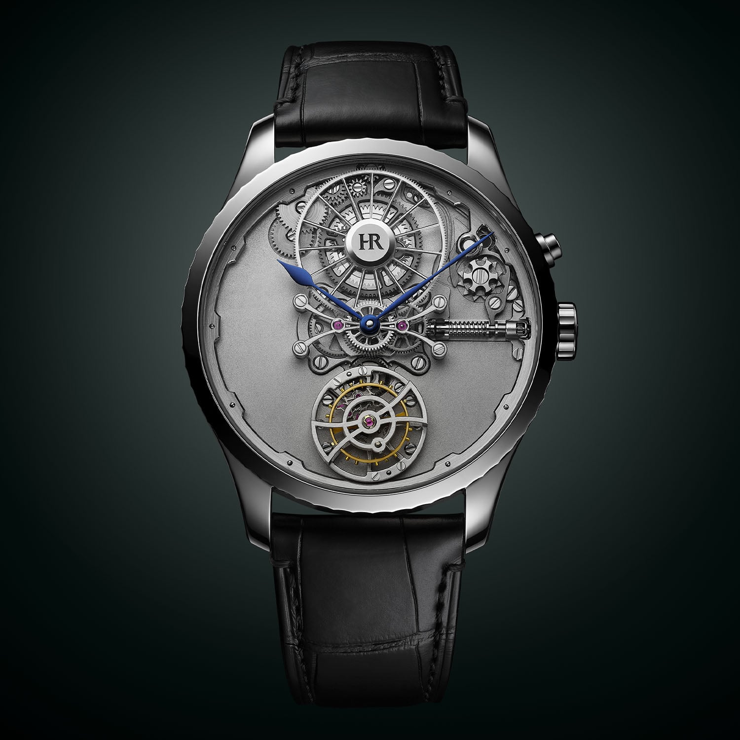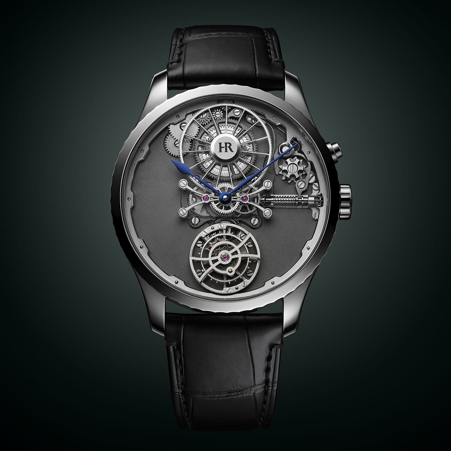 What changes with the Honoris Meccanica is that the movement is no longer hidden behind a dial, but becomes the dial itself. The three-dimensional architecture reveals a radiating structure at the centre of the watch, organised around the HR monogram. The gears and wheels of the movement, the column wheel and its levers, the keyless work… everything participates in a more radical and technical look for the watch. On top, suspended above this architecture, the blued hands rotate above the mechanics. And, at 6 o’clock, the one-minute tourbillon seems to be mysteriously floating over the dial. Its variable inertia balance beats at a slow 2.5Hz frequency.