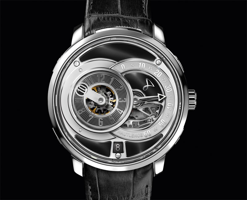 Hautlence preserves the link between the old hand-wound calibres and a new way to display time, via a jumping hour disk and a retrograde minute hand. For the HLq they incorporated a new gear train arrangement for reading the time (which optimises the space and increases the size of the minute reading sector) and added a date function.