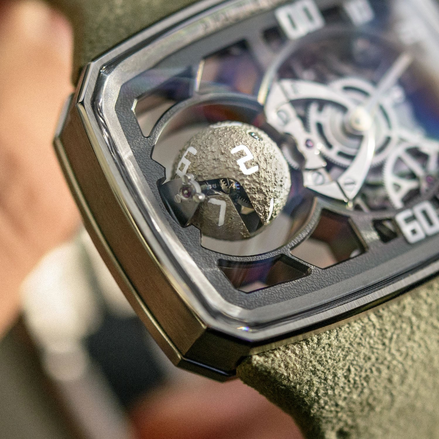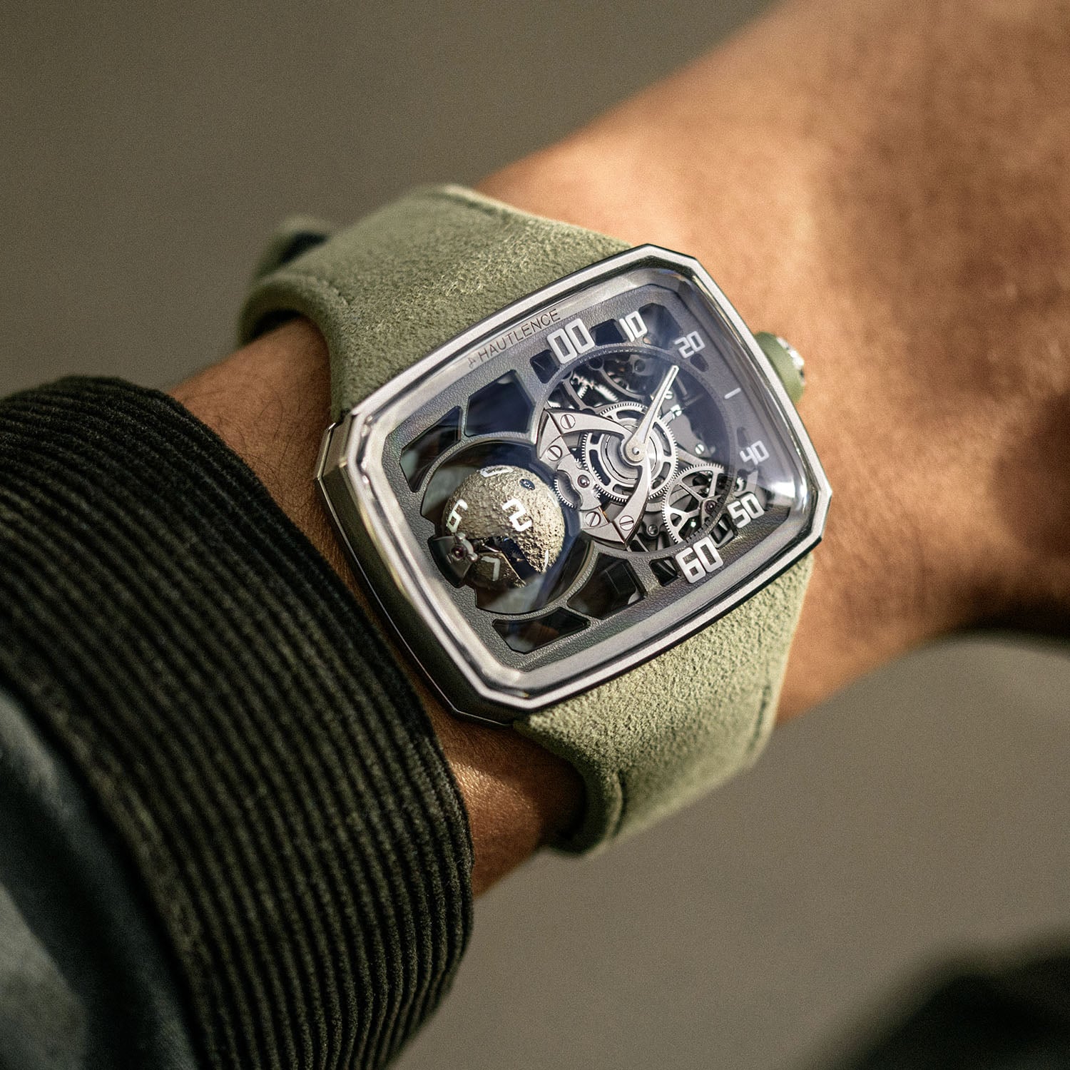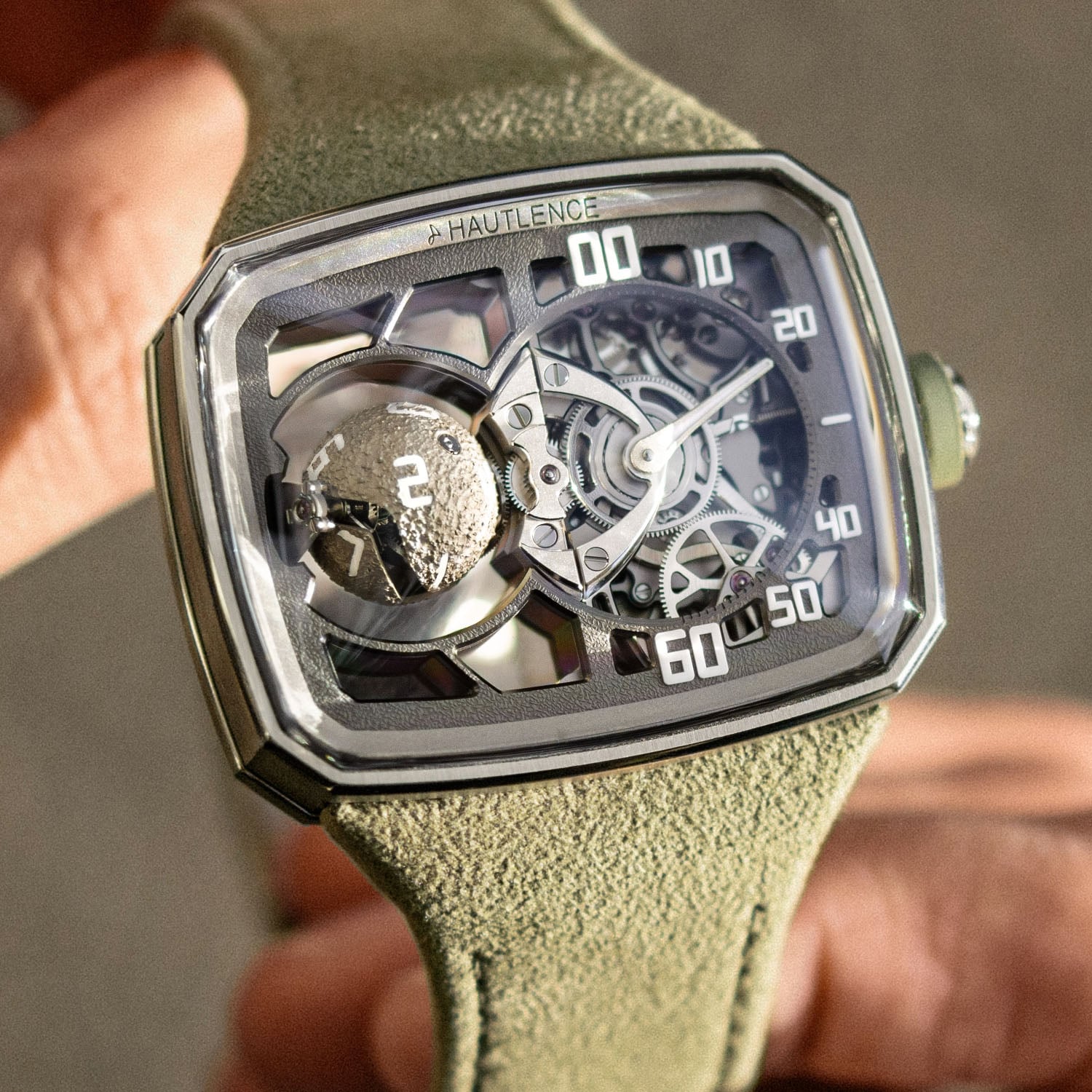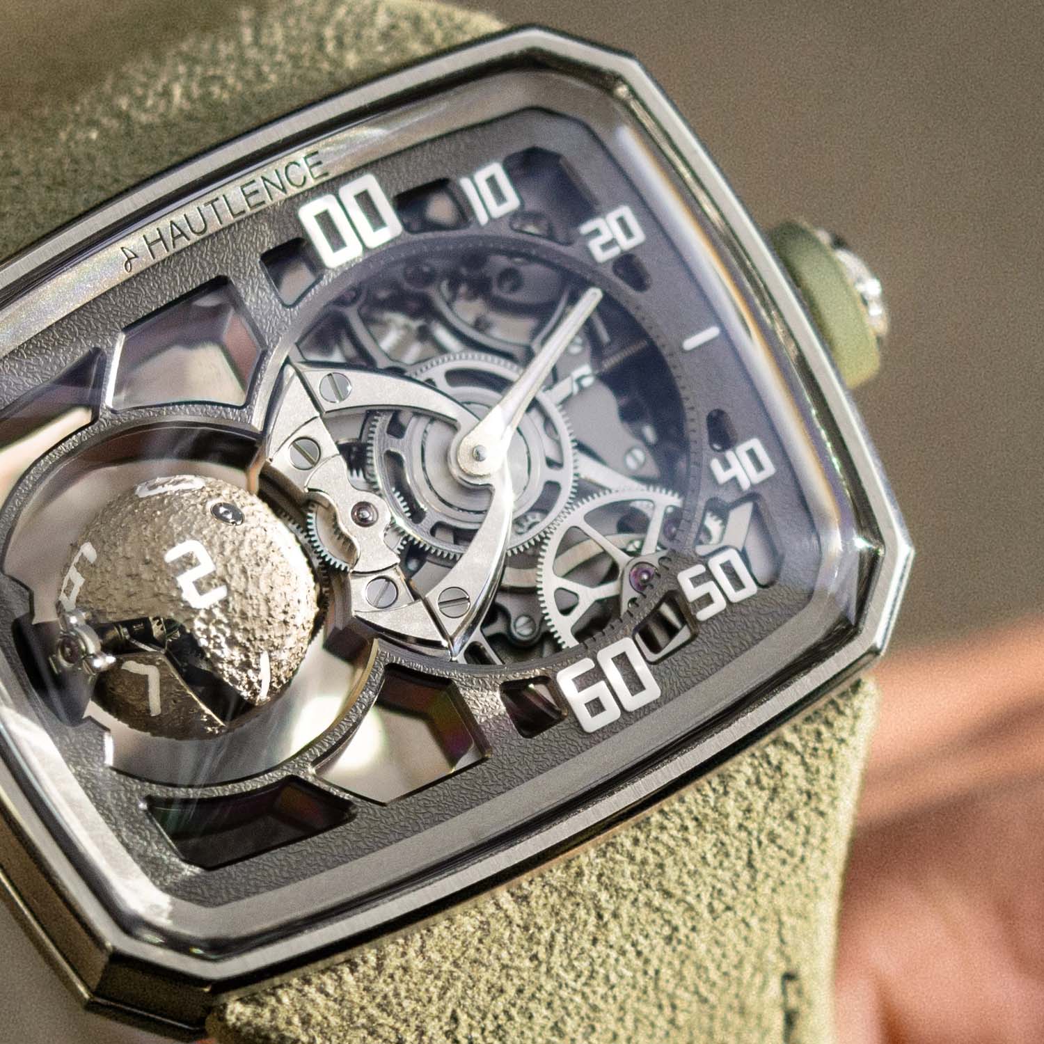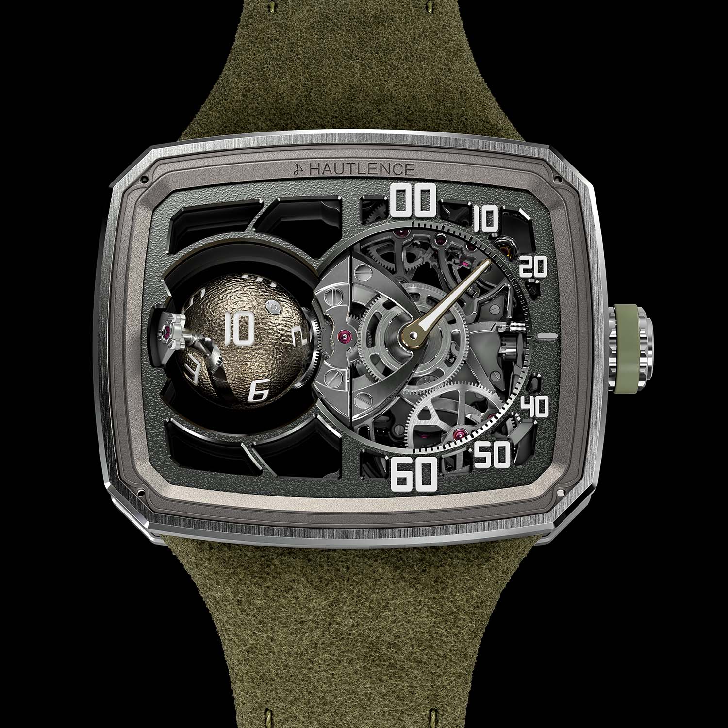 Olive green and sand tones for Hautlence’s signature multi-axis spherical display watch.