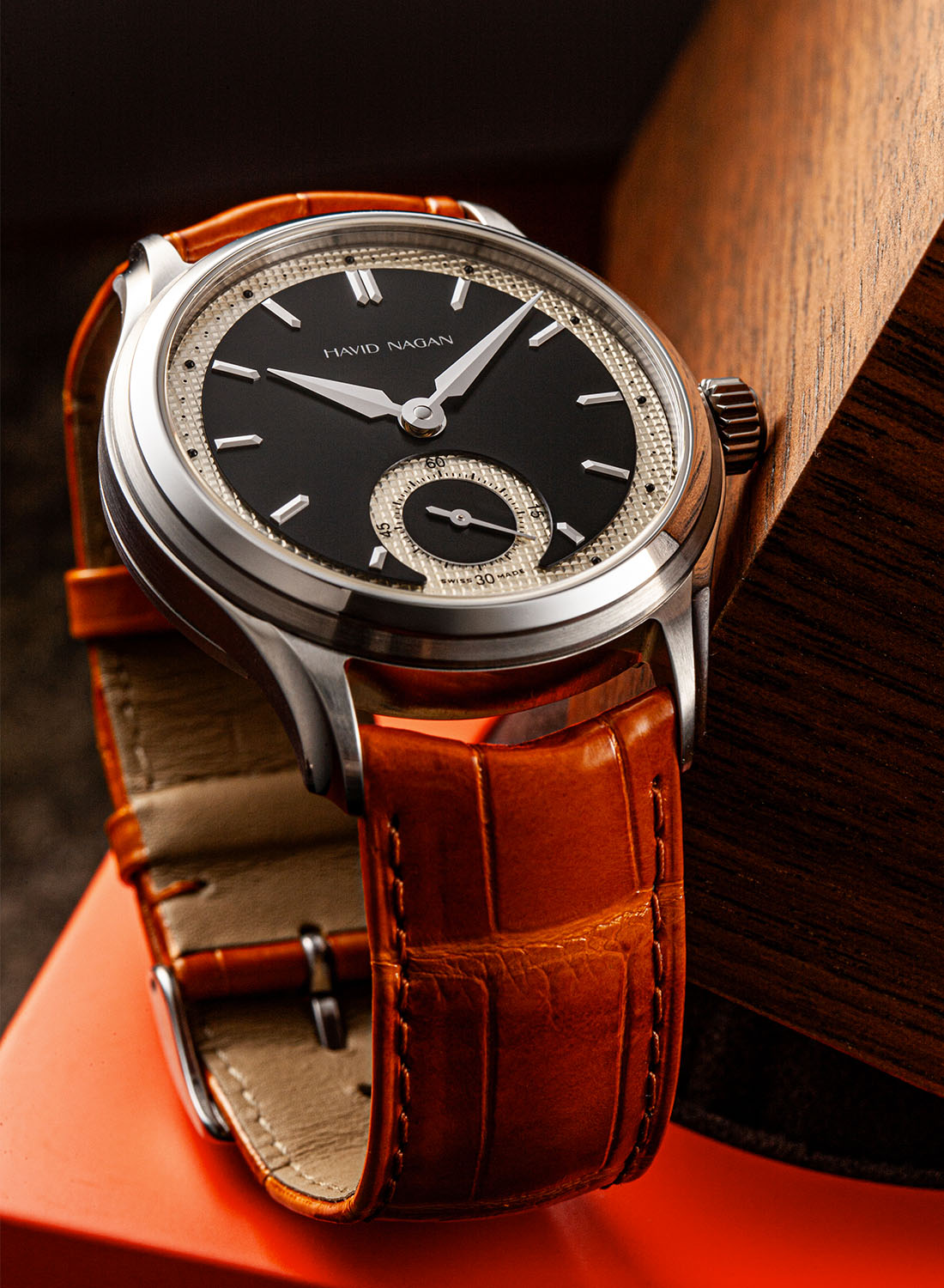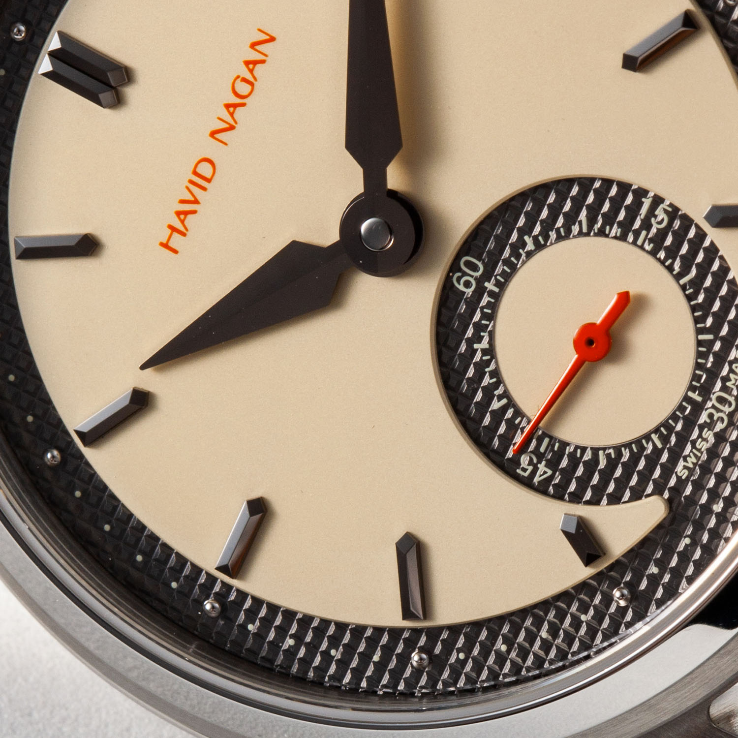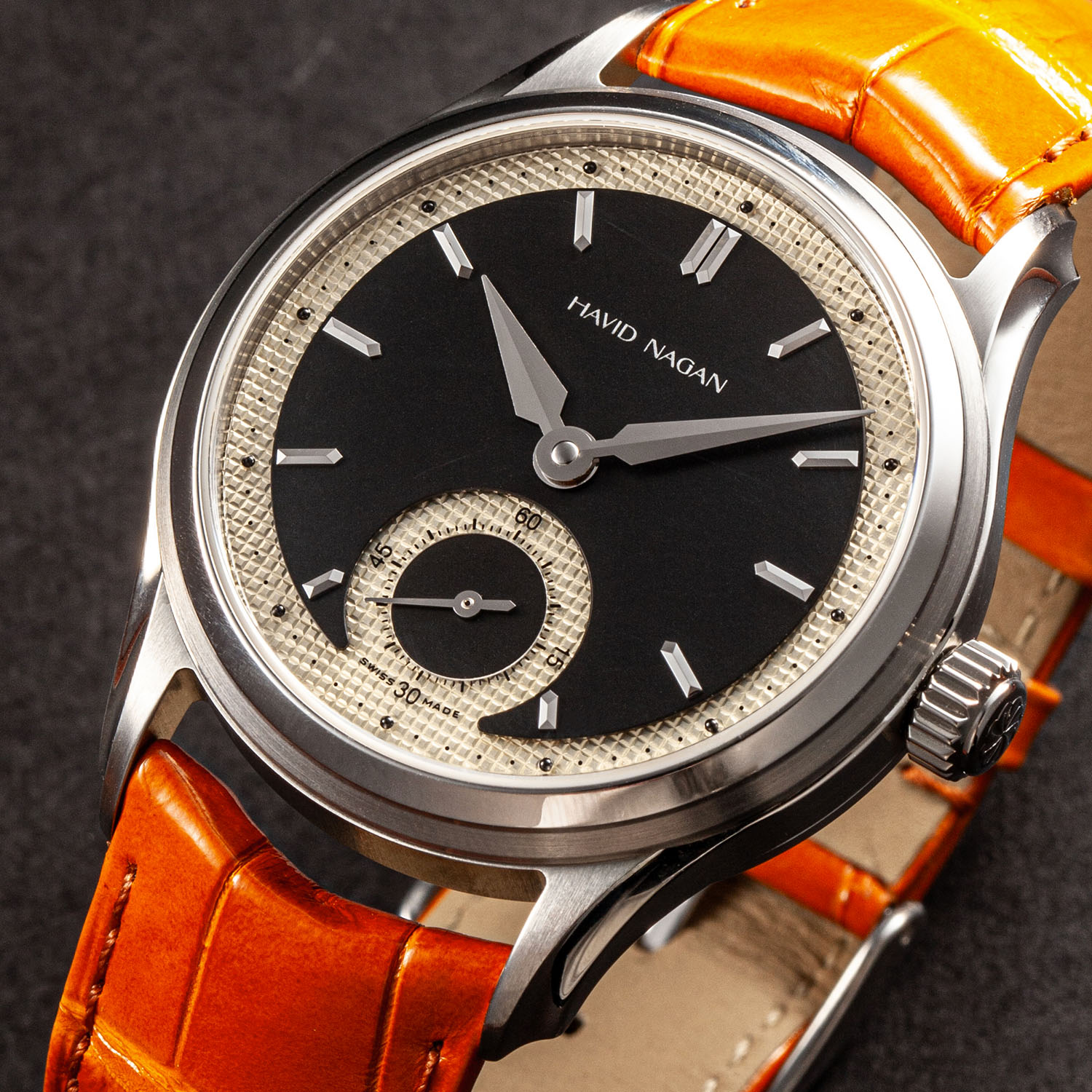 The Havid Nagan Classic One is available in two versions: ebony with a black central area, an ivory guilloché-like section and a silver logo and small seconds hand or ivory with an off-white, slightly vintage central sector, a varnished ruthenium underlying textured area and orange accents on the logo and sub-seconds hand.