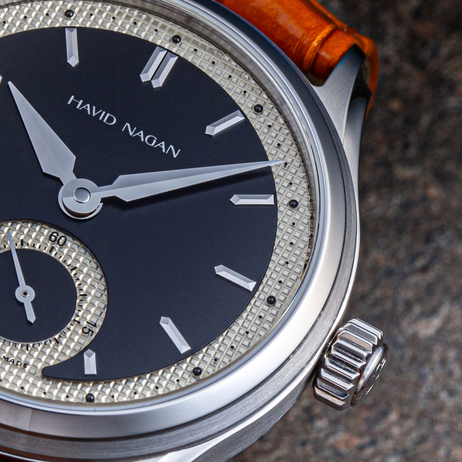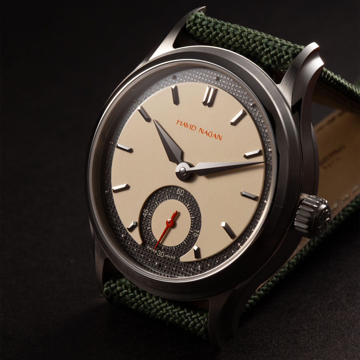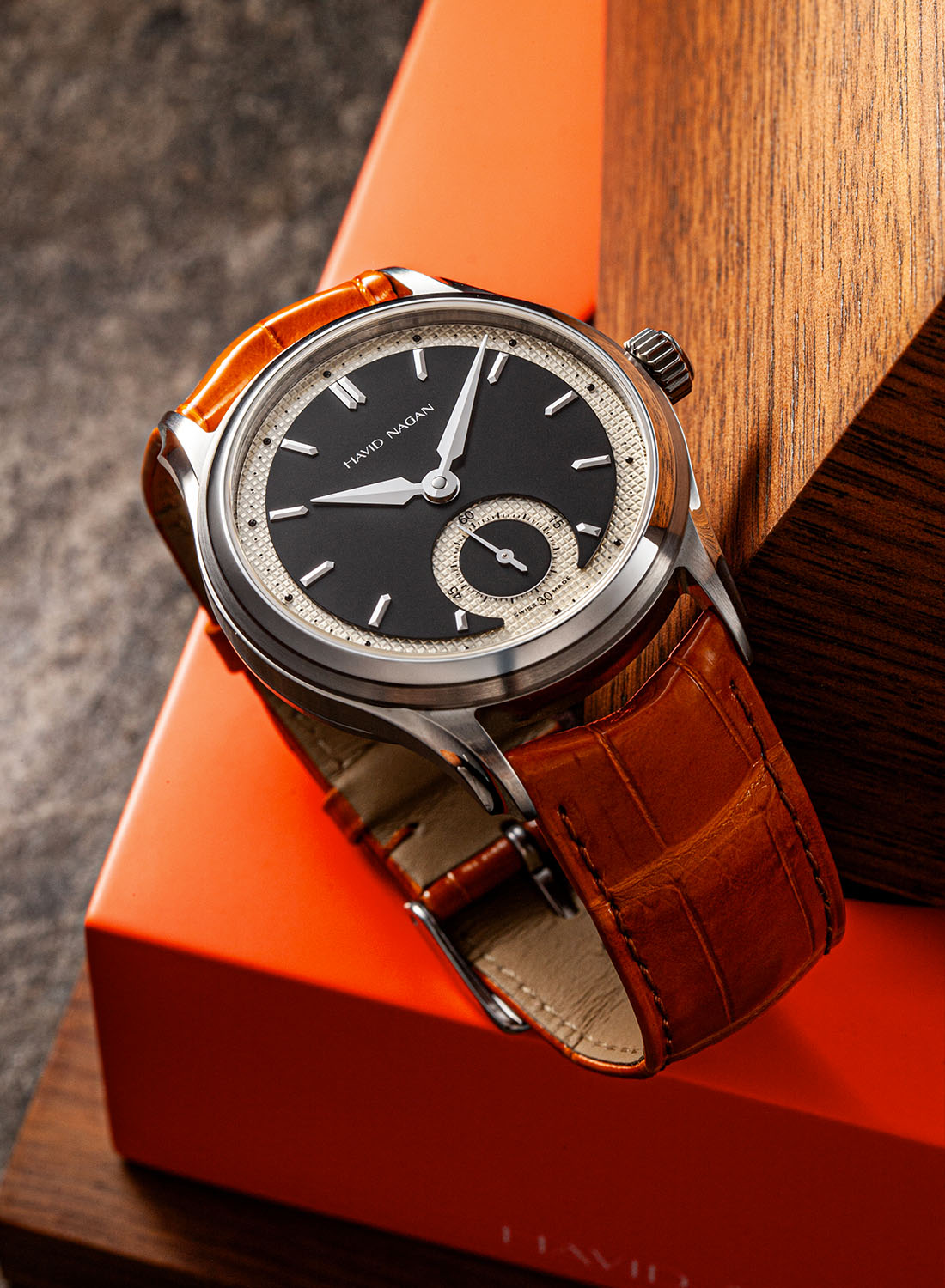 The Havid Nagan Classic One is available in two versions: ebony with a black central area, an ivory guilloché-like section and a silver logo and small seconds hand or ivory with an off-white, slightly vintage central sector, a varnished ruthenium underlying textured area and orange accents on the logo and sub-seconds hand.