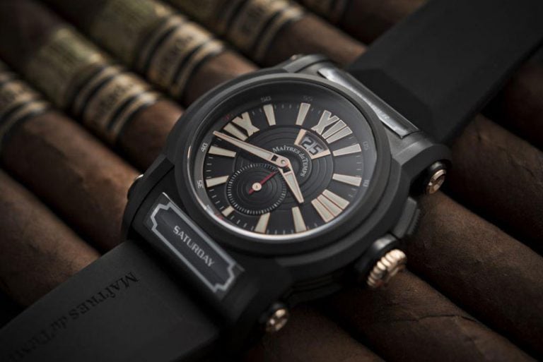 Both the black and blue dials are galvanised, and the oceans of the map are laser-engraved and then lacquered. The meridians and parallels, in either charcoal grey or blue, are transferred, and the city ring is sandblasted in the black model and satin-brushed in the blue model. Elevated above the map, the mobile sub-dial for local time on the black model is sandblasted with a black gold lacquered gradient rim with silver-toned powdered Arabic numerals and black gold hands treated with Super-LumiNova. The blue sub-dial is lacquered and also has a gradient rim with rhodium-plated hands coated with Super-LumiNova.
