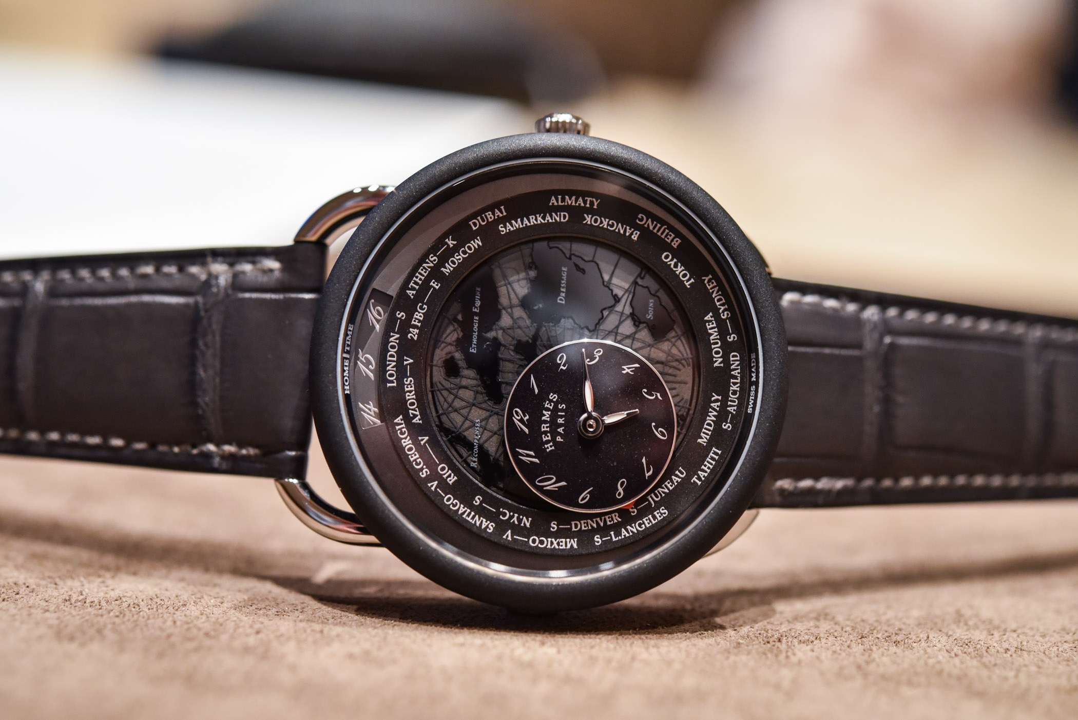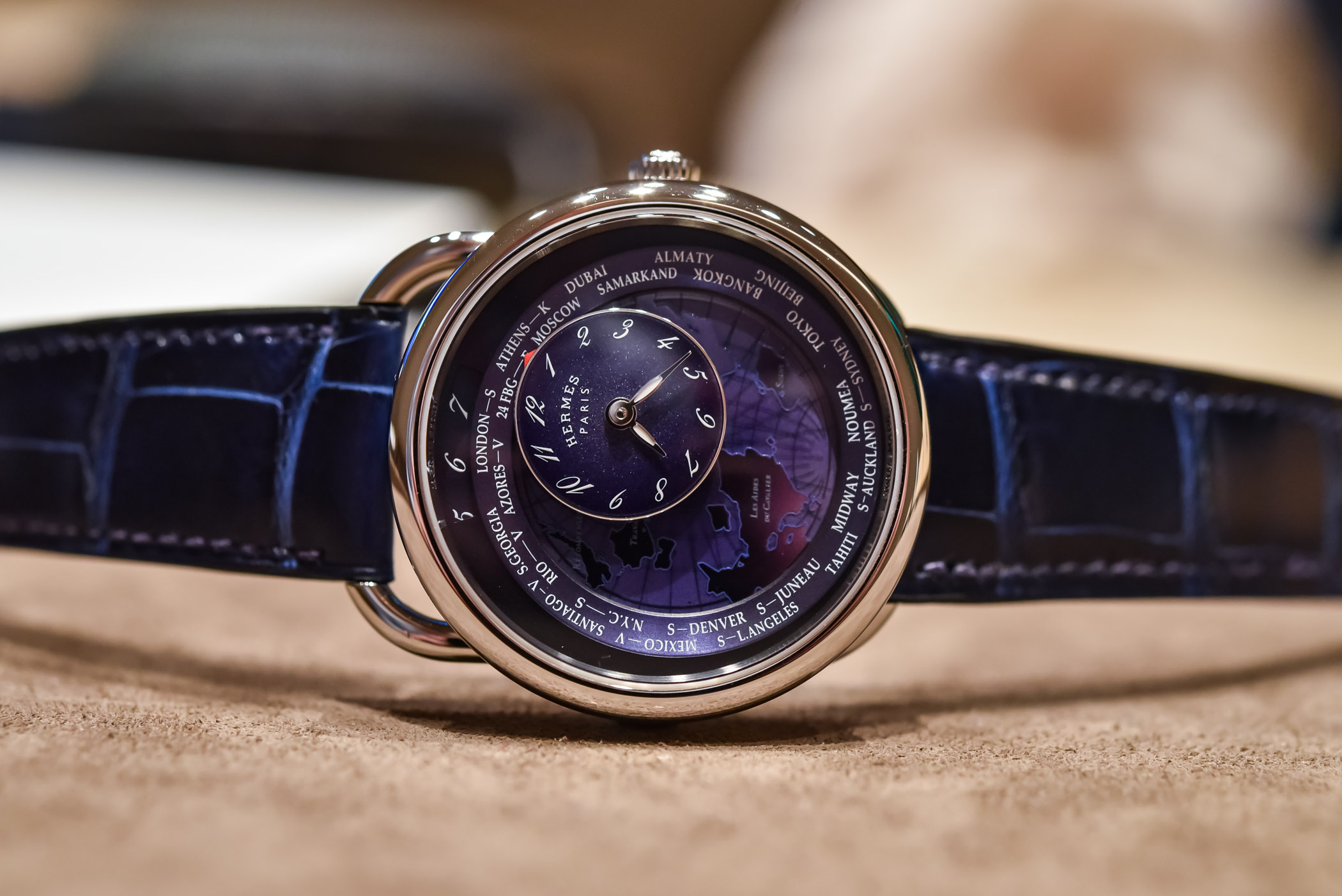 The travelling time module was developed exclusively for Hermès by Jean-François Mojon of Chronode, a specialist in complications. Three years in the making, the 122-component module with a height of just 4.4mm lets the sub-dial glide over the imaginary map without ever losing its upright orientation.
