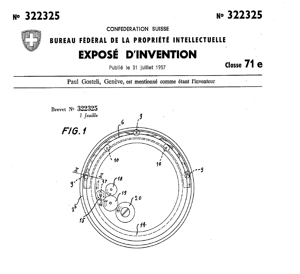 Another solution to craft ultra-thin watches was designed at the same time, with the first peripheral rotor movements. A patent applied in June 1955 by Paul Gosteli of Geneva (Swiss patent N° 322325 pictured below, filed on June 6th 1955, published on July 31st 1957) describing an original winding system for watches “characterized by an annular segment located around the movement cage”. Some 10 years later, Patek Philippe also applied for a patent for a self-winding watch movement (Swiss patent N° 548213, filed on June 15th 1965, published on February 29th 1968) with “a winding mass in the form of an annular segment… the mass and its associated gearing are disposed peripherally of the movement”. The brand would consequently manufacture the calibre 350. Among the various technical challenges, a traditional stem and crown could not be used because of the oscillating weight rotating at the periphery. Thus, the crown had to be mounted on the caseback side.