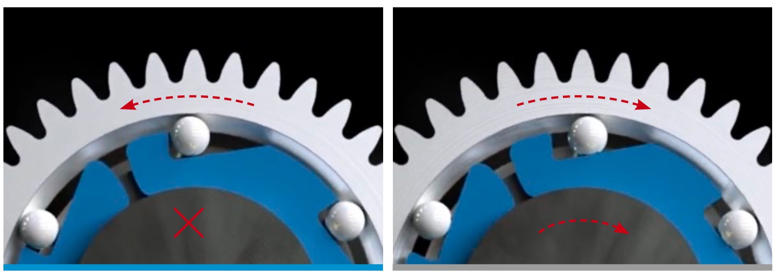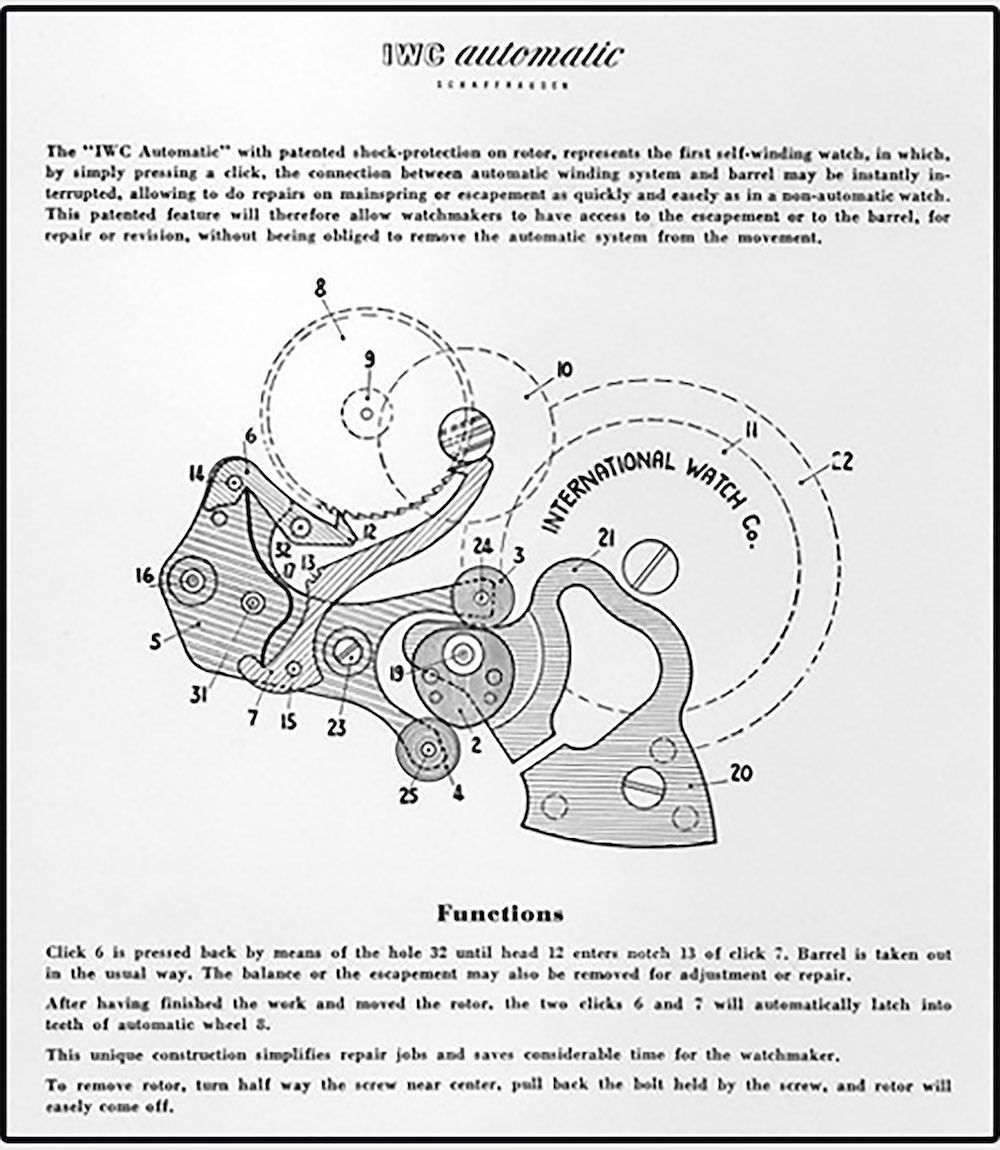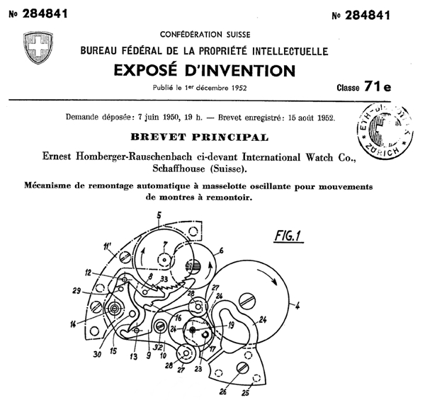 At IWC, Albert Pellaton developed an original solution patented in 1950. Instead of putting a ball bearing or cog at the centre of the rotor, he used a heart-shaped, eccentrically bearing-mounted cam. The latter converts the bidirectional rotor’s revolutions into the to-and-fro movements of a rocking bar. The bar’s rocking movements are then transmitted to the winding wheel by two pawls: while one of them pulls the wheel (i.e. winds it), the other glides smoothly over the top of it until the roles are reversed. In 1959, Seiko developed another pawl winding concept with the Magic Lever.