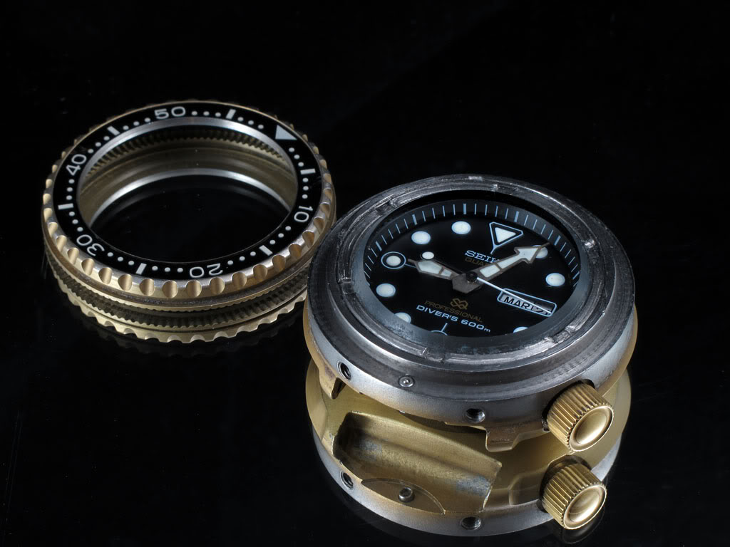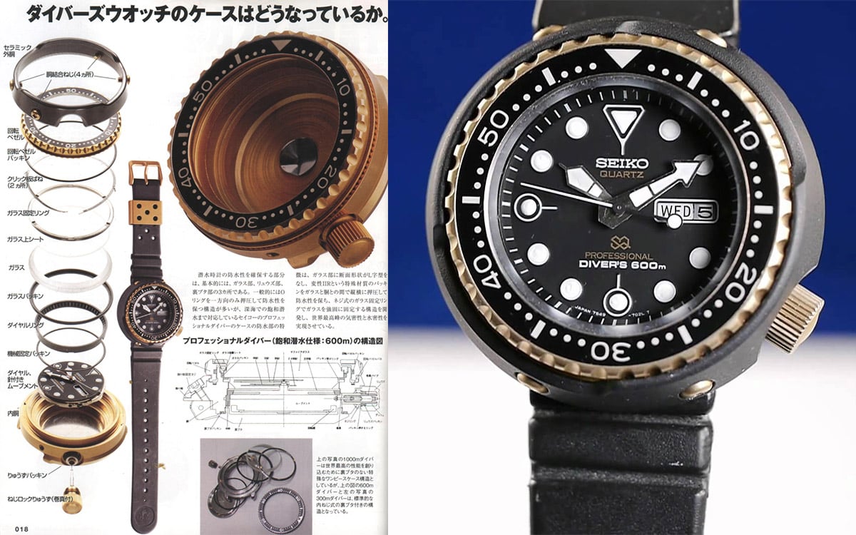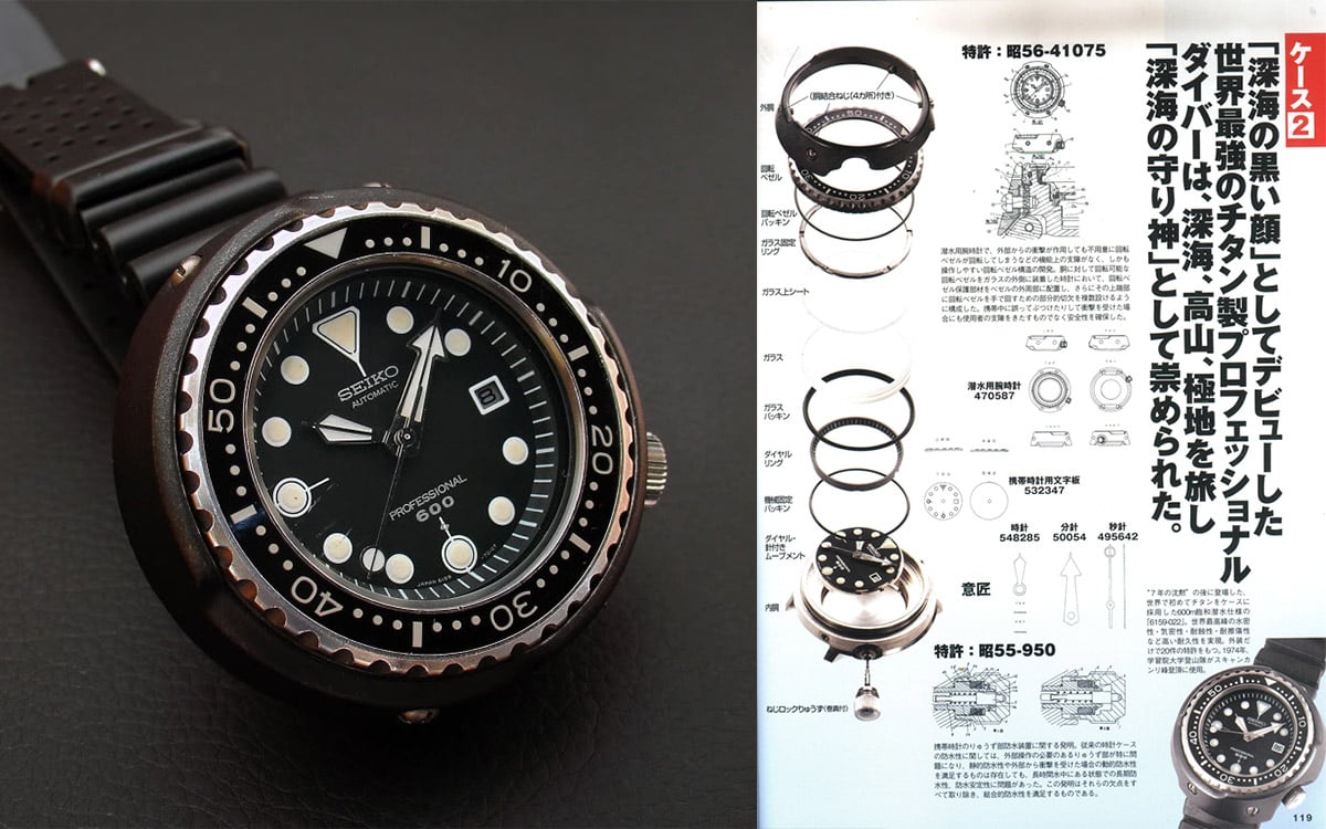 At that time, Rolex (with the Submariner and later the Sea-Dweller), Doxa and Omega (with the Ploprof – the watch and its development are explained in detail here) were the first to work on the Helium Gas problem, that divers faced during their saturation dives (Please hold for a future article on that). The same issue dealt from Seiko on a different level. They decided to make clean slate of the past and to design something new, following here different technical solutions, compared to Rolex for example. As Mr. Tokunaga states, “… using the special gasket of L type and one-piece case became the conclusive factor in the He-tightness. As the result of the experiment, the penetration of helium gas is suppressed by about 1/100 to the conventional watch case, the inner pressure of the case does not turn into high pressure and the diver’s watch of the ideal saturation diving specification which does not need “helium gas escape valve” is completed.” However, Mr. Tokunaga’s team didn’t stop there. The first Tuna (600m) they created in 1975 (ref. 6159-7010) had a high-end / high-frequency automatic caliber beating at 10 Hz / 36,000 bph. This Seiko Tuna first edition was a watch (or should we say instrument) that was the result of more than 20 patents and world’s firsts – like the titanium monocoque case, the ceramic protective shroud, the L shaped gasket we mentioned earlier, the vented strap and many more. At 89,000 yen, it was not cheap either but it was a groundbreaking product, with some features becoming later industry’s standard.