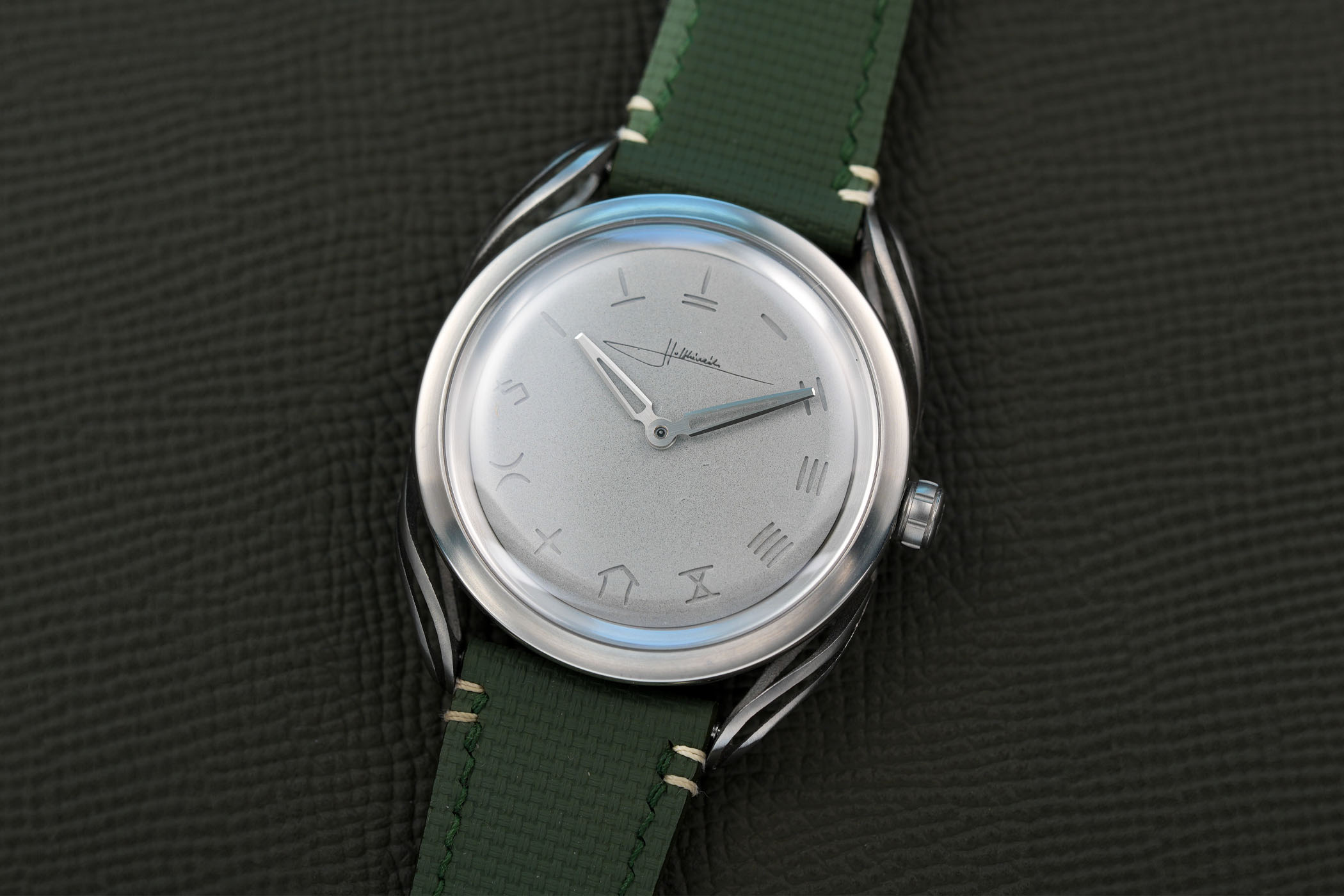 Based in Hong Kong, The Horology Club wanted a watch that captured the city’s urban energy. Like many skyscrapers made from reinforced concrete that grace Hong Kong’s skyline, Holthinrichs settled on a concrete dial. To hint at the twinkling night lights of Hong Kong, the concrete is infused with luminescent material, the first of its kind. In the dark, the entire dial emits a grainy greenish glow.