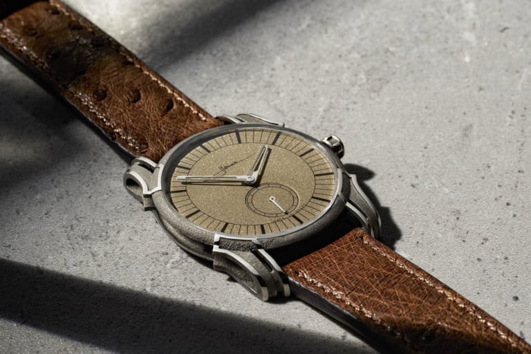 Six years ago, Robin wrote about Michiel Holthinrichs, an up-and-coming young Dutch architect-turned-watchmaker using 3D printing techniques to create his cases. The result, with its raw industrial finish, can be appreciated on Holthinrich’s second watch with its grainy concrete textures, although other cases were partially polished and hand-finished for a more refined look. Given the expense of producing 3D-printed cases, Holthinrichs launched a new entry-level collection, the Signature Series. Flaunting a new case design in titanium with sculptural lugs, the Signature Series was chosen by The Horology Club for its first collaboration watch with Holthinrichs. Known as the Signature Ornament ‘Concrete Jungle’, the watch takes inspiration from Hong Kong’s urban skyline and incorporates Holthinrichs’ modernist design leanings inspired by Le Corbusier’s Béton Brut (raw concrete). Getting even closer to the raw materials that inspire his watches, the Concrete Jungle features a concrete dial carved with mysterious hieroglyphs.