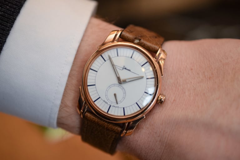 The reverse side of the case reveals the unique Art Nouveau-inspired rose gold-plated rotor, which resembles stylised sunbeams. With a personalised rotor, the thin automatic Sellita SW-300 beats at 4Hz and delivers a 50-hour power reserve. Like all previous editions of the Signature Series, it was a deliberate choice to keep the costs under control.