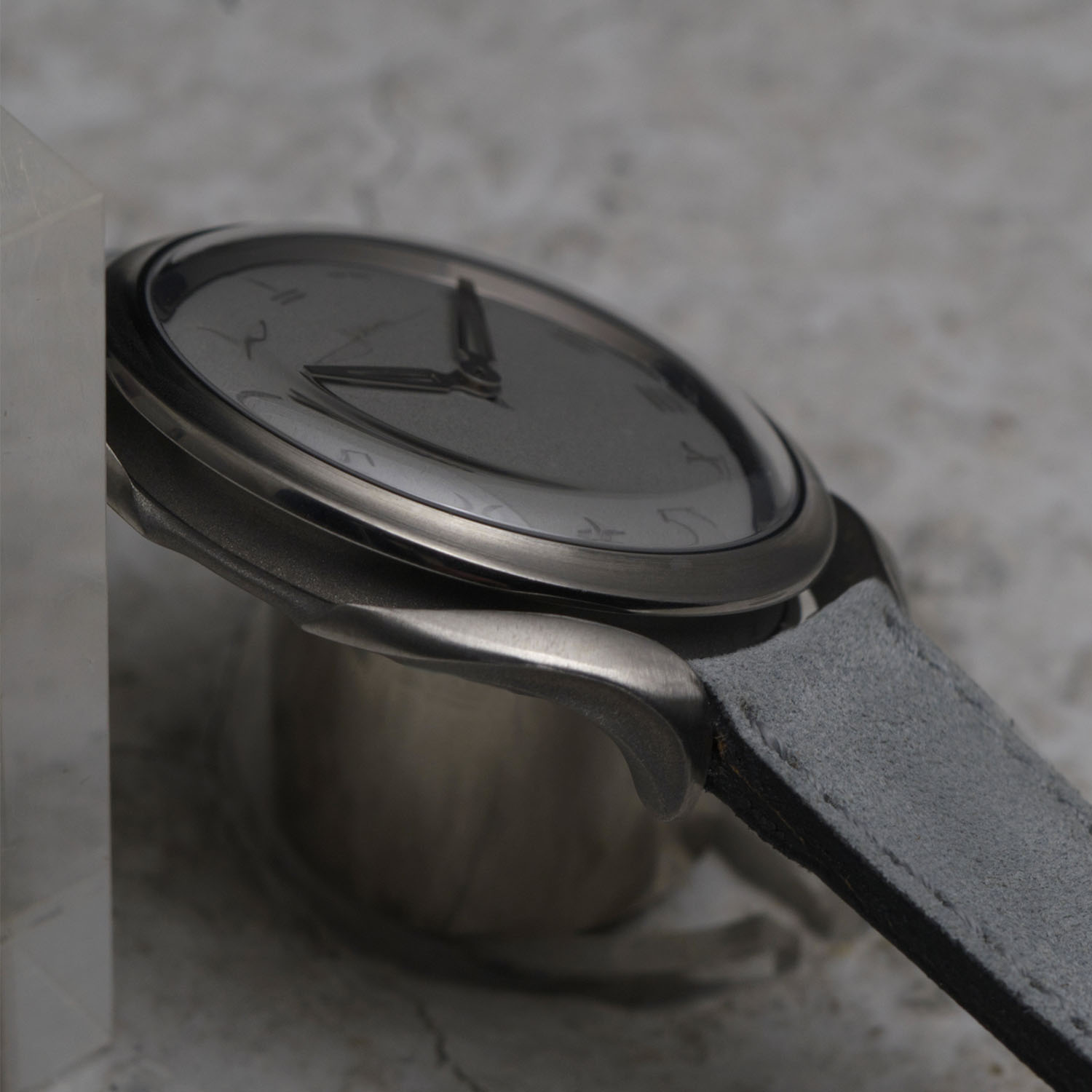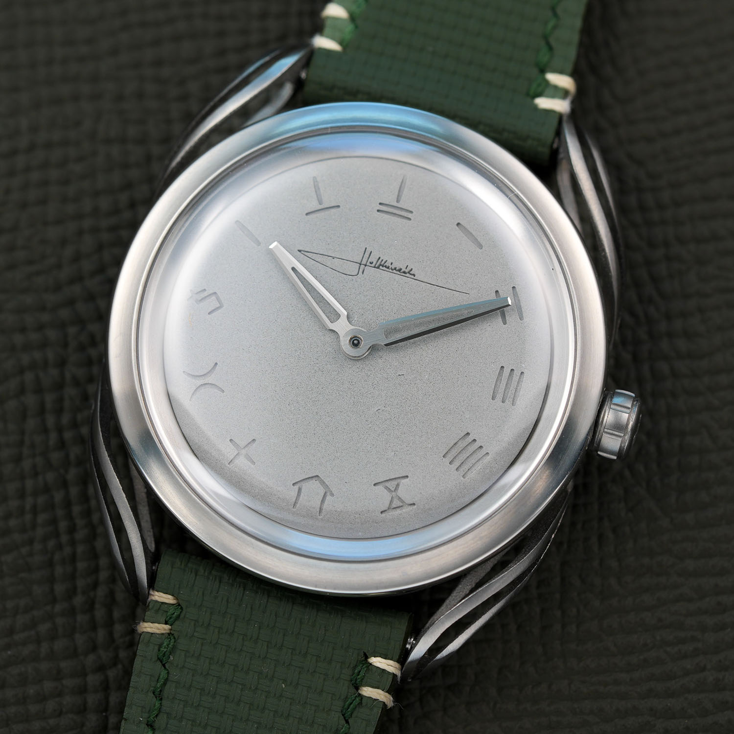Another nod to Chinese tradition can be found on the concrete dial. Instead of numerals, the dial features numeric indices in oracle bone script, the oldest form of Chinese writing dating to the 2nd millennium BC. While they appear to be carved into the concrete, they are created using a moulding process. The hands are openworked, and Holthinrichs’ signature appears at noon.