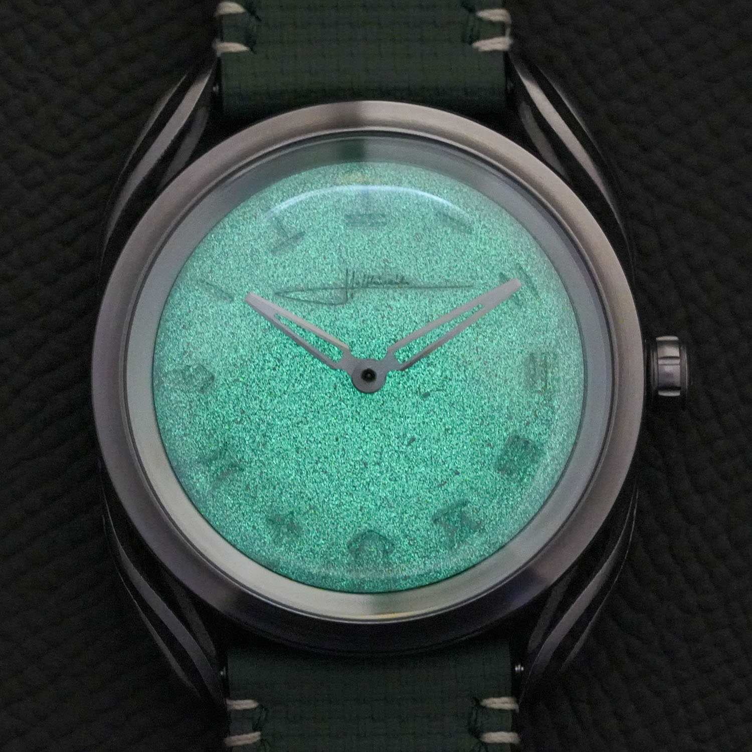 Based in Hong Kong, The Horology Club wanted a watch that captured the city’s urban energy. Like many skyscrapers made from reinforced concrete that grace Hong Kong’s skyline, Holthinrichs settled on a concrete dial. To hint at the twinkling night lights of Hong Kong, the concrete is infused with luminescent material, the first of its kind. In the dark, the entire dial emits a grainy greenish glow.