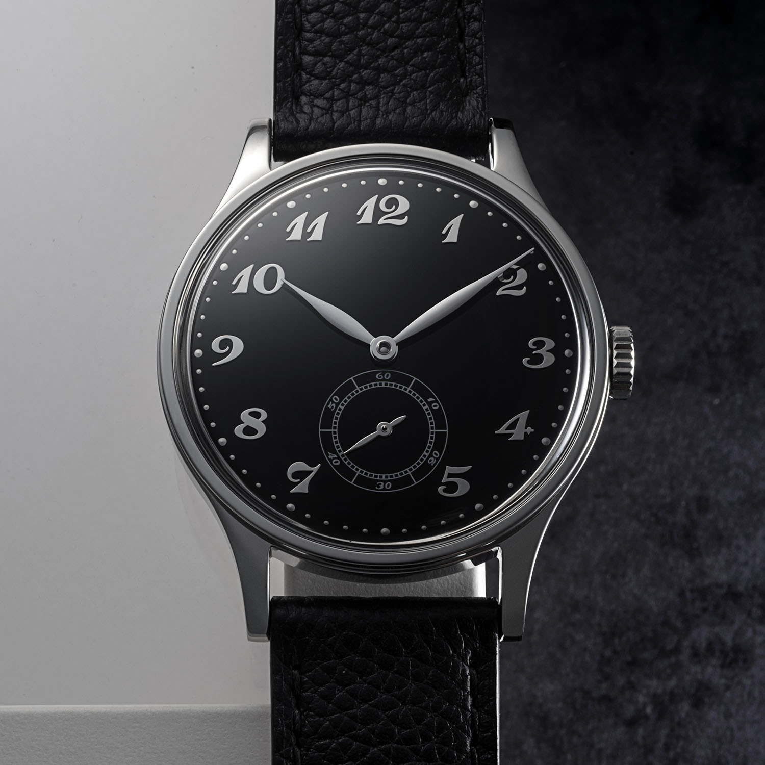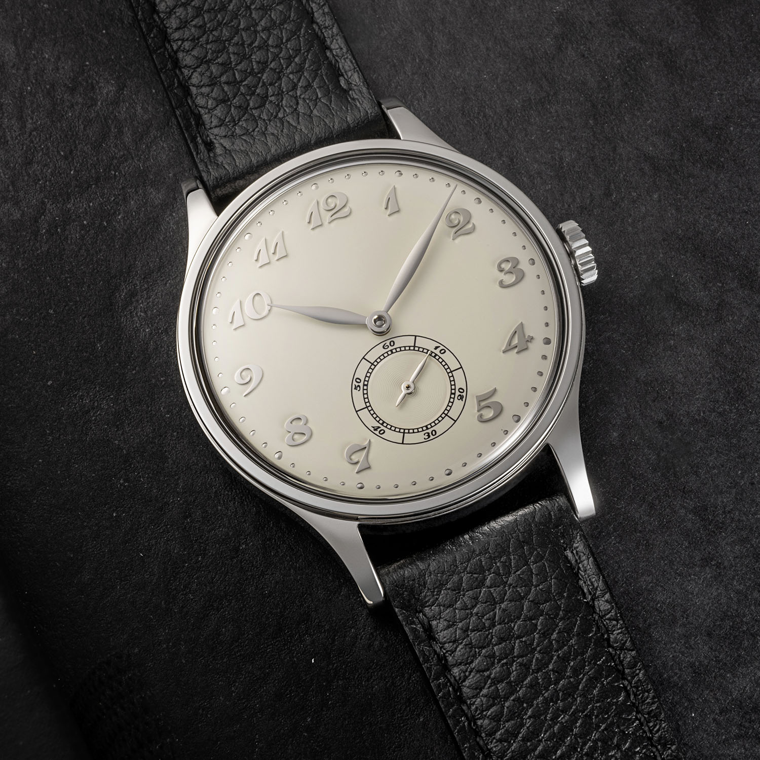 The 1930s inspiration continues on the dial, which has been left void of any logo or brand name. A deliberate choice explained by the wish to deliver “a watch solely because of what it is, and paying for what the watch offers exactly, not for what the label on the dial says.” Fair enough. The dial of the Horologically Unique HU-01 is offered in two variants, both great classics: glossy black and vintage white with a creamy hue. The dial of the white one has a recessed and snailed small seconds counter, while the black one is smooth. On both, there are classic Breguet-style, polished applied numerals and leaf-shaped hands, a railroad seconds track and a pearl-like minute track on the periphery. Again, it’s not reinventing the wheel and feels highly familiar, but it sure looks good.