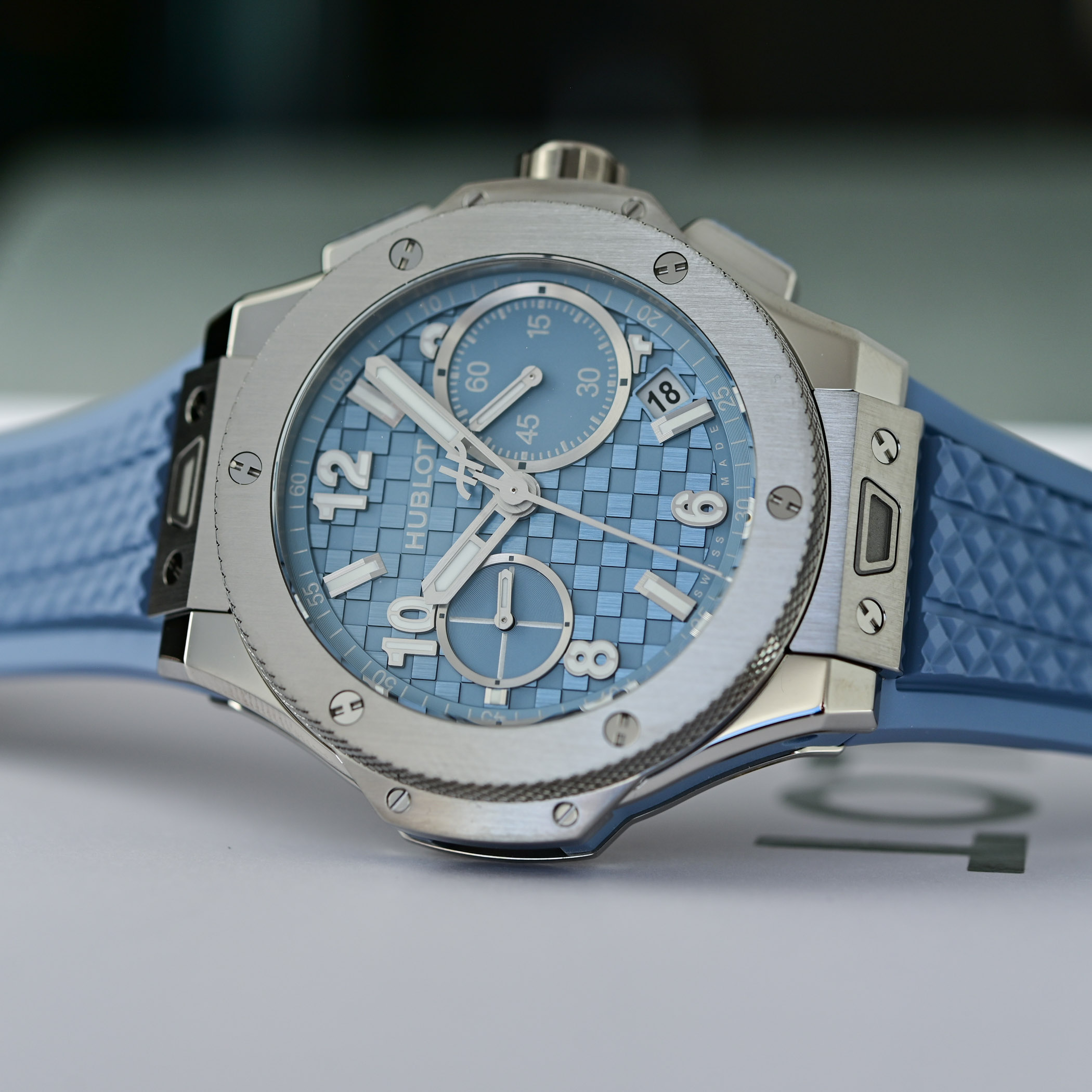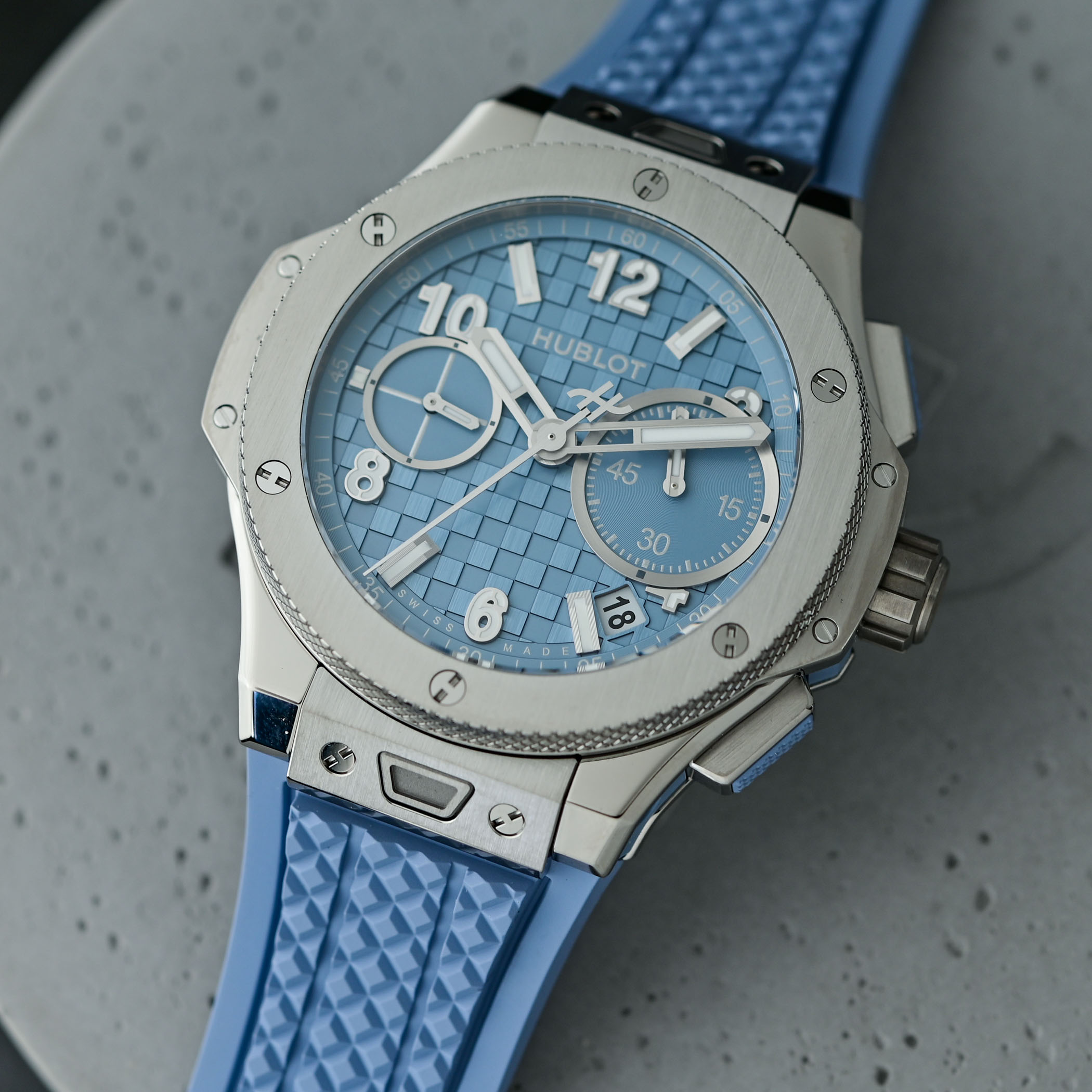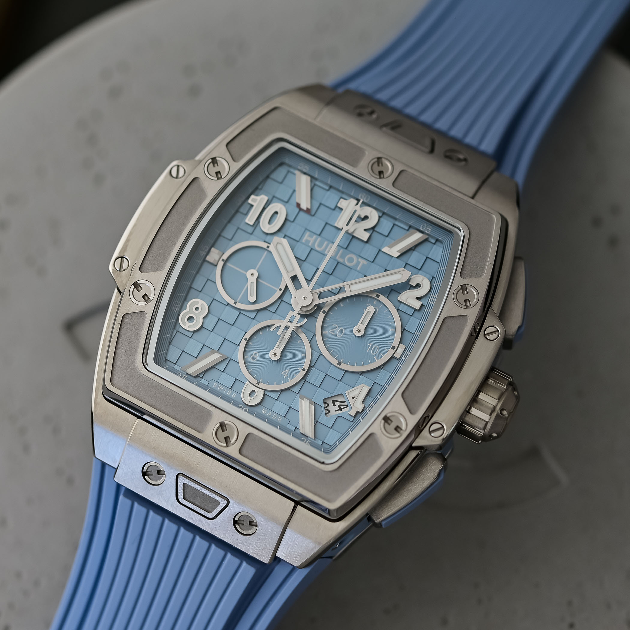 The new Coal Blue series includes four references across the Big Bang and Spirit of Big Bang lines: two titanium chronographs, the Big Bang Original Unico 43mm and Spirit of Big Bang 42mm, and two diamond-set steel models, the Big Bang One Click 33mm and Spirit of Big Bang 32mm, each dressed in this cool, contemporary hue.